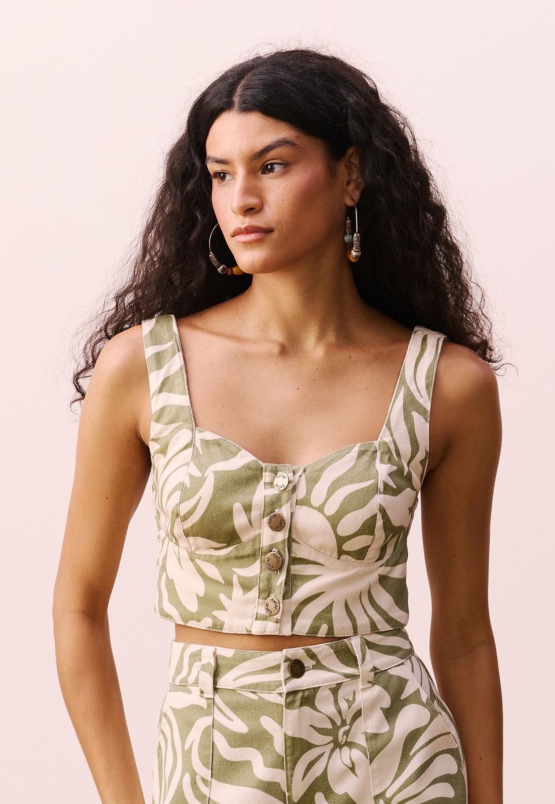 O Cropped Sarja Estampado Pedra do Sol CaCay é a escolha perfeita para quem busca estilo com personalidade e conforto. Com alças largas e decote quadrado, seu design estruturado em sarja 100% algodão garante caimento firme e elegante, valorizando a silhueta sem abrir mão da leveza. Os botões frontais decorativos adicionam um toque de charme artesanal, enquanto o corte reto nas costas mantém a sofisticação atemporal da peça. Ideal para quem procura um cropped que se adapta bem ao corpo e oferece liberdade de movimento, sem marcar ou incomodar.