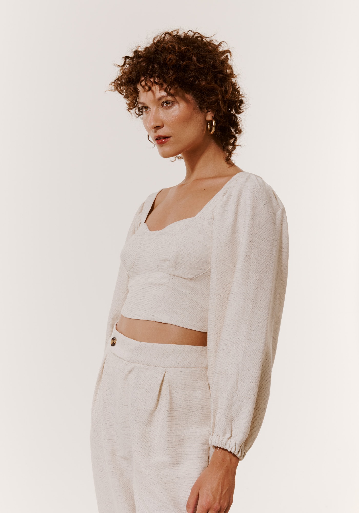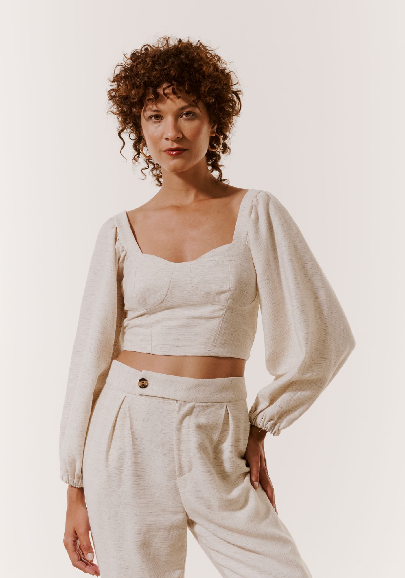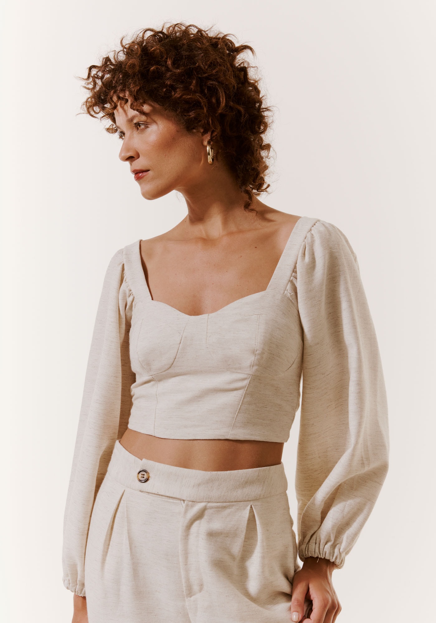O cropped é um modelo versátil que pode ser usado em diferentesocasiões e combinações. Possui uma modelagem ajustada ao corpo e decote com oformato do busto, valorizando o colo. A manga longa bufante com elástico dá umtoque romântico à peça e pode ser ajustada de acordo com a preferência.