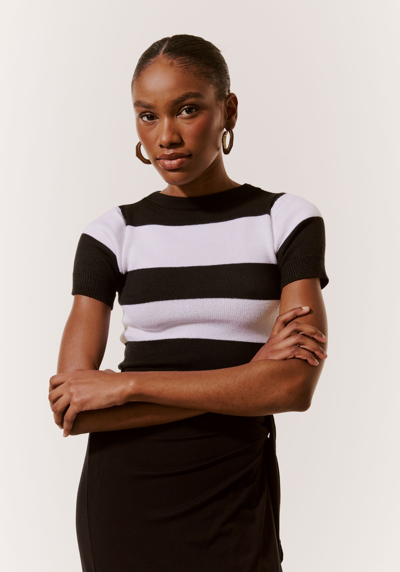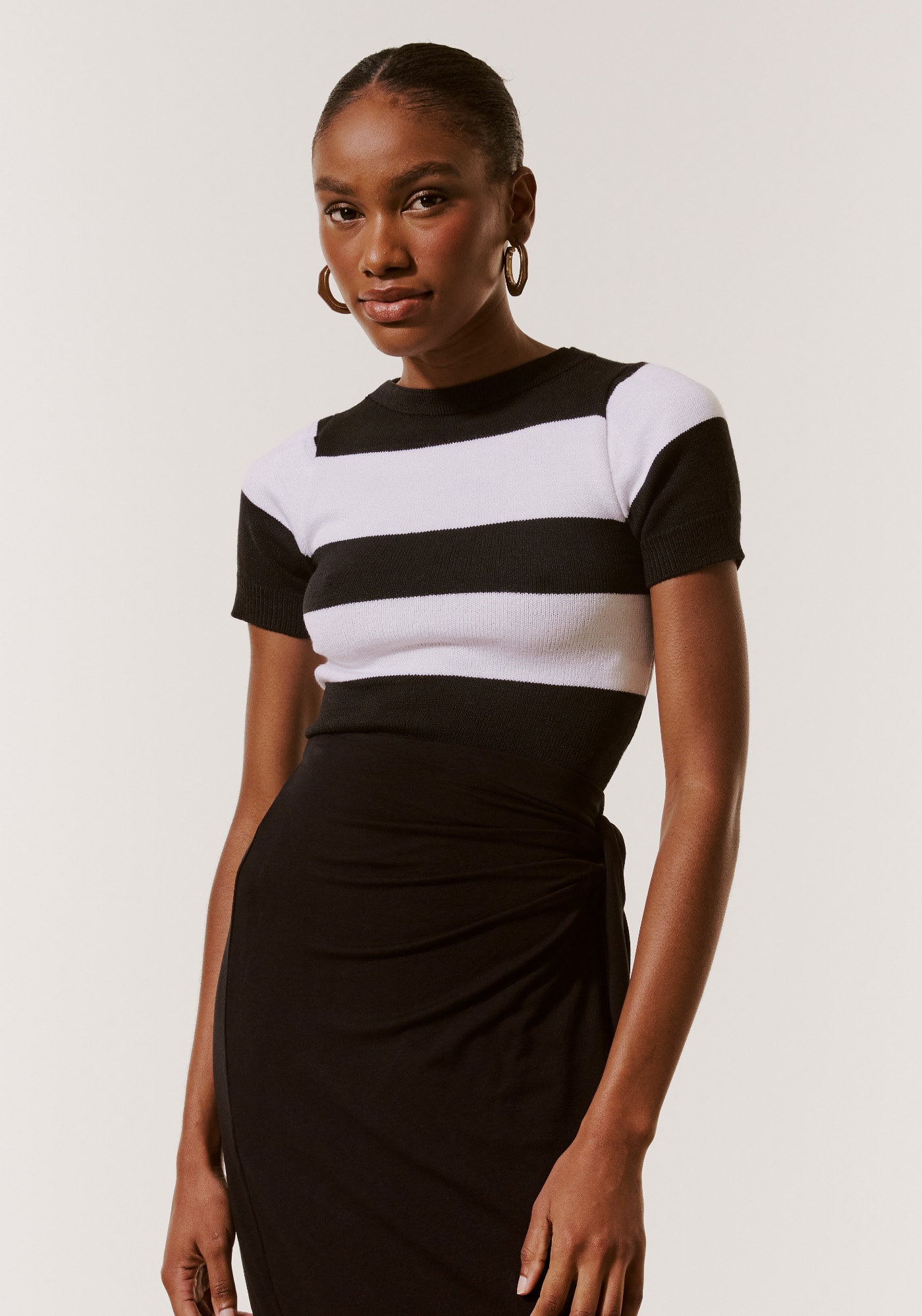 Confeccionado, em tricot, a blusa possuimodelagem ajustada ao corpo com manga curta e decote redondo.