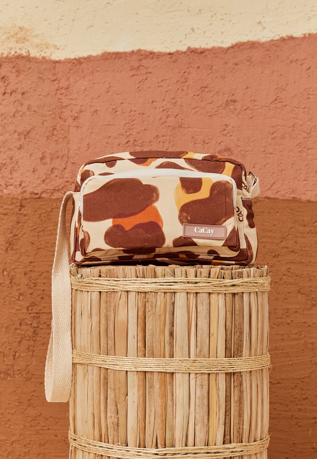 A bag crossbody estampada Sami é confeccionada em sarja 100% algodão. A estampa é um animal print moderno e estiloso. O acessório possui um compartimento maior e um bolso naparte da frente, ambos com fechamento em zíper. O modelo possui uma alça longa, que possibilita que a bolsa seja carregada lateralmente ou cruzada.