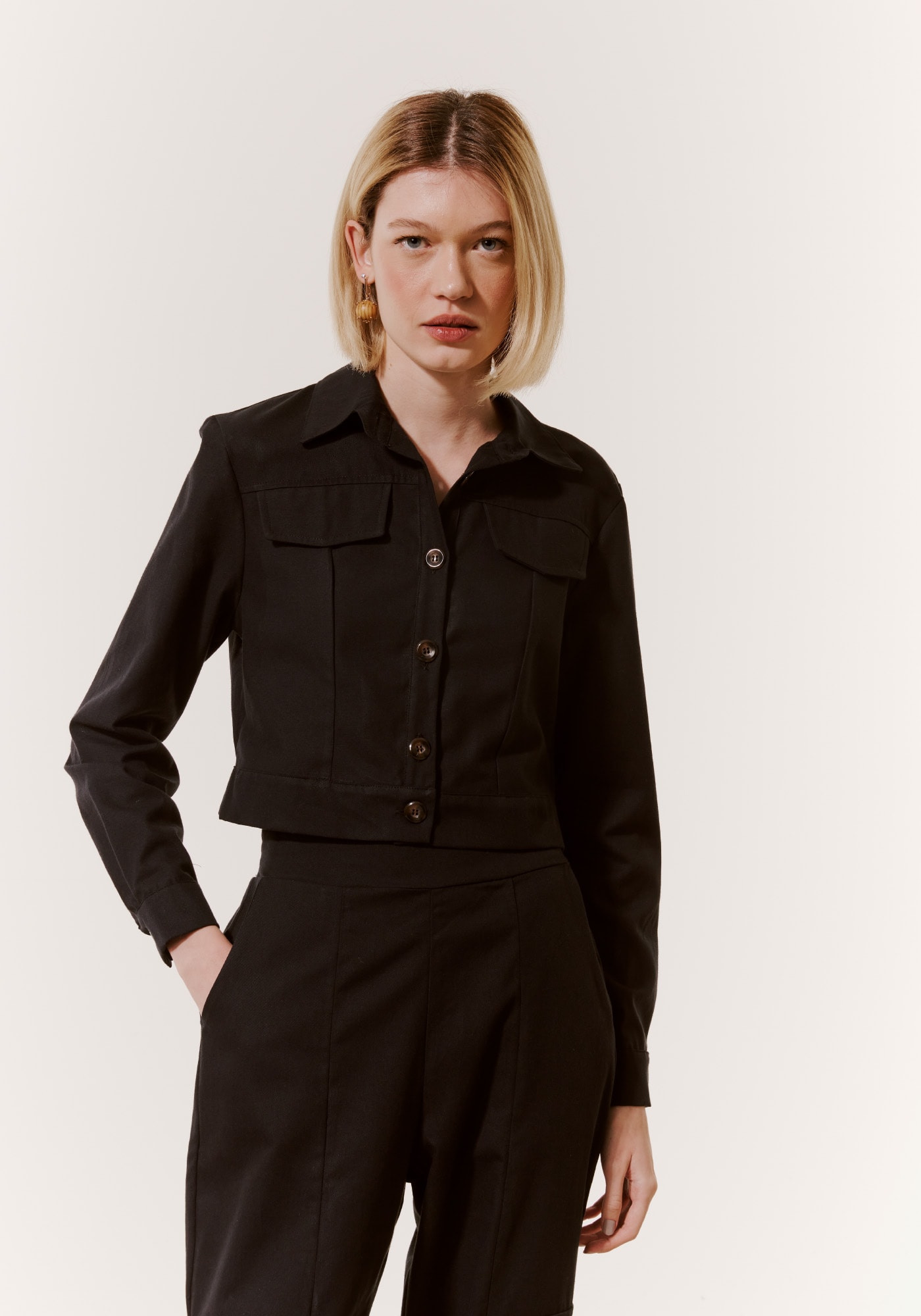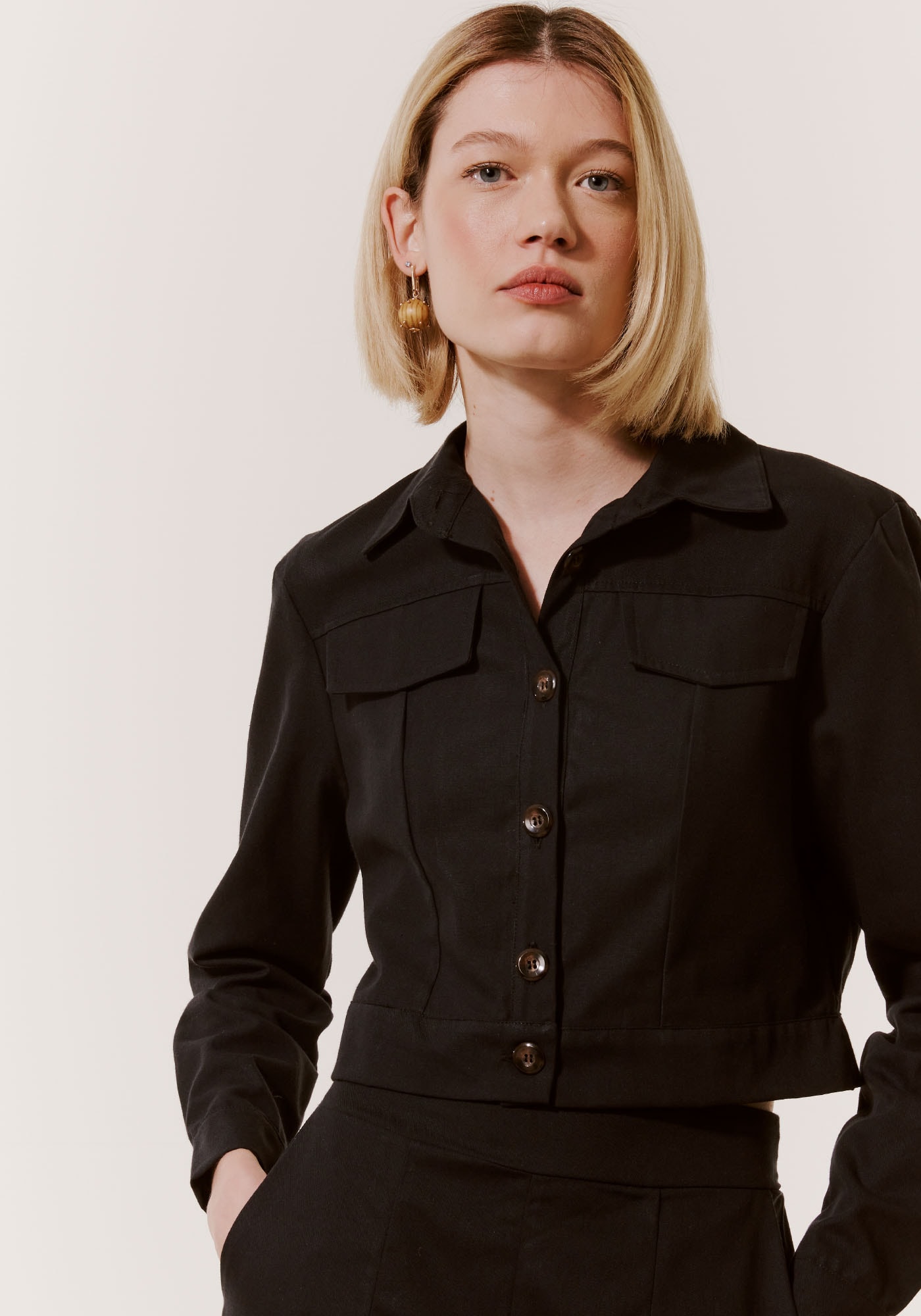 Confeccionado em tecido 100% algodão, a modelagem é cropped comabotoamento frontal. O bolso falso dá um charme a mais para peça.