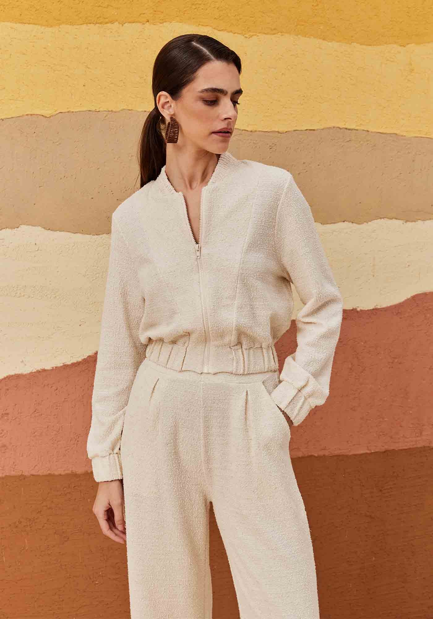 Confeccionada em tweed 54% algodão, 24% viscose, 15% poliéster 6% linho e 1% elastano, a jaquetamodelo cropped possui fechamento em zíper na parte da frente e elástico. Éversátil e quentinho, sendo o complemento perfeito para qualquer ocasião.