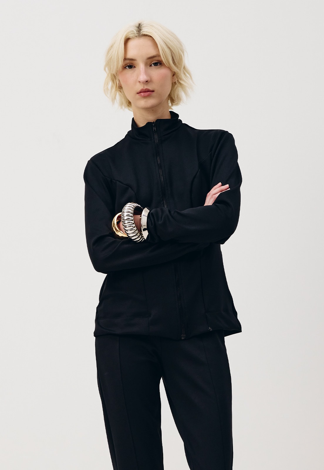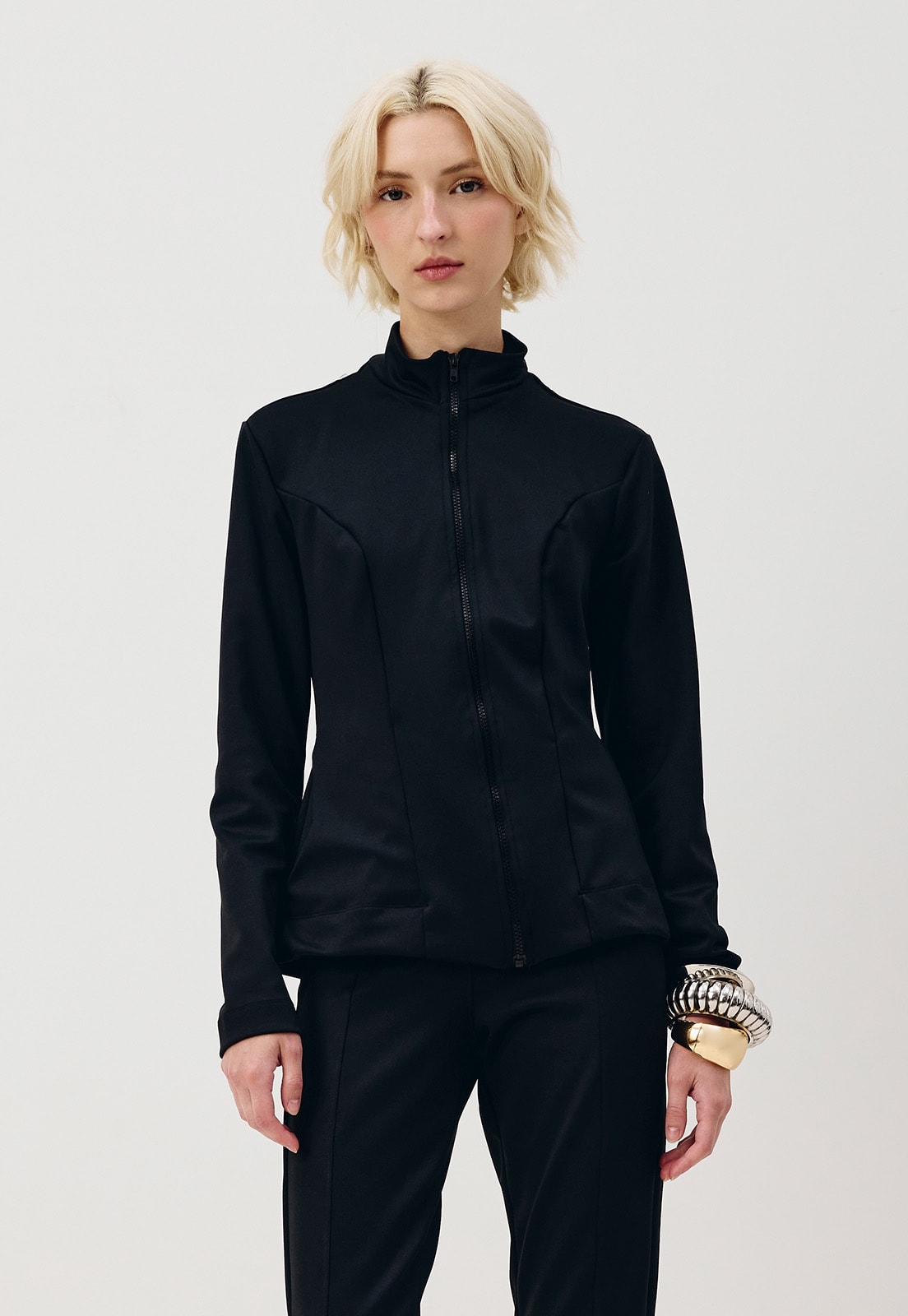 A jaqueta é confeccionada em tecido neoprene 94% poliéster 6% elastano. O modelo é despojado e possui gola alta com fechamento em zíper na parte da frente.
