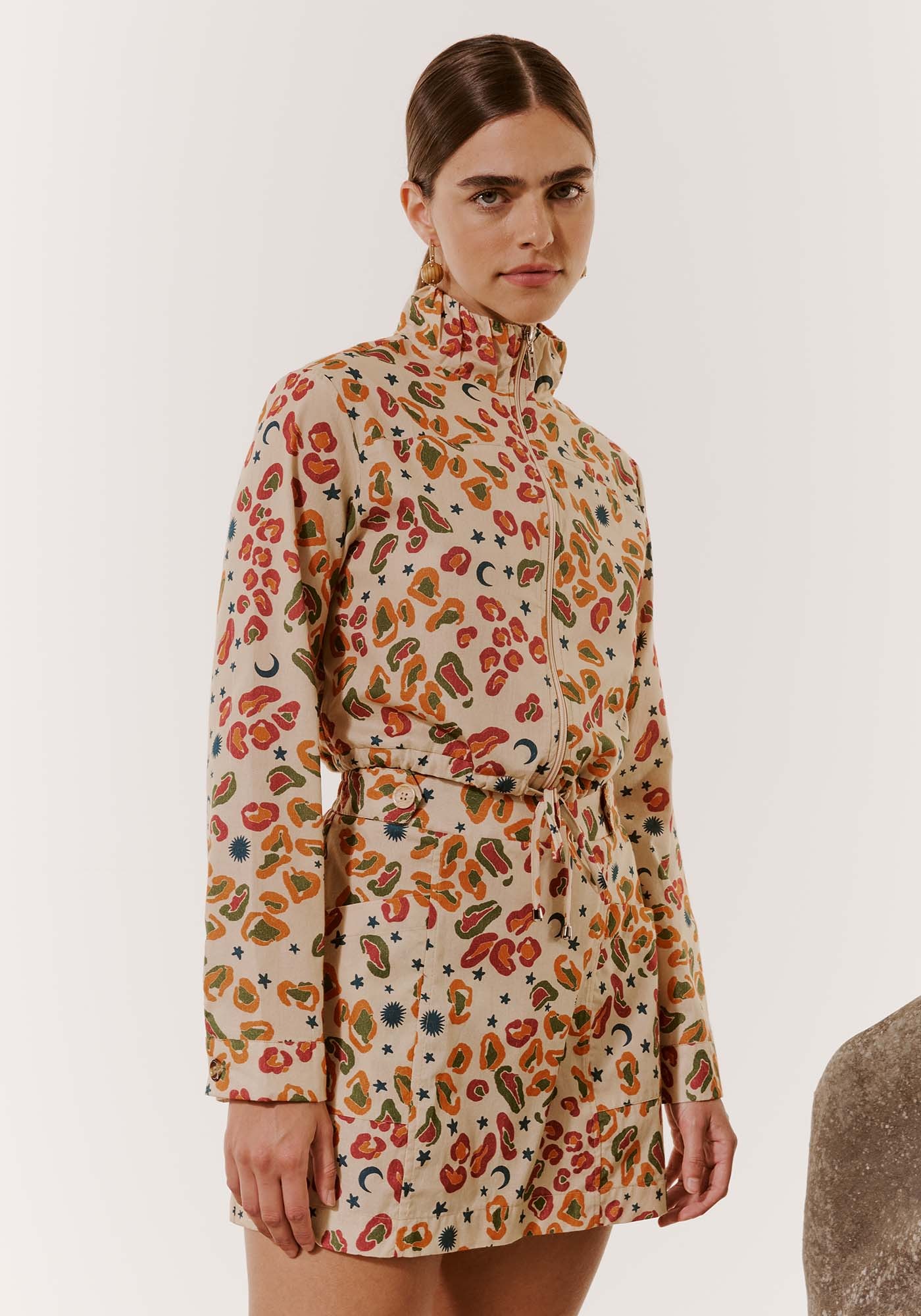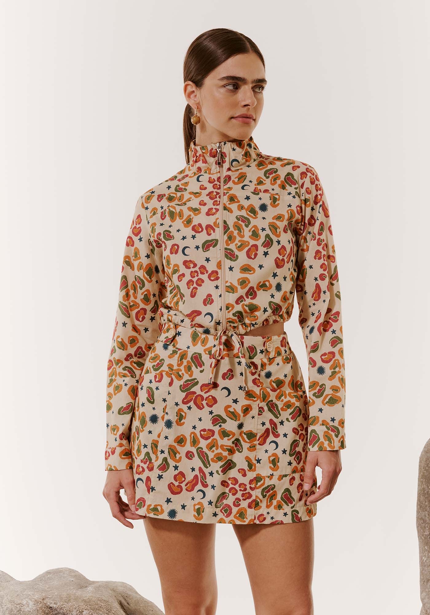 A jaqueta estampada é uma peçaapaixonante. Confeccionada em tecido 100% algodão, contém comprimento cropped epossui fechamento com zíper frontal e gola. A estampa Onça Pintada,simultaneamente divertida e única, eleva a peça a um patamar de destaqueinconfundível, oferecendo um visual que é ao mesmo tempo sofisticado eoriginal.