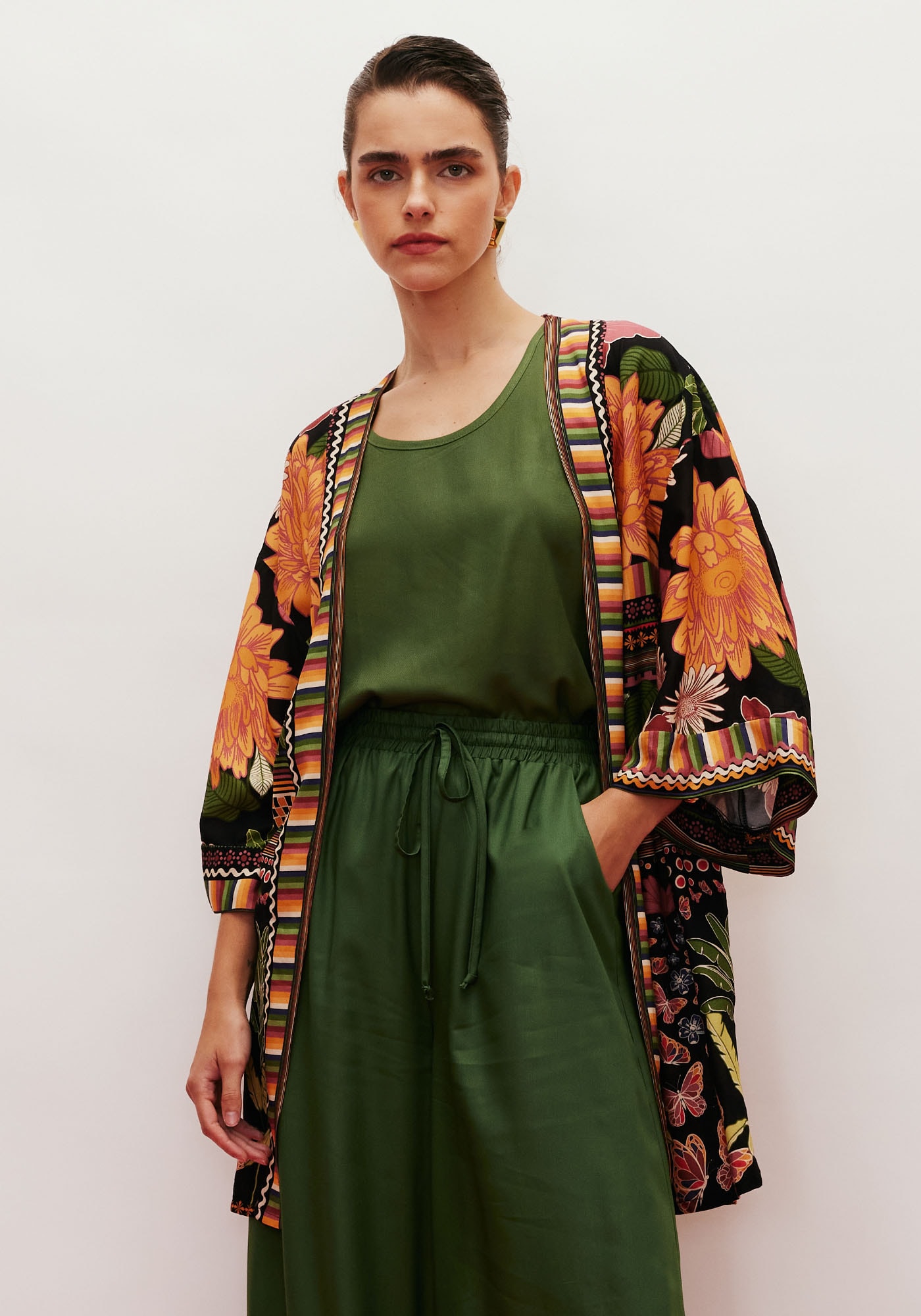 Confeccionado em tecido 100% viscose,o kimono é uma peça super interessante para compor o look. O modelo alongadopossui estampa barrada e mangas amplas, trazendo fluidez para a peça.