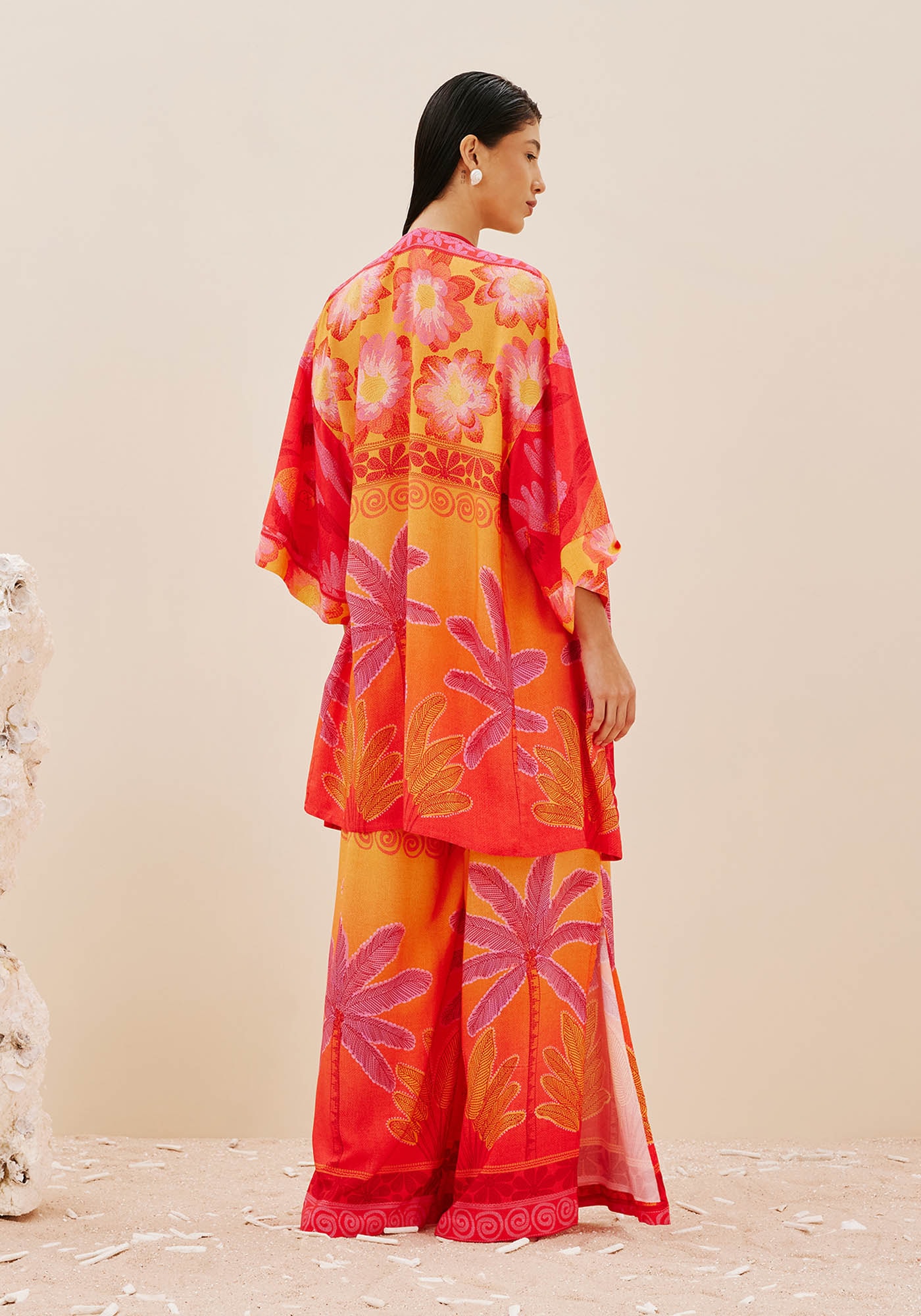 Este Kimono é um modelo único e cheio de personalidade que se destaca pela deslumbrante estampa Praia das Bordadeiras em tons vibrantes de rosa e laranja. Seu design é de de comprimento alongado e mangas amplas que conferem movimento e leveza ao seu visual. Confeccionado em tecido de composição !00% Viscose, é a peça ideal para compor looks despojados e com muito estilo.
