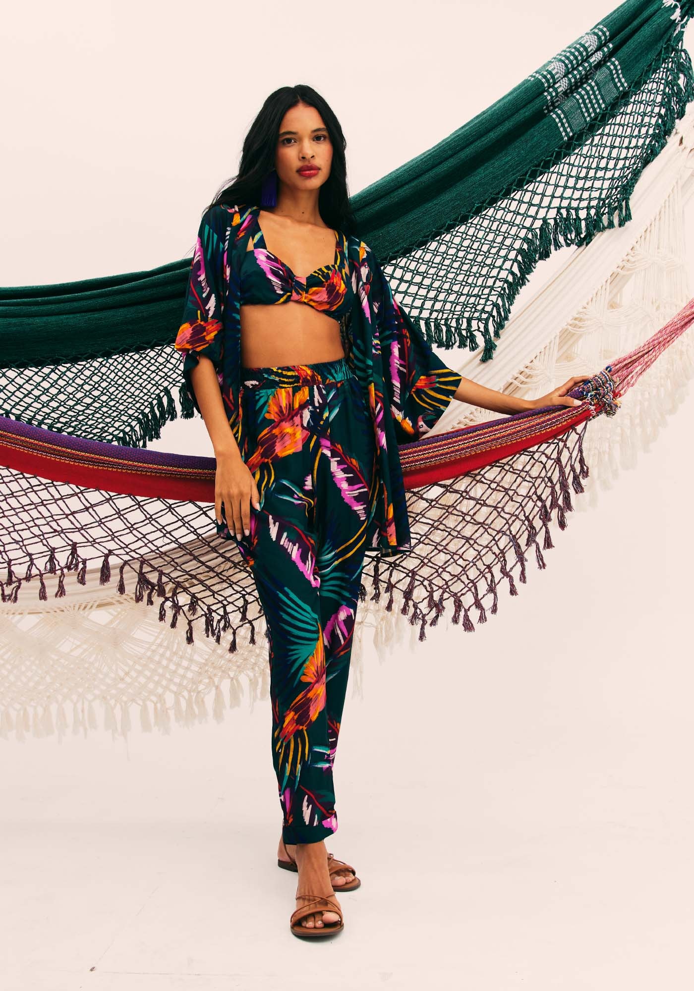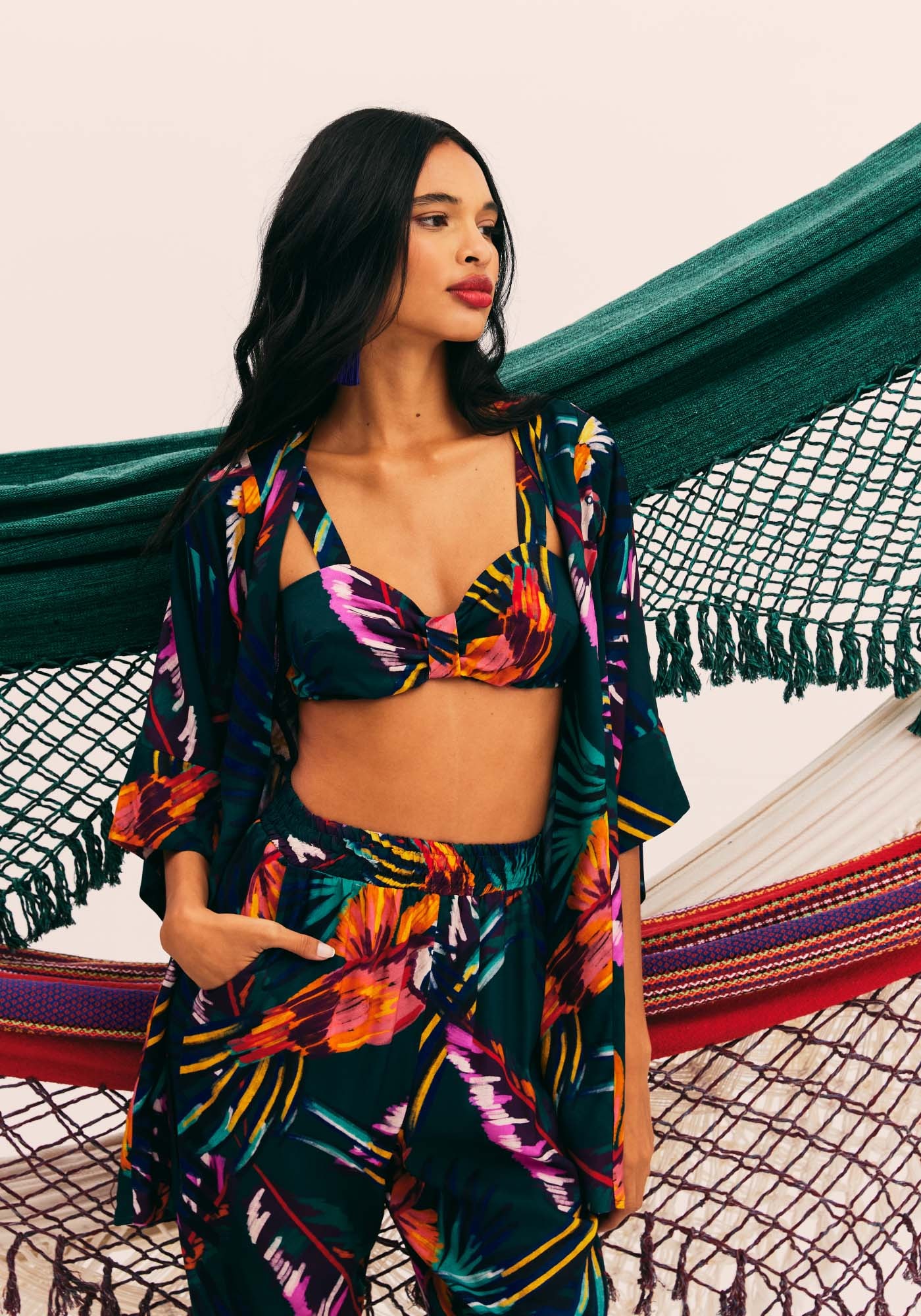 Este lindo kimono curto estampado é confeccionado em tecido 100% viscose,e possui mangas amplas, proporcionando maior conforto e praticidade. Seu tecidoleve e macio, faz com que a peça seja perfeita para dias quentes.