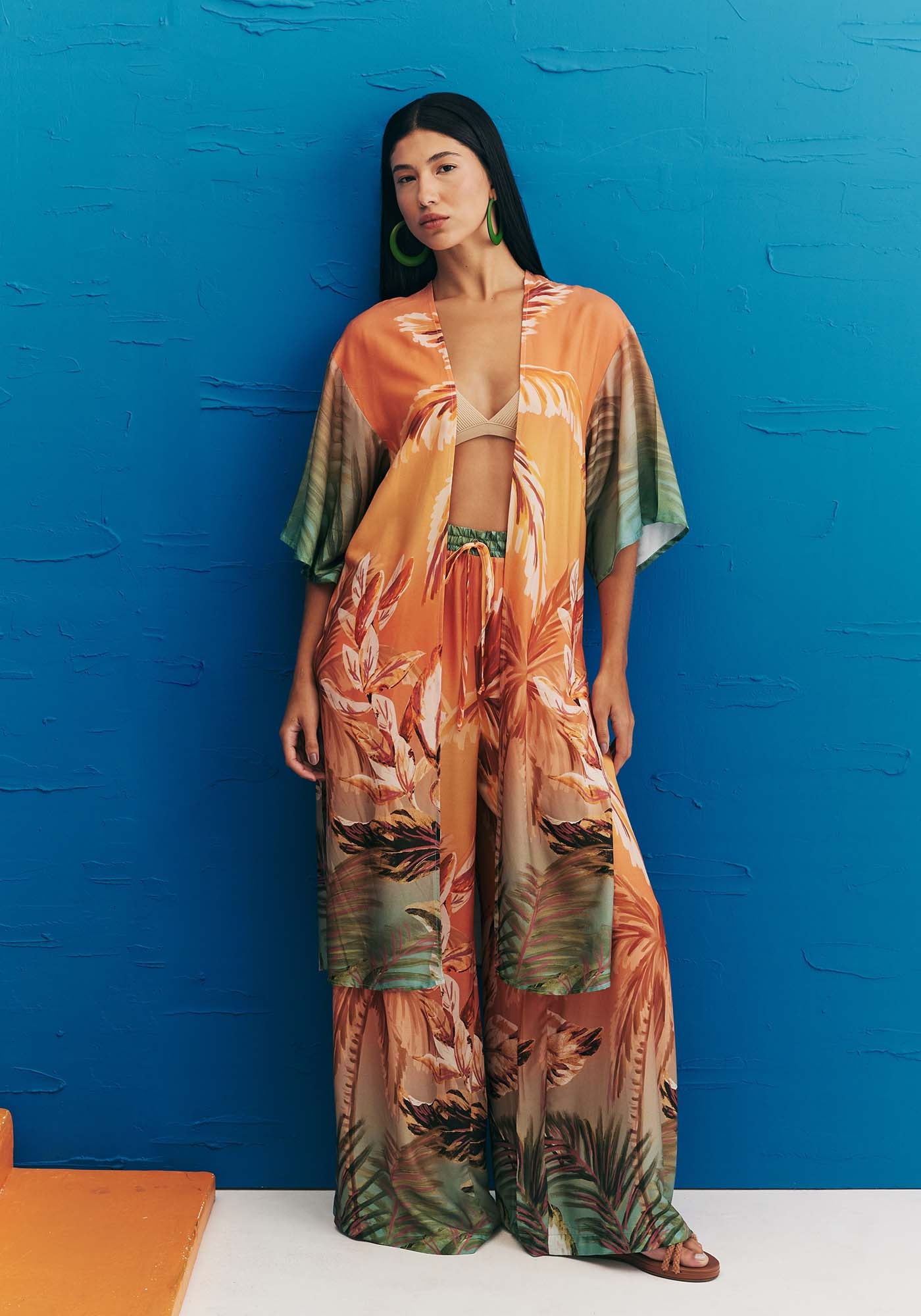 O Kimono Estampado Trancoso é uma peçaúnica e encantadora, confeccionada em tecido de composição 100% viscose. Apresentaum decote reto e mangas amplas. Seu comprimento é alongado e possui fendaslaterais que além de adicionarem um detalhe charmoso trazem liberdade demovimento para esta peça. Leve e sofisticado, é ideal para adicionar um toquede estilo em qualquer look.
