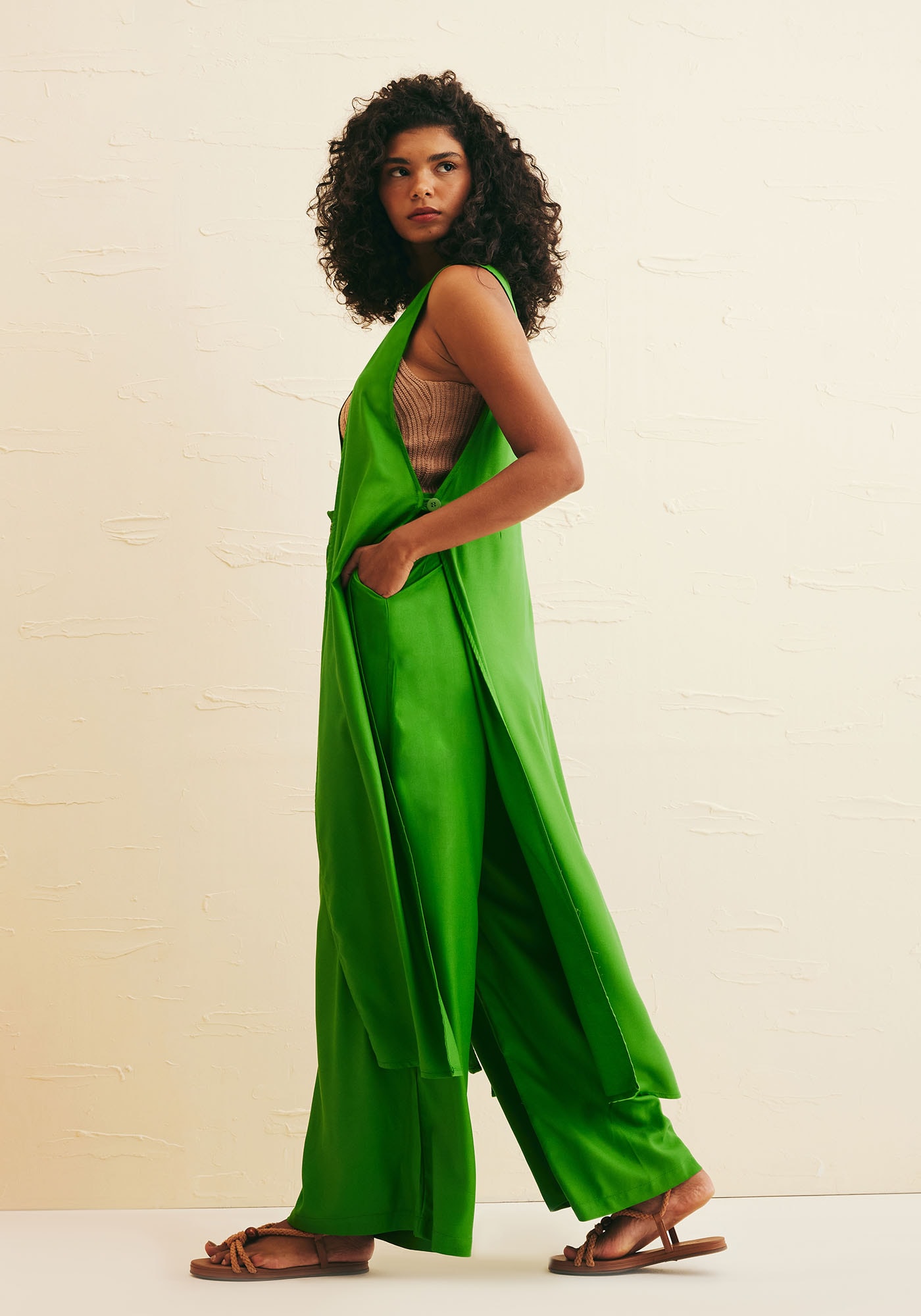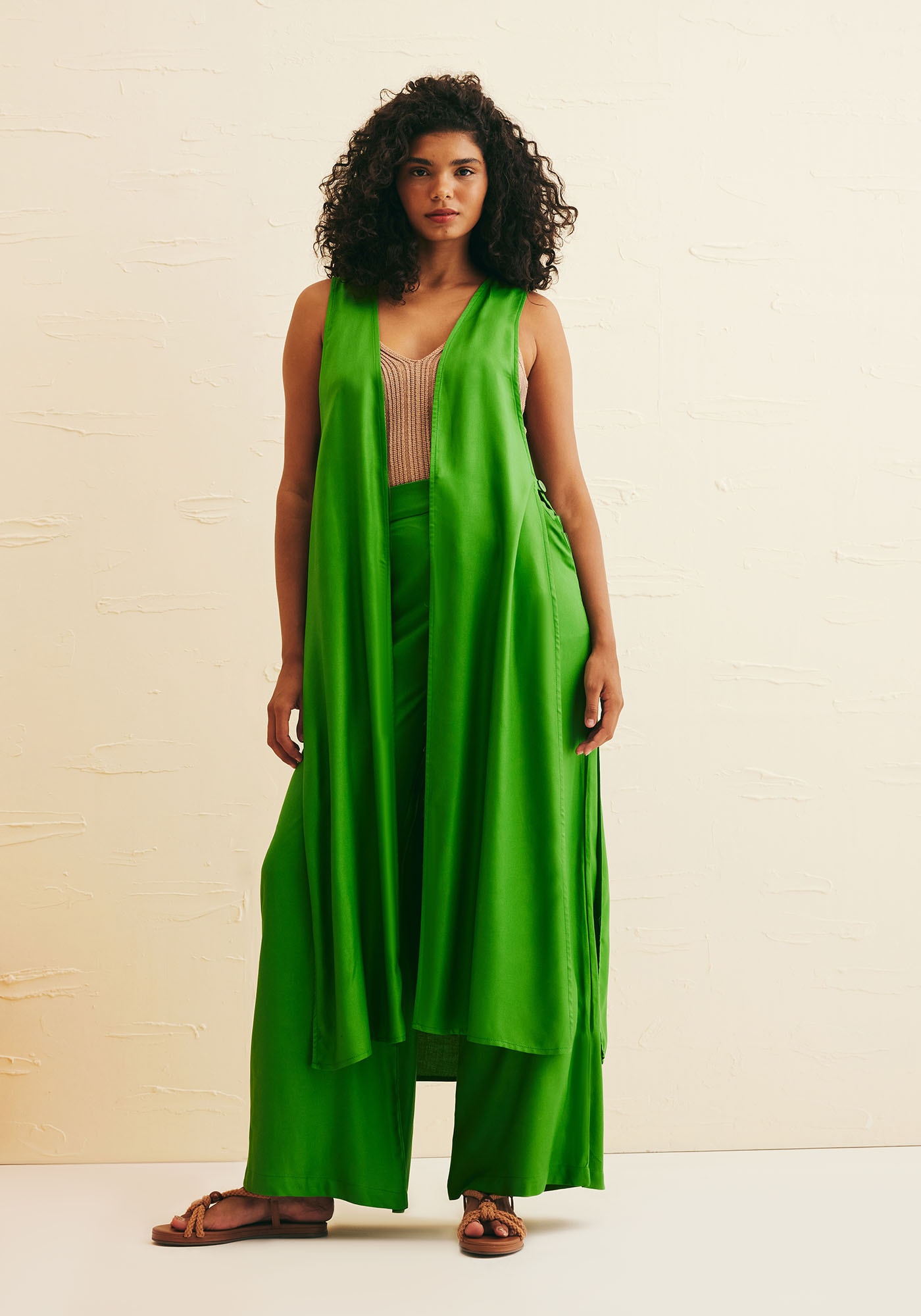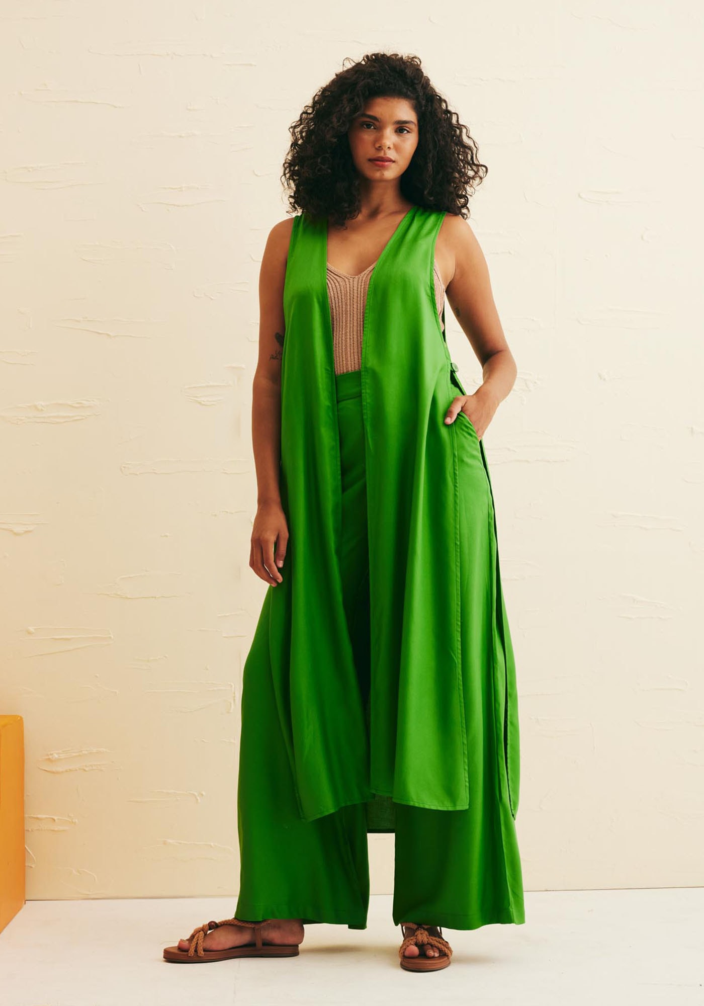 Confeccionado em tecido 100%viscose, o kimono liso é um modelo super estiloso. A modelagem alongada possuiuma cava lateral finalizada com botão e fendas laterais que dão fluidez emovimento para a peça.