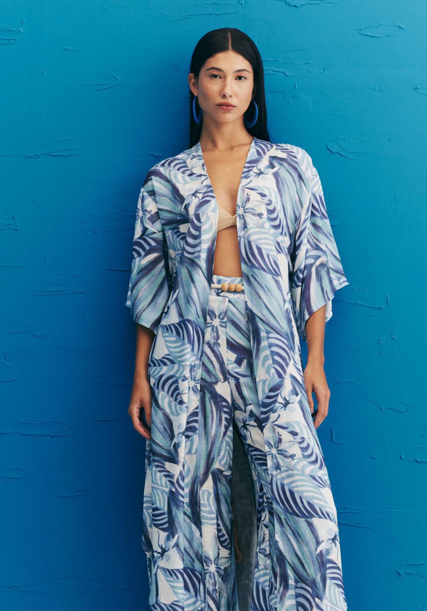 O kimono estampado é o complemento perfeito paraos looks do verão. Confeccionado em tecido 97% viscose 3% linho, é um modelocom comprimento alongado em pontas e fendas laterais, dando bastante fluidez à peça.As mangas são amplas, dando um charme a mais para o kimono.