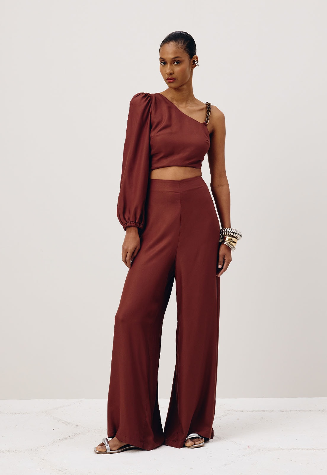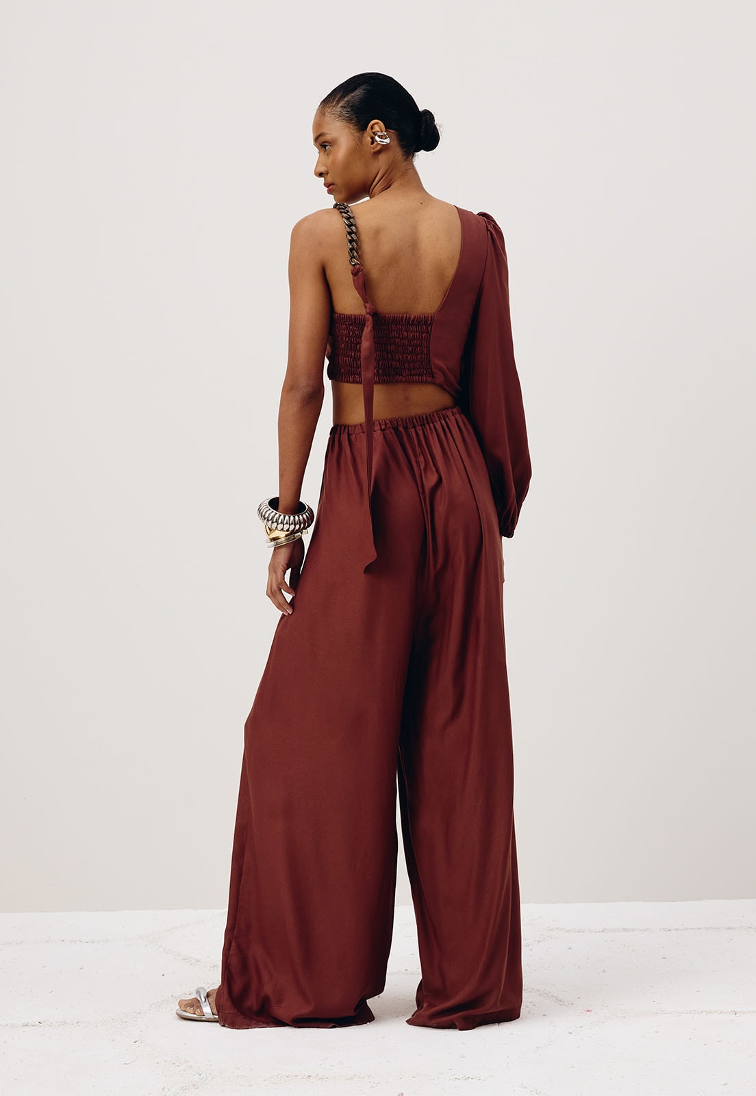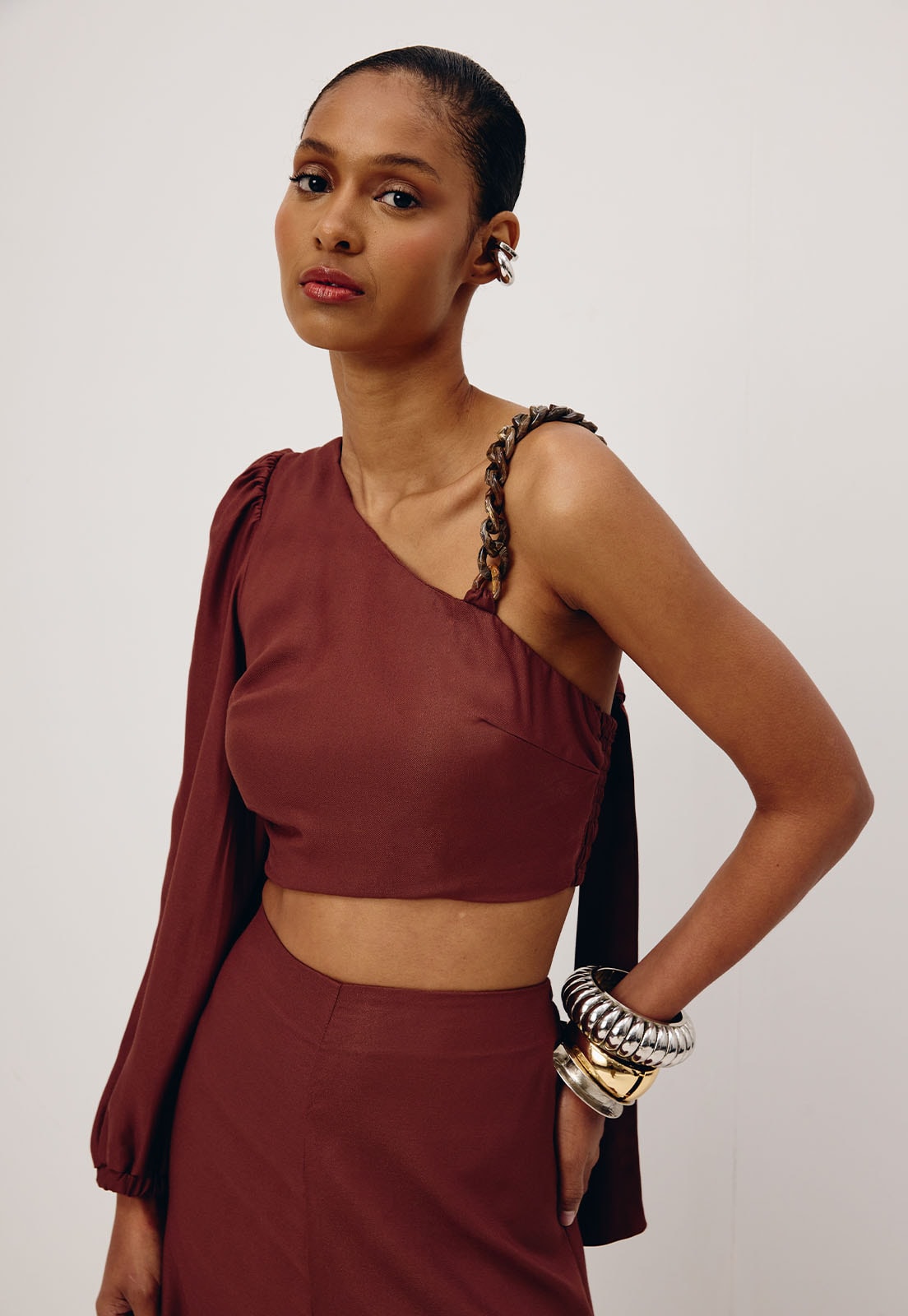 O macacão liso é confeccionado em tecido 100% viscose. É um modelo ousado e moderno, que mistura a manga bufante com detalhe em corrente. Além disso, possui abertura na cintura mistura e lastex na parte de trás.