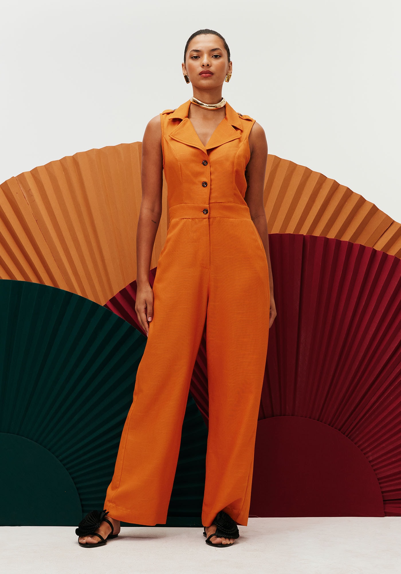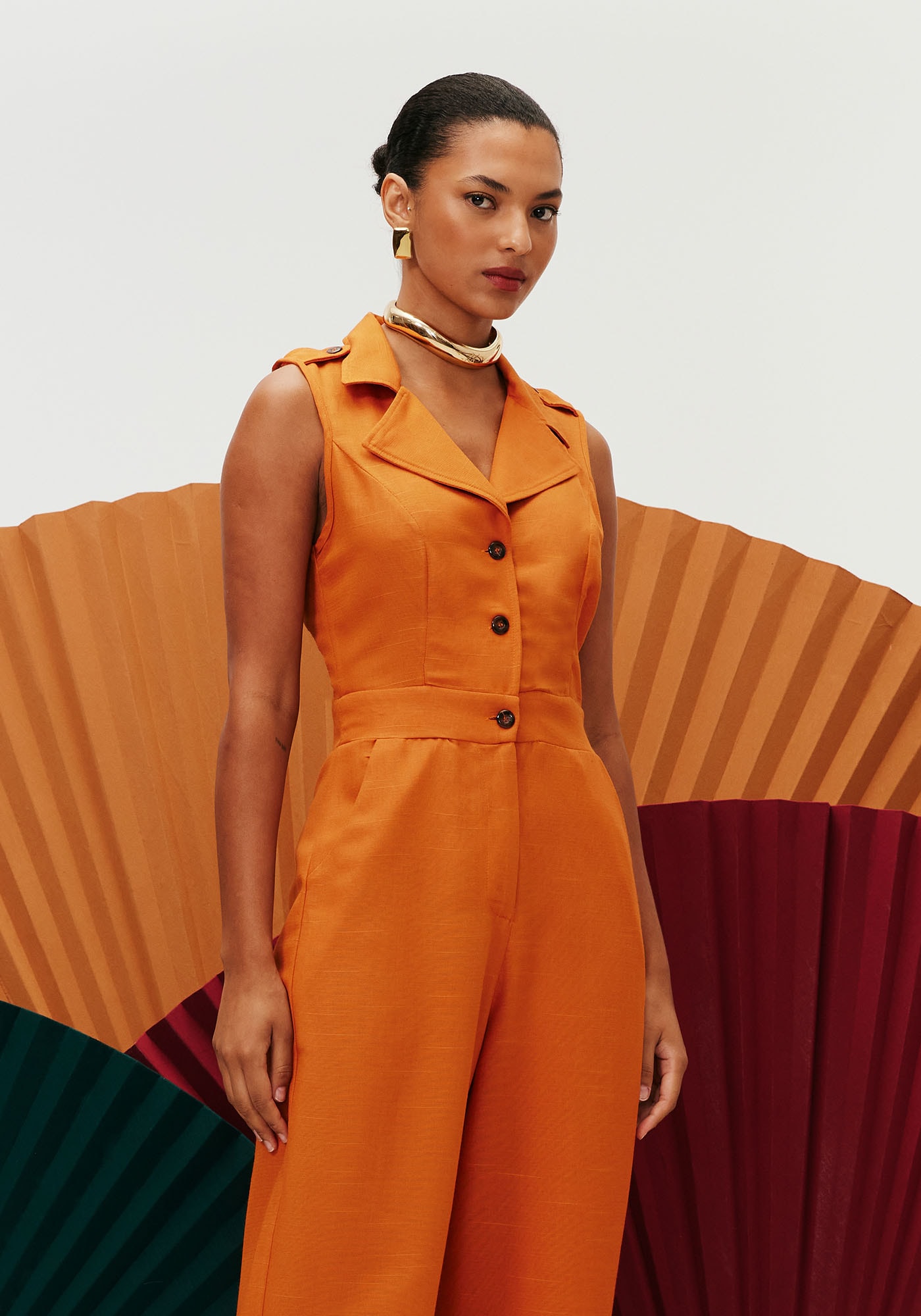O macacão alfaiataria é clássicoe elegante. Confeccionado em tecido 61% viscose e 39% algodão, o modelo sem mangapossui abotoamento frontal com gola e pala na cintura. Os bolsos laterais emfaca facilitam a usabilidade no dia a dia. O detalhe da aleta no ombro é umcharme para peça.