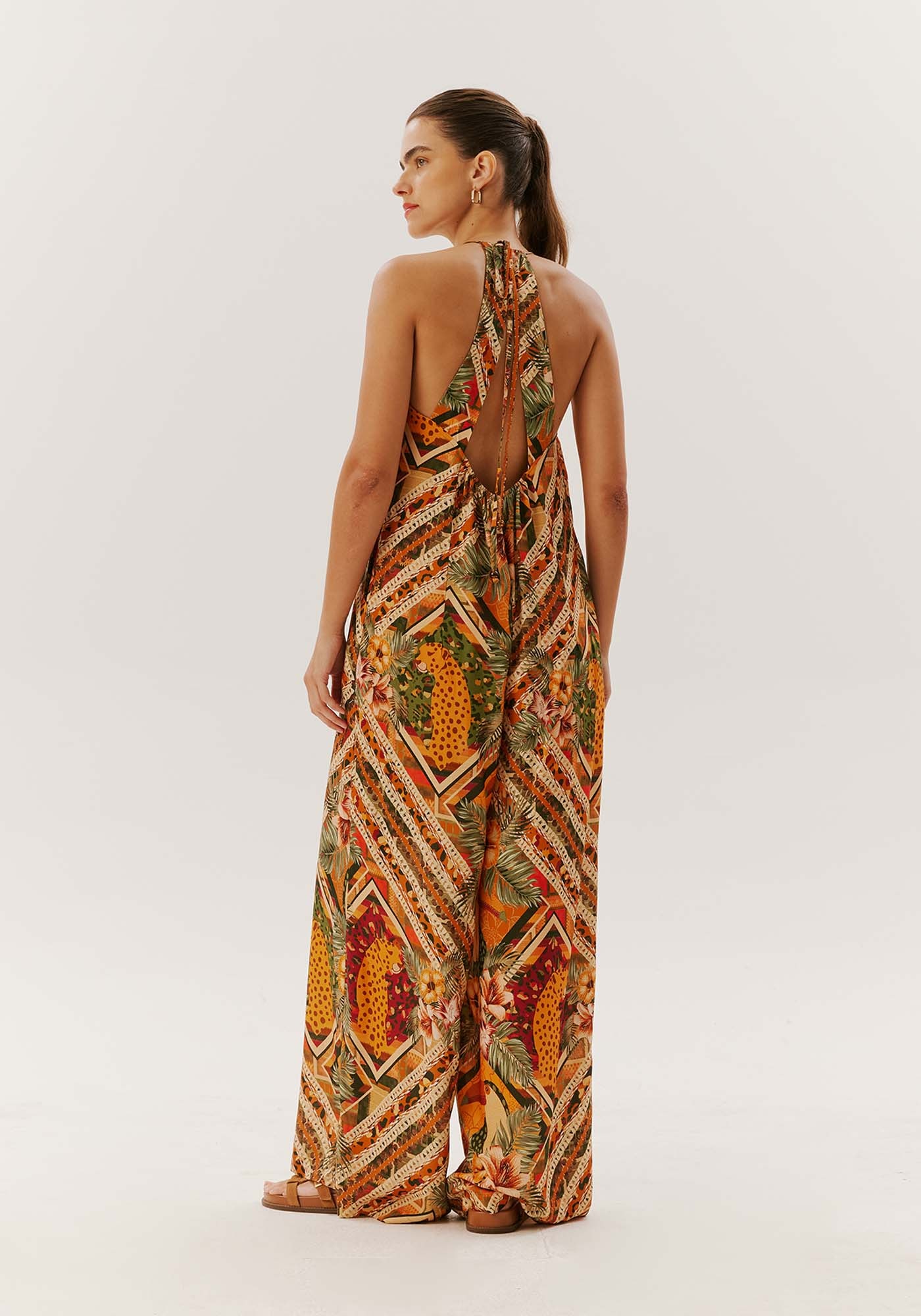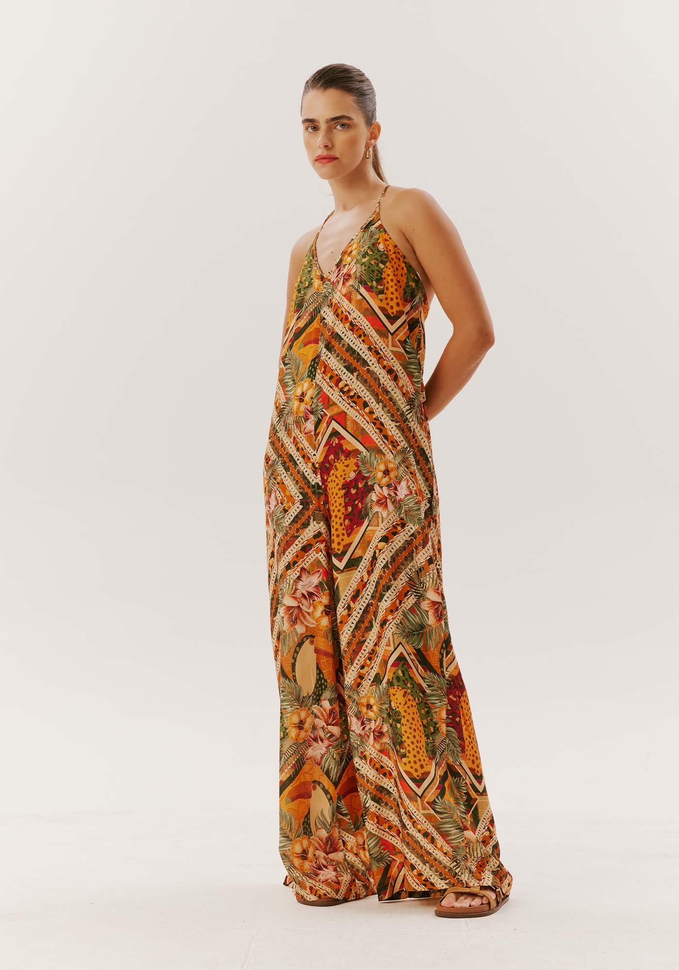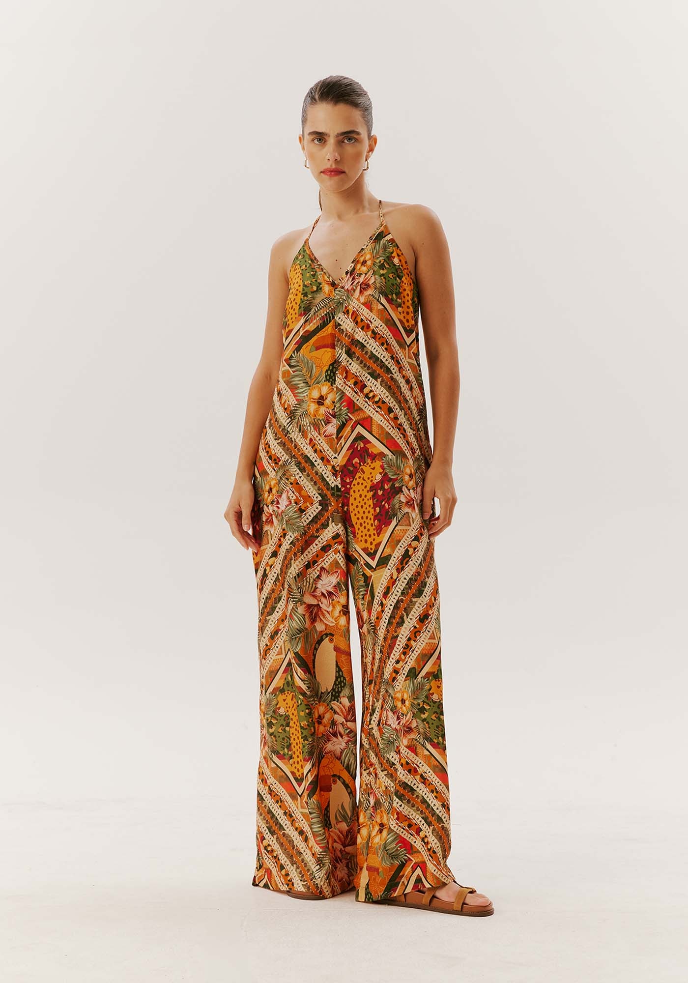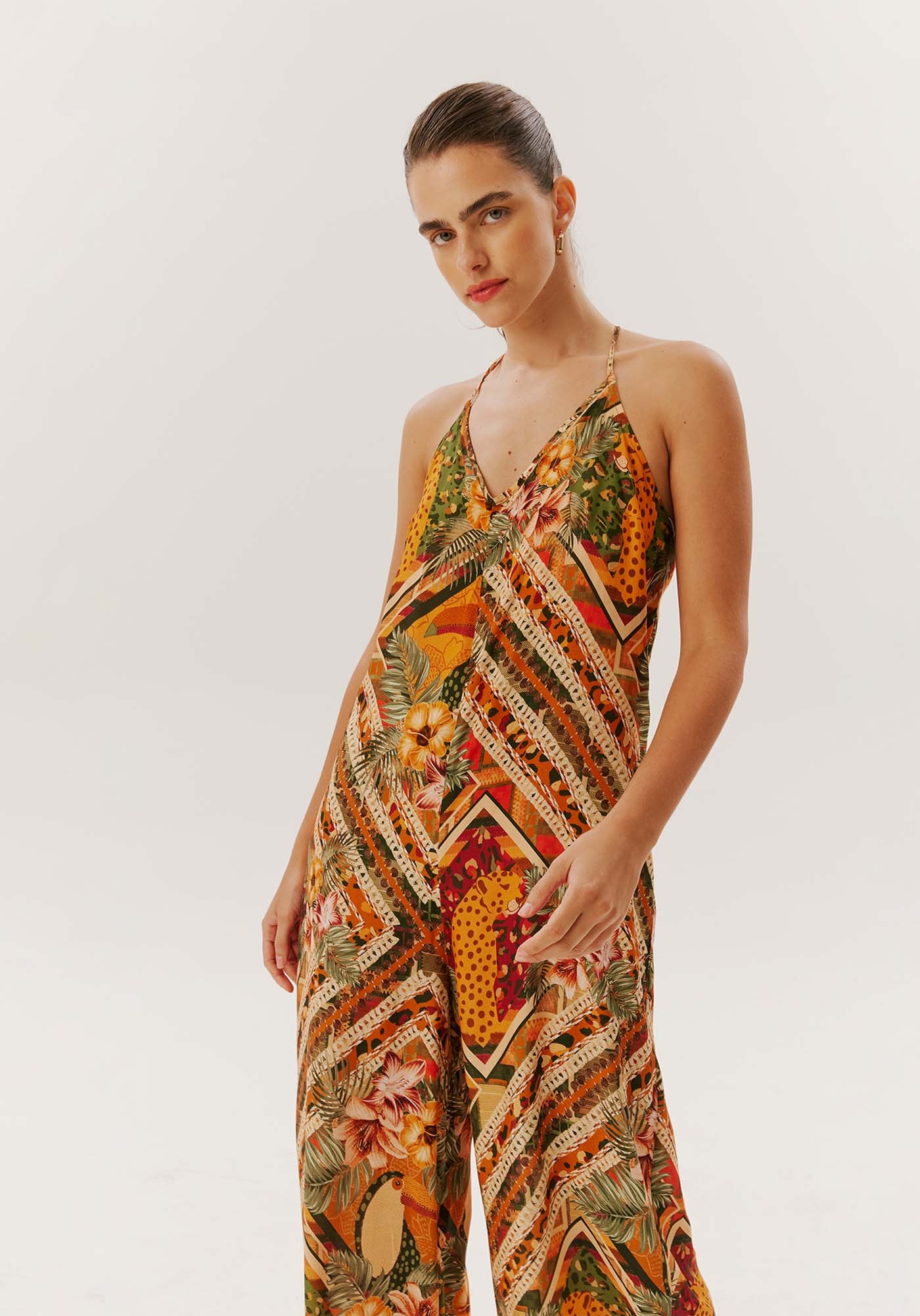 Feito em tecido 100% viscose, nosso macacão longopossui modelagem leve e estampa em verde, laranja e amarelo, com detalhes deonça pintada, flores e triângulos que adicionam um toque de estilo selvagem aoseu look. O tecido em viscose garante conforto nos dias quentes, enquanto vocêexibe elegância e originalidade.