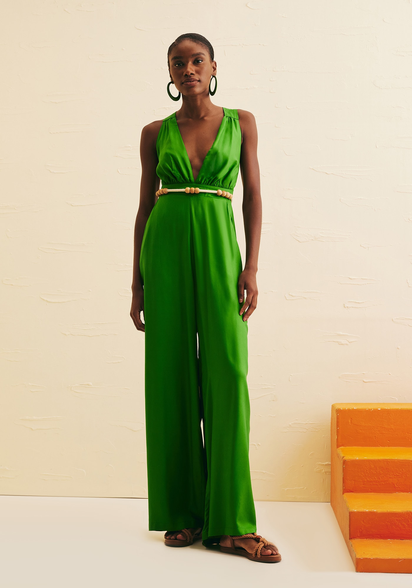 O macacão liso é elegante e sexy.Confeccionado em tecido 100% viscose, o modelo possui decote profundo com palae amarração nas costas que pode ser regulada. O elástico na parte de trásauxilia na vestibilidade da peça.