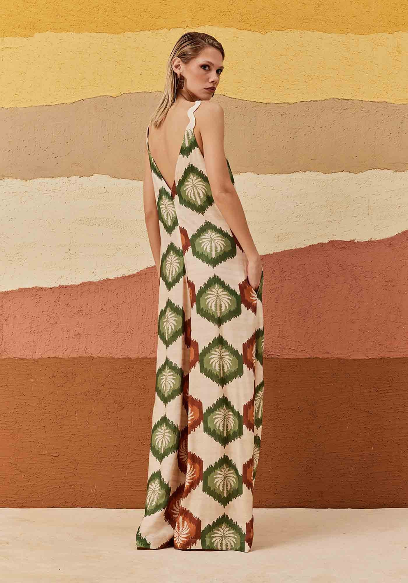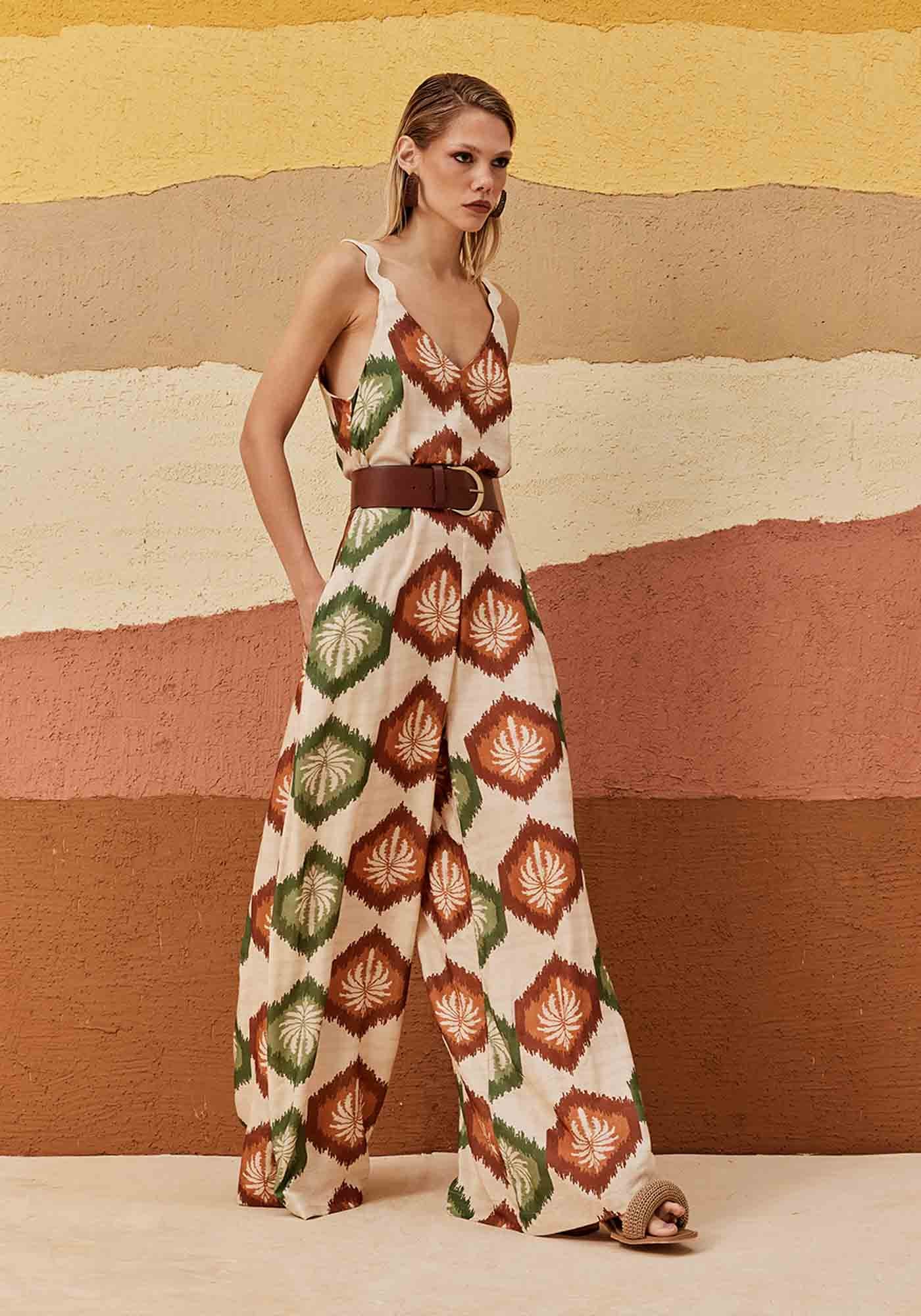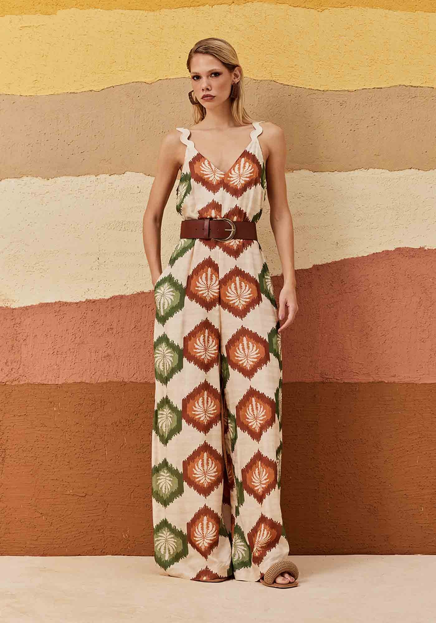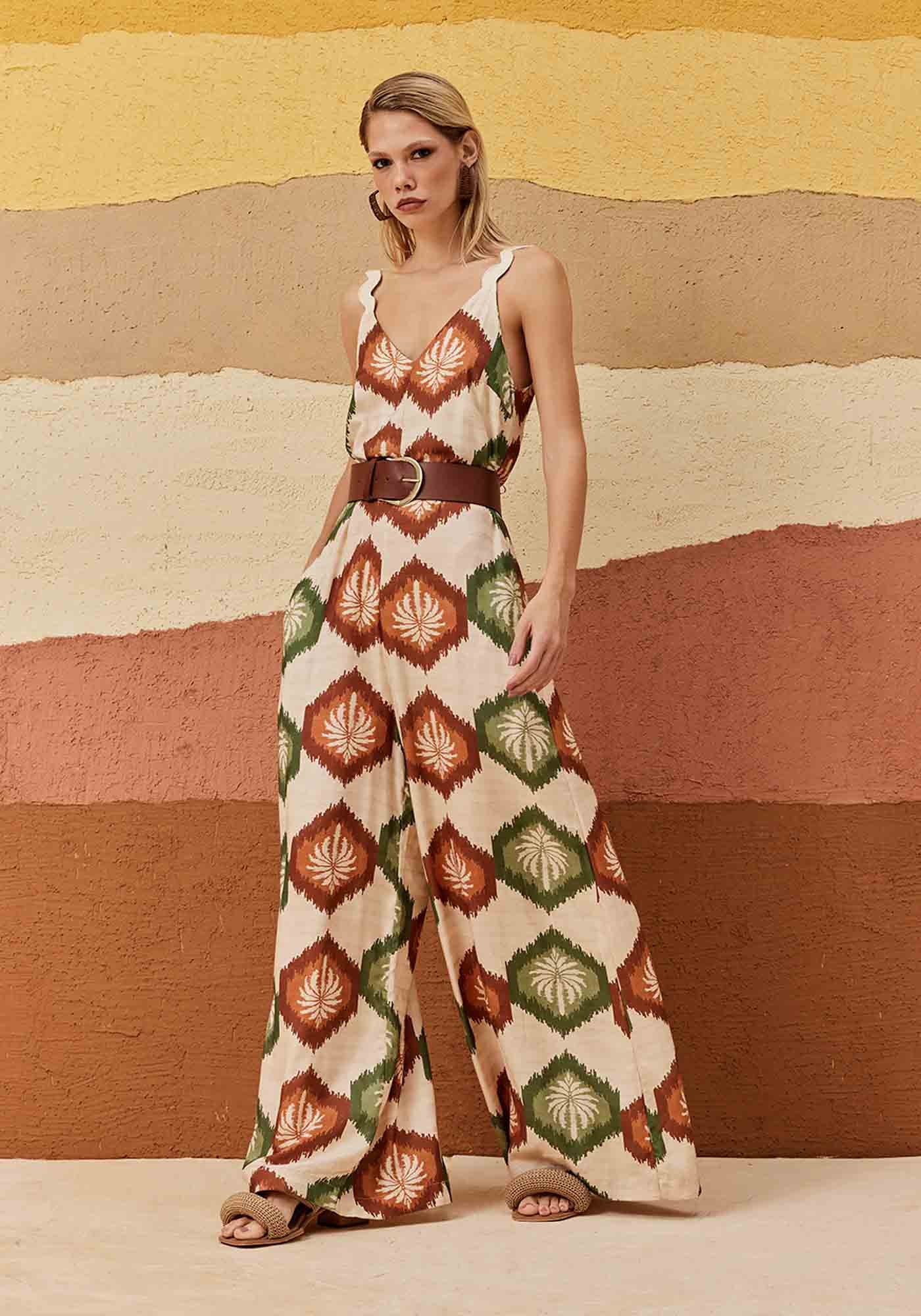 O macacão estampado Andina é confeccionado em tecido 96% viscose e 3% linho. O modelo possui o shape solto e confortável com decote em V, bolsos laterais que deixam o modelo mais prático e o detalhe charmoso da alça em sianinha, que valoriza a peça.