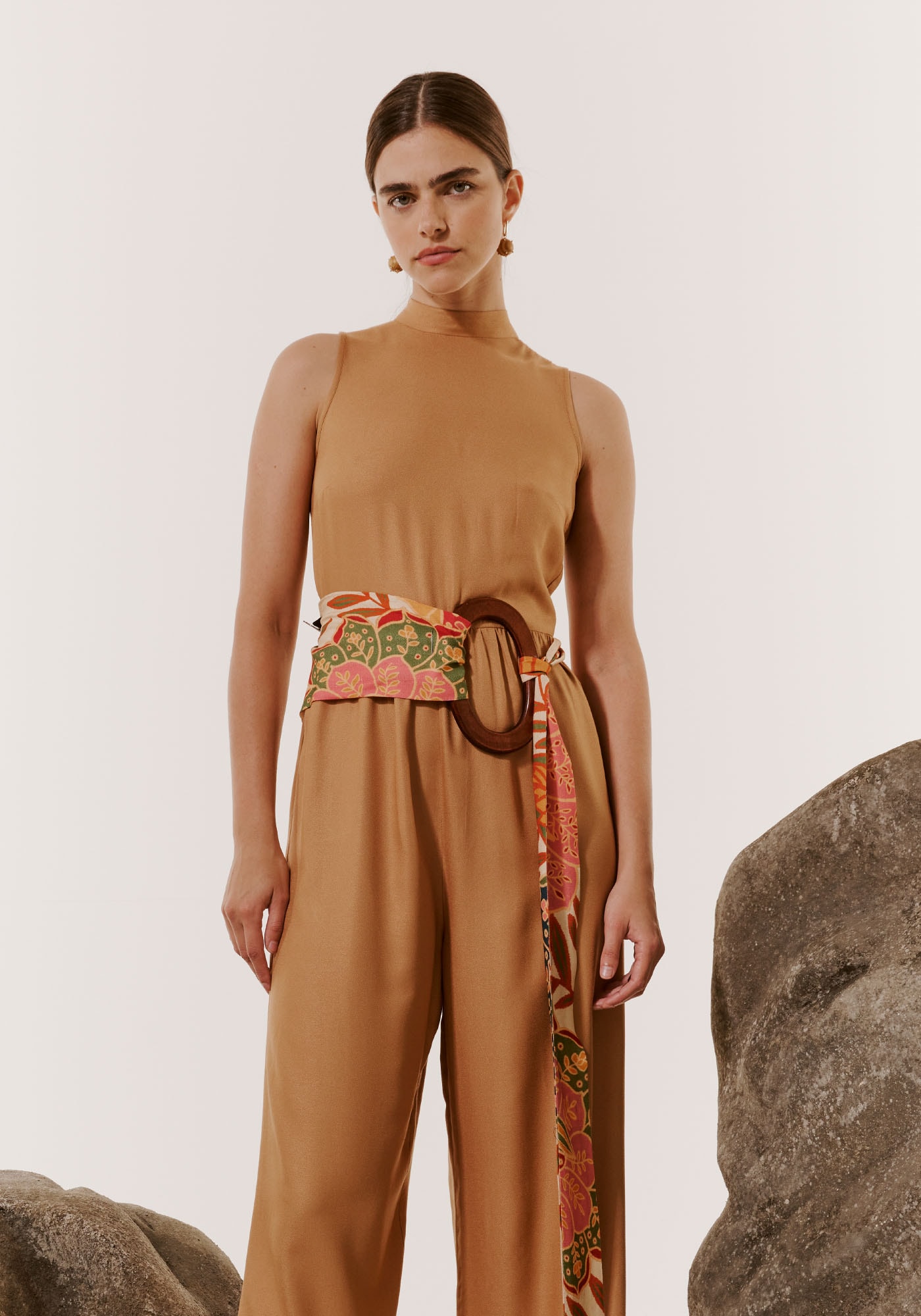 Confortável e versátil, o macacão é confeccionado em tecido 100% viscose. O modelo sem manga possui golinha e modelagem solta e fluída. A calça em estilo pantalona ésuper estilosa.