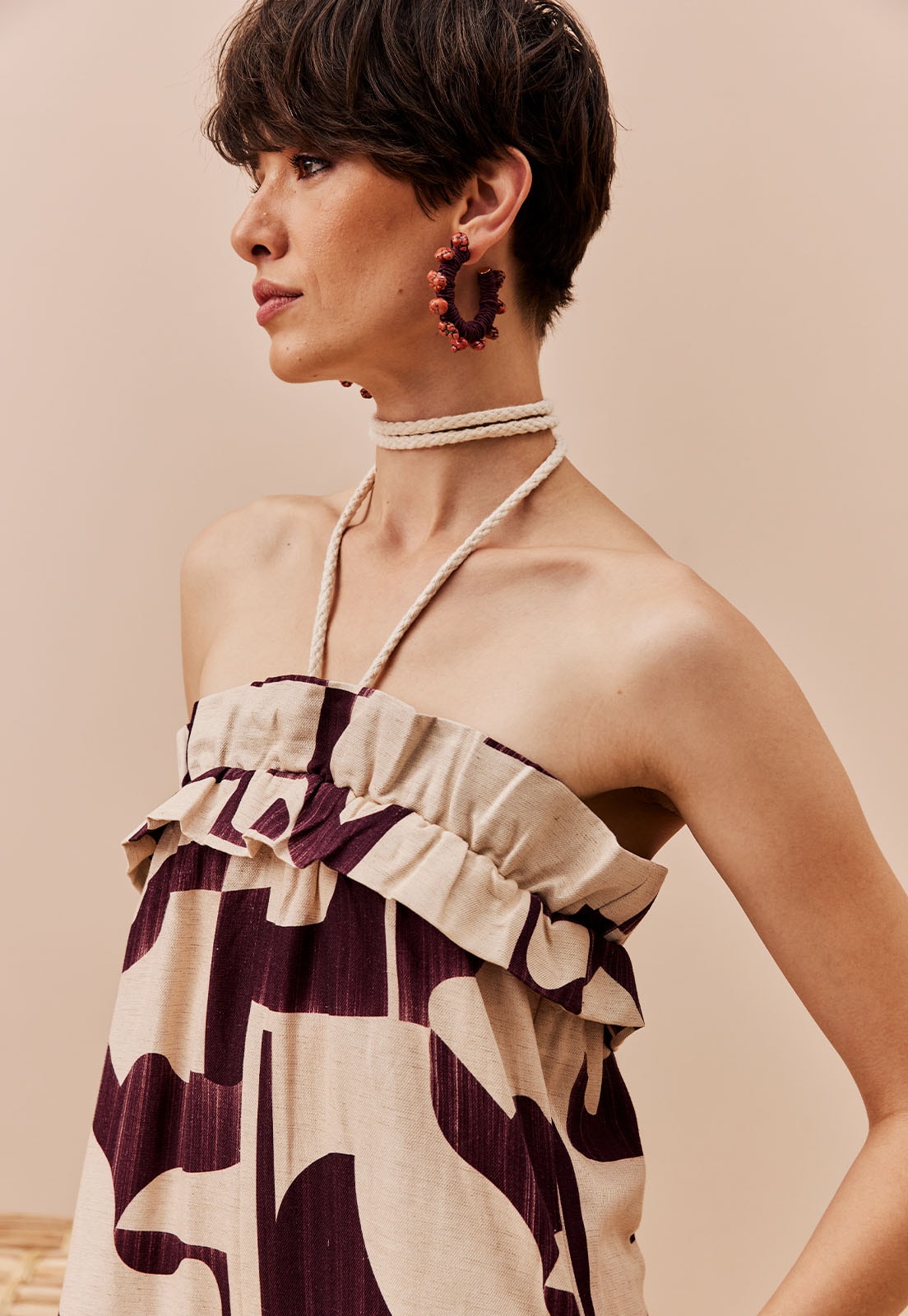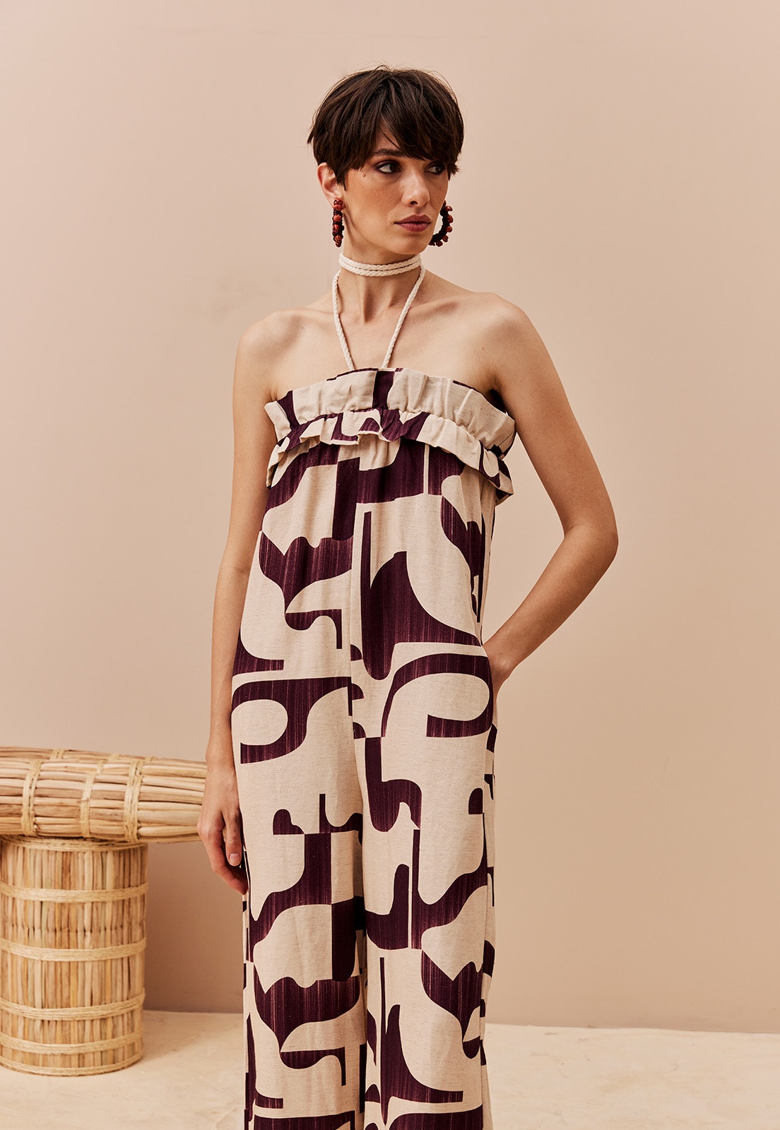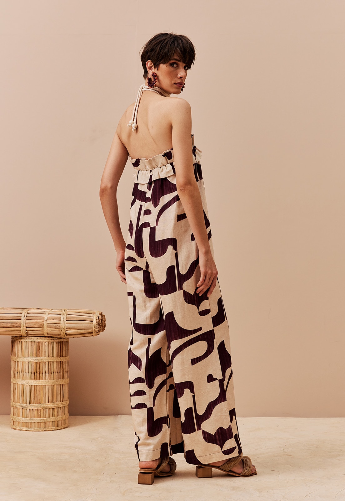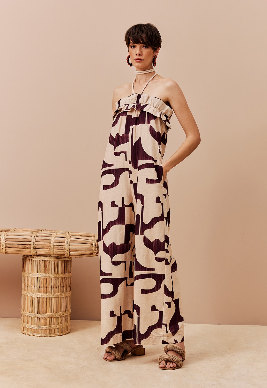 O macacão estampado Puente Del Incaé confeccionado em tecido 50% algodão 29% viscose 15% modal e 6% linho. Com modelagem ampla e bolsos laterais, a peça possui amarração no pescoço em corda e decote reto com detalhe belíssimo do rufo.