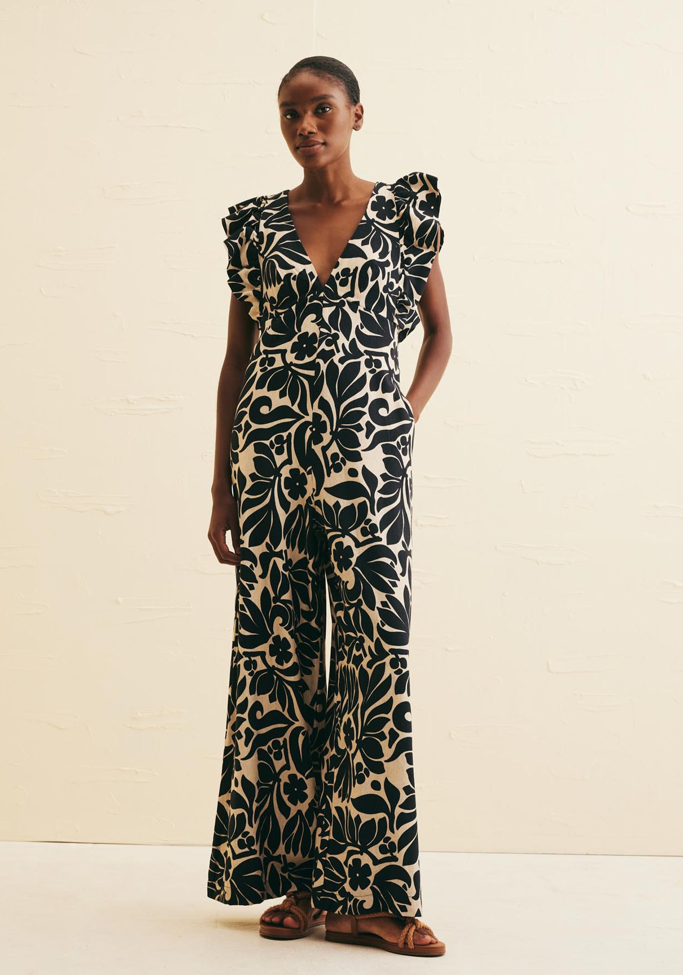 O macacão estampado é belo esofisticado. Confeccionado em tecido 42% algodão 38% viscose 14% modal e 6%linho, o modelo possui decote profundo em V e babado na manga, detalhes queadicionam charme e romantismo para a peça. Nas costas também têm um decote em Vprofundo com amarração e fechamento com zíper invisível. Os bolsos laterais emfaca são um plus a mais.