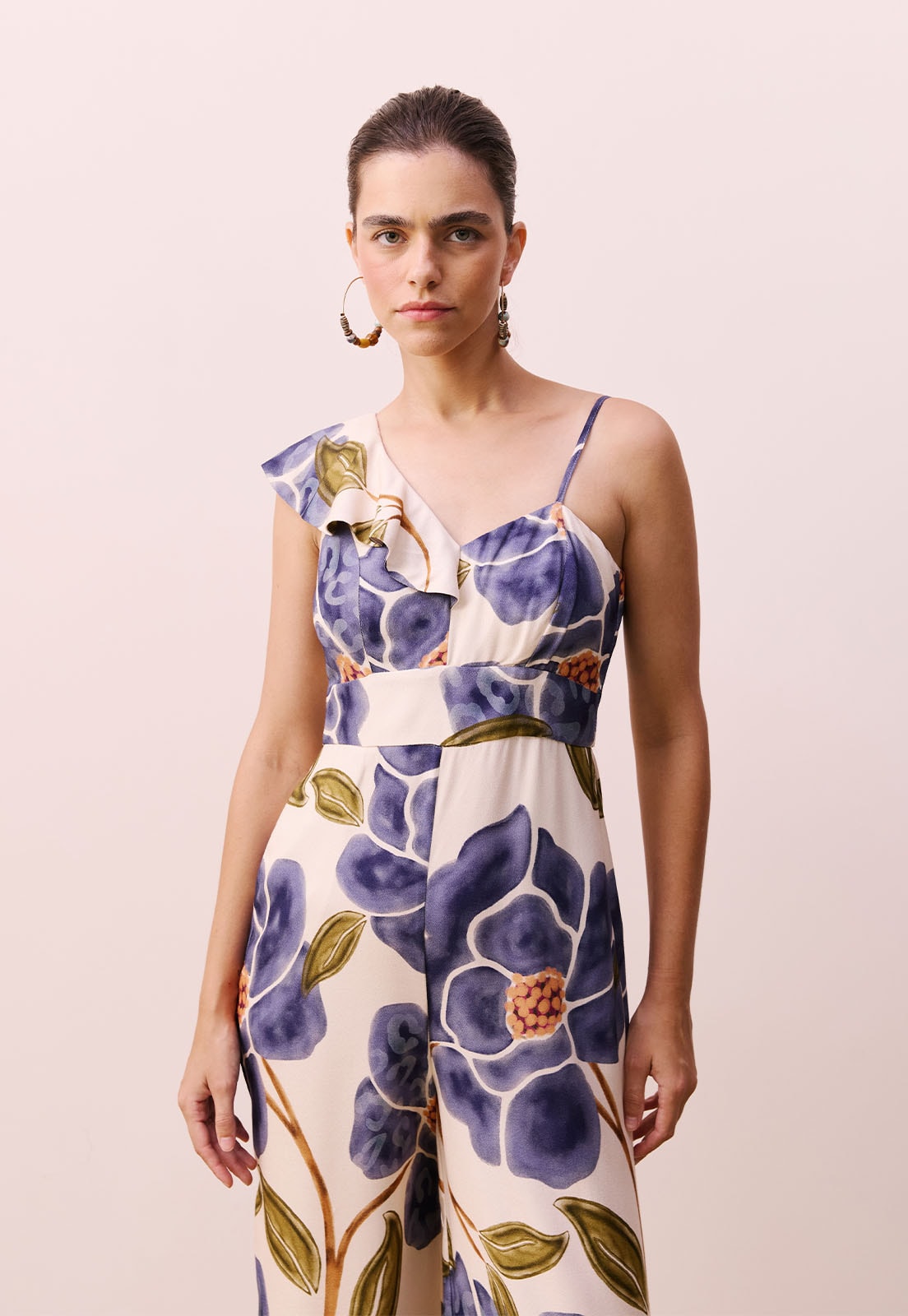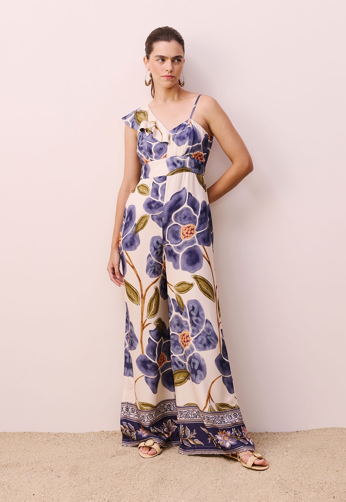 Descubra o charme atemporal do Macacão Babado Um Ombro, uma peça que une sofisticação e leveza em cada detalhe. Com design assimétrico e babado delicado que valoriza o colo, ele traz um toque moderno e feminino ao visual. A modelagem de pernas largas garante fluidez e conforto, enquanto a alça ajustável proporciona caimento perfeito. Confeccionado em 100% viscose, o tecido leve e macio oferece frescor e movimento natural, ideal para dias quentes ou eventos especiais. A modelo veste tamanho P e mede 1,77m, evidenciando o caimento elegante da peça.