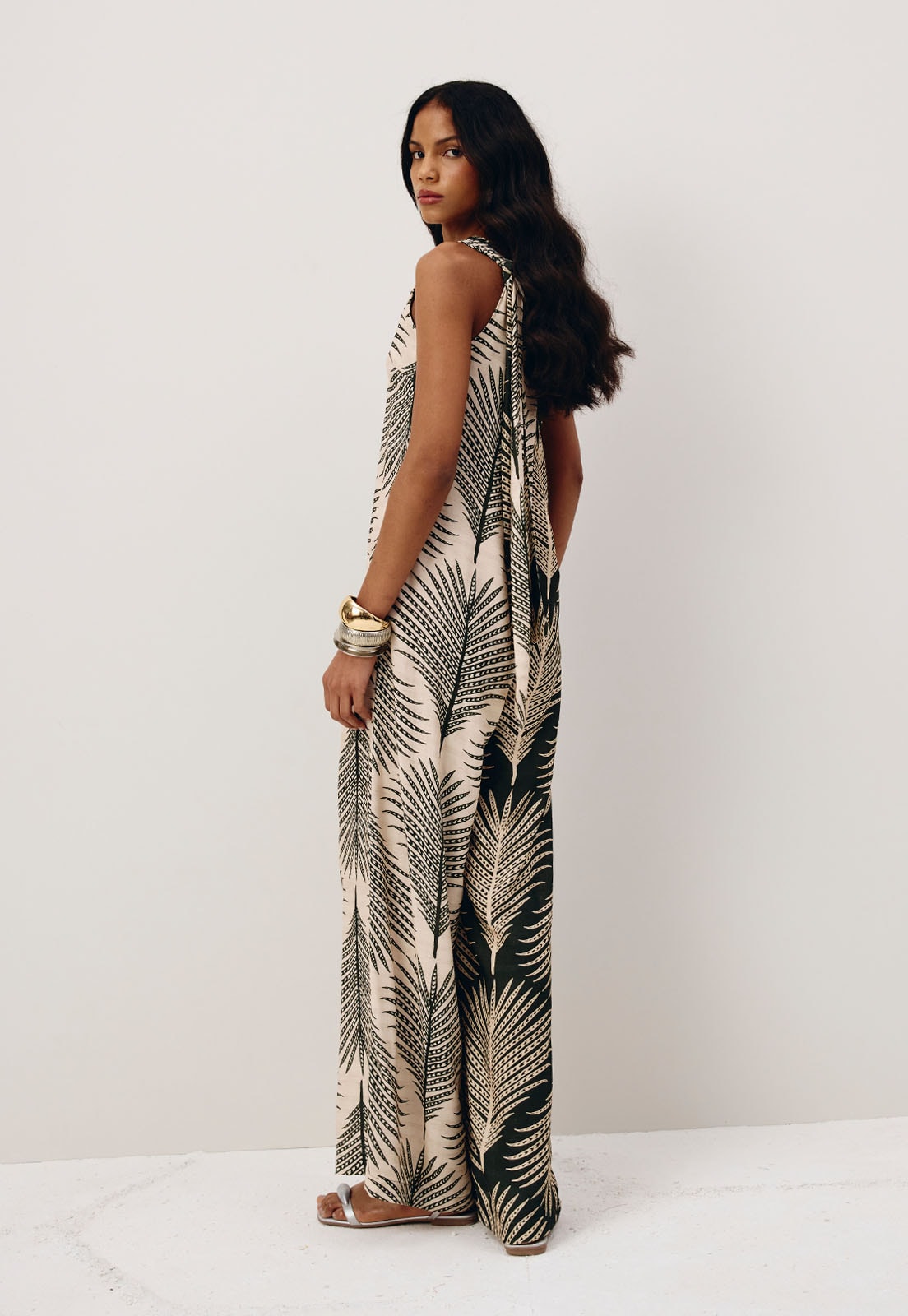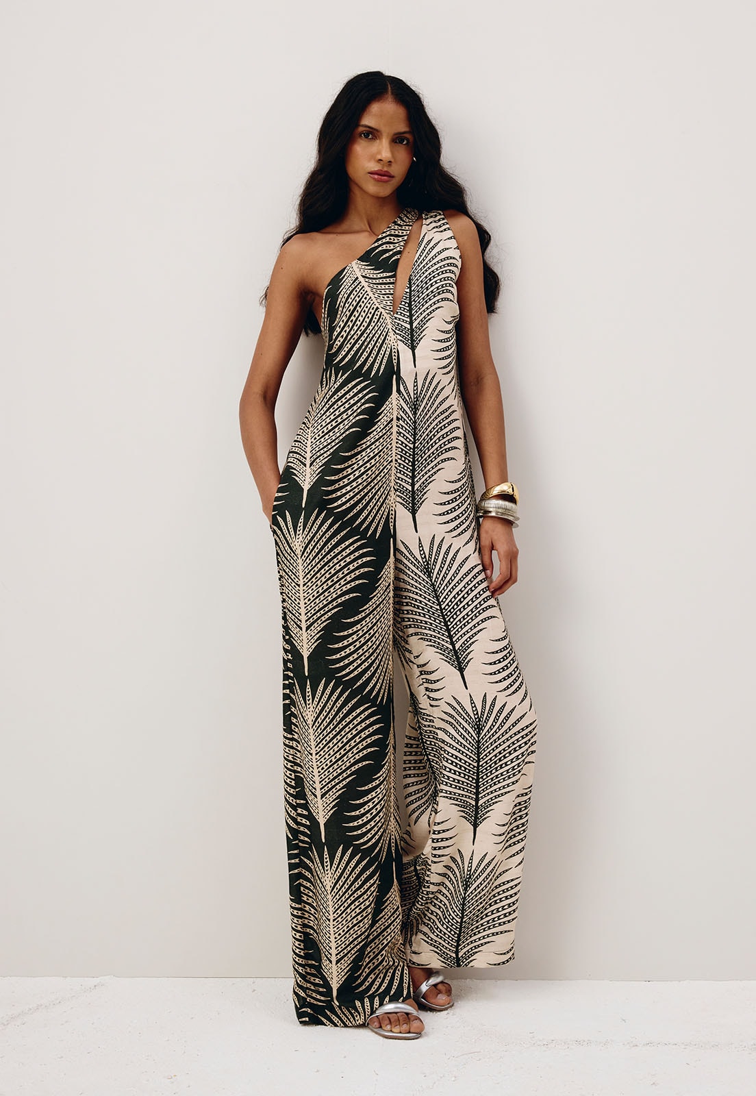 O macacão estampado Palmas é confeccionado em tecido 96% viscose 3% linho. É um modelo encantador, de um ombro só com recorte, que se destaca pelo detalhe bicolor. Além disso, possui a praticidade dos bolsos laterais.