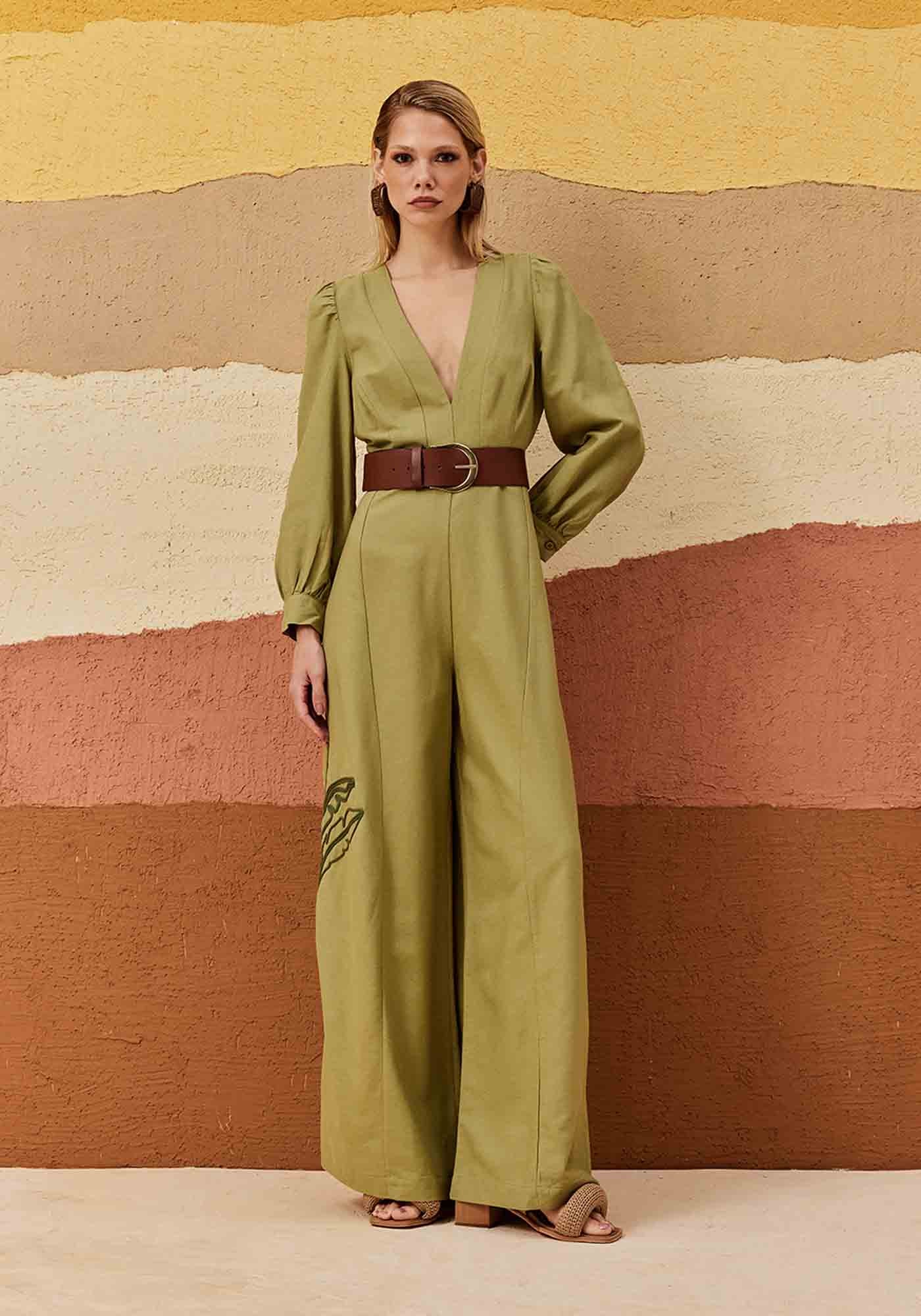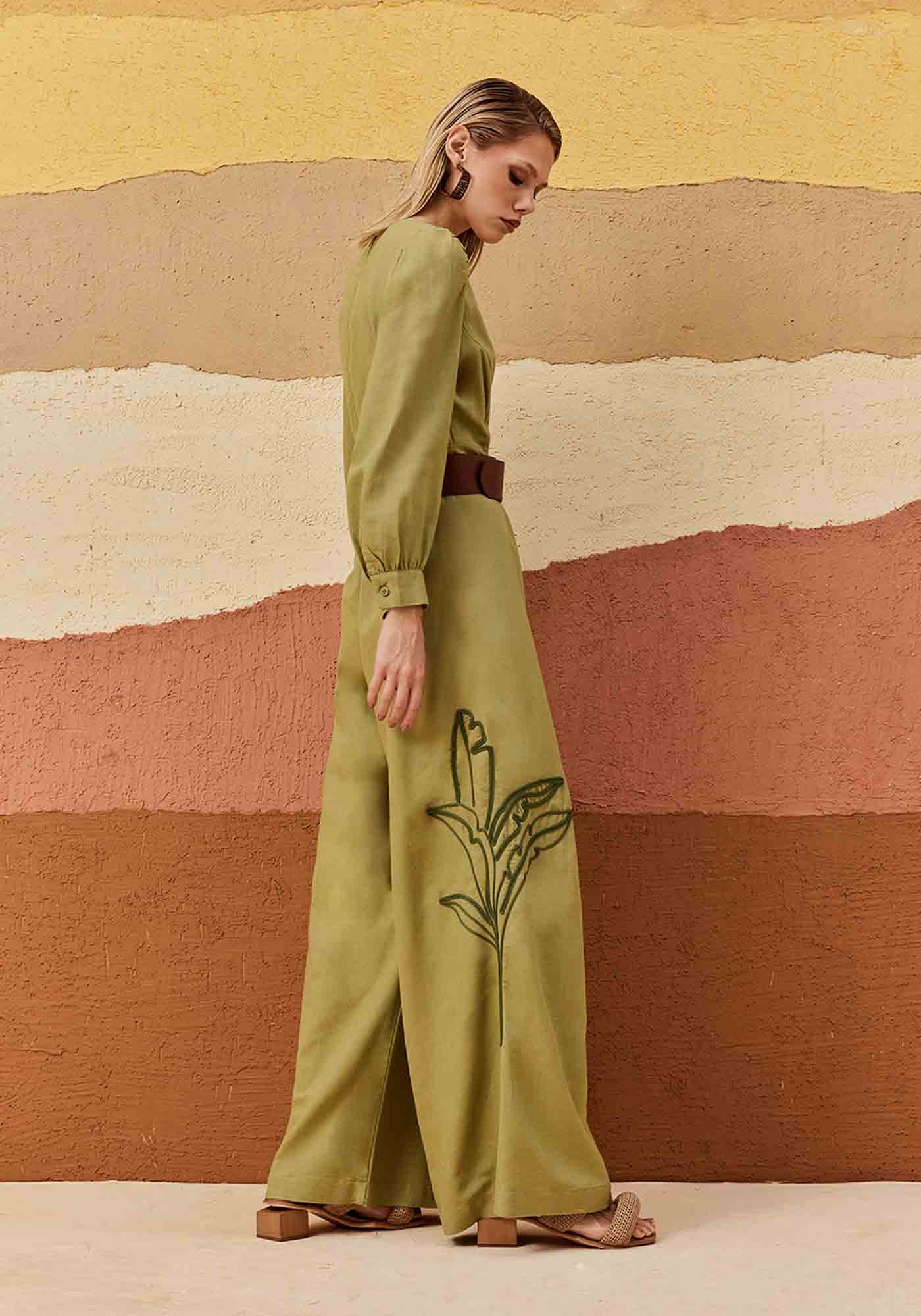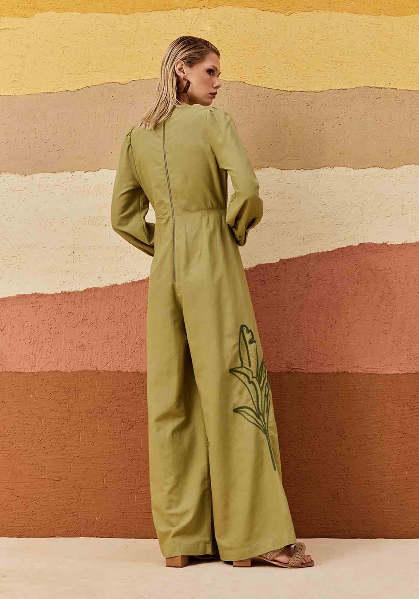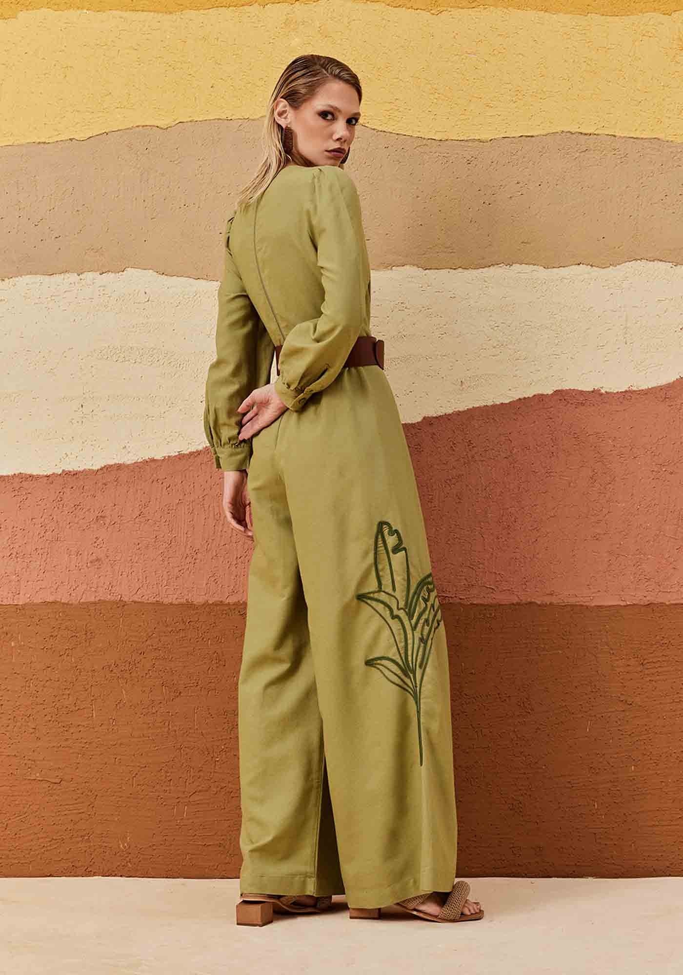 Este macacão de mangas longas bufantes é a escolha perfeita para quem busca um look moderno e cheio de personalidade. O decote V profundo frontal com palae a calça pantalona proporcionam uma silhueta alongada e sofisticada. O destaque fica por conta do bordado de palmeira na lateral, que traz um toque tropical e único à peça. O fechamento em zíper nas costas garante praticidade, enquanto o tecido (42% Algodão, 38% Viscose, 15% Modal, 6% Linho) combina conforto e frescor, ideal para diversas ocasiões.