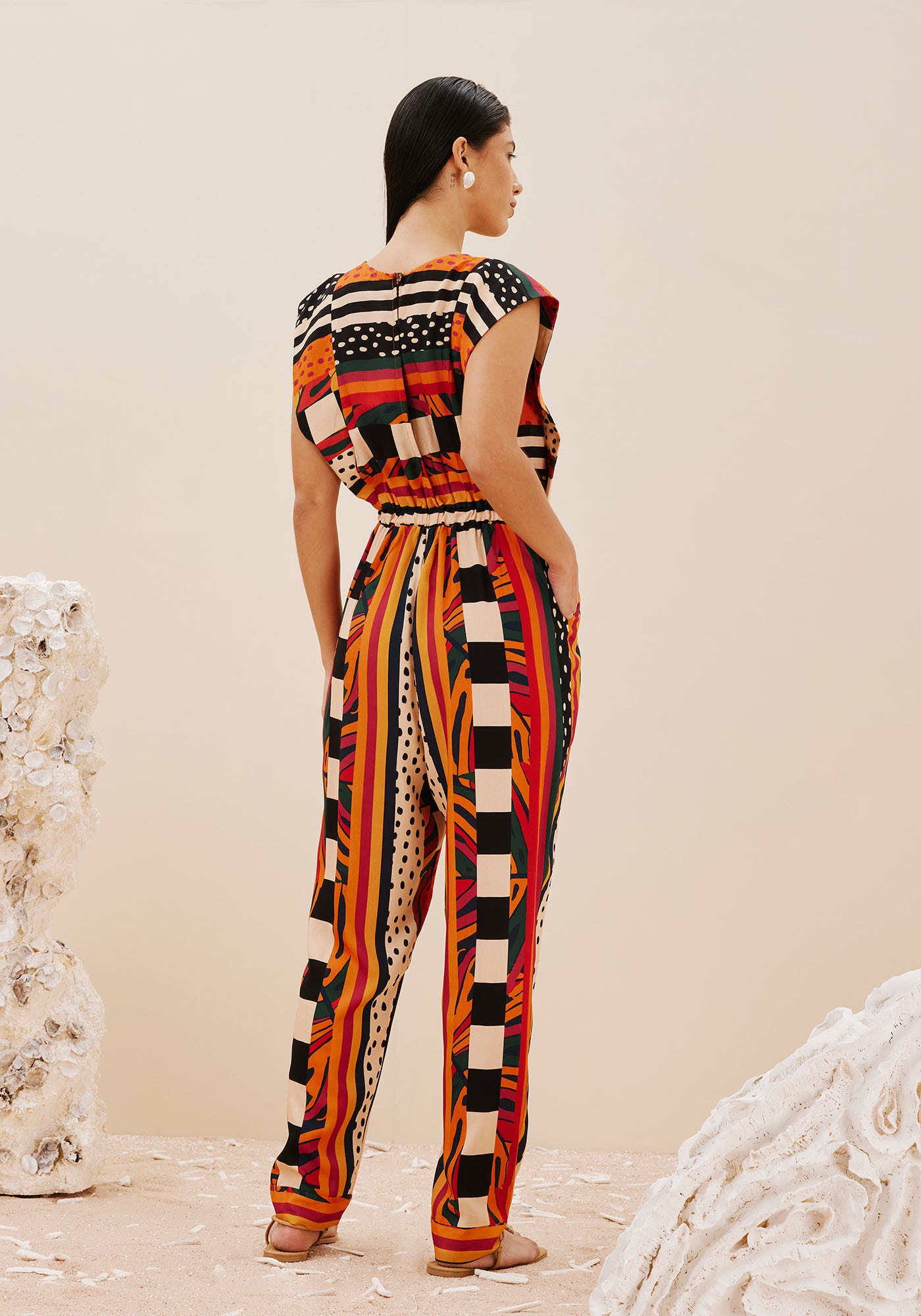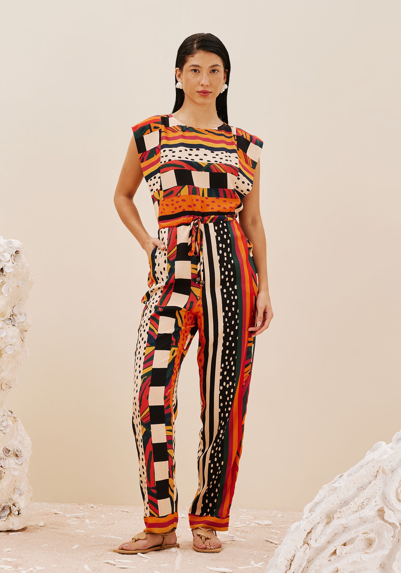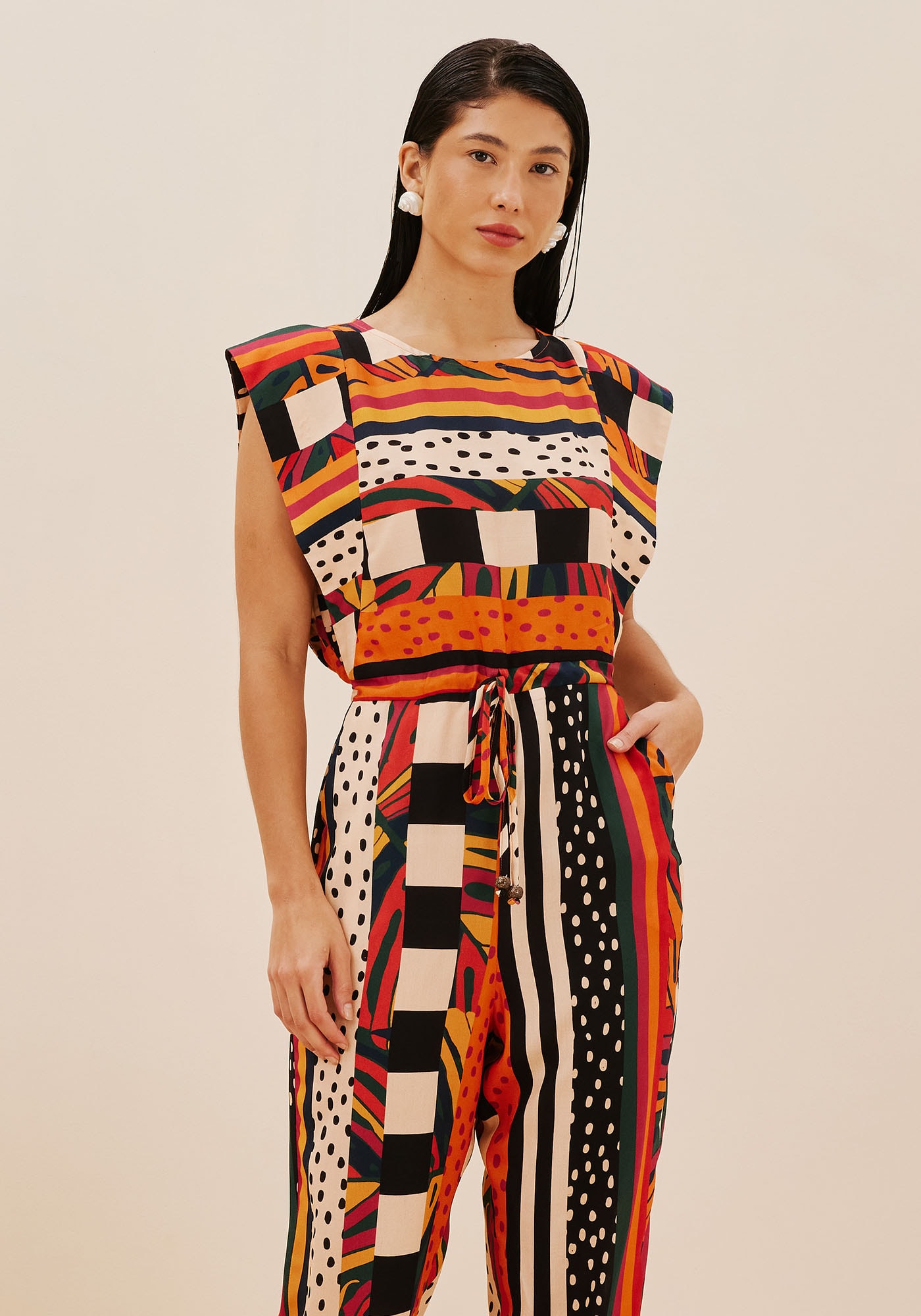O macacão cenoura estampado Terraconfeccionado em tecido 100% viscose encanta pelos detalhes. A manga tee dá umtoque de sofisticação para a peça. O modelo ainda possui bolsos laterais eamarração em túnel, que facilita o ajuste próximo à cintura.