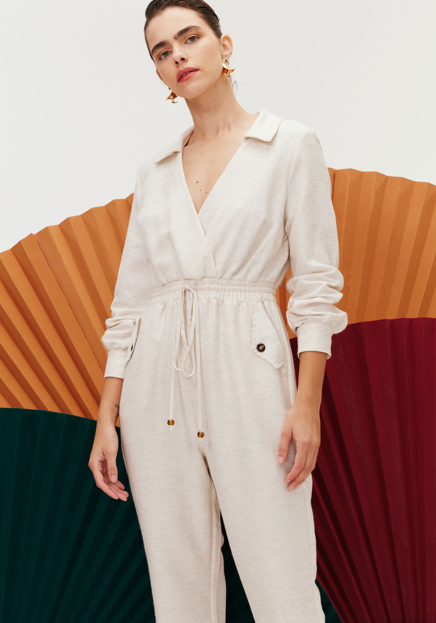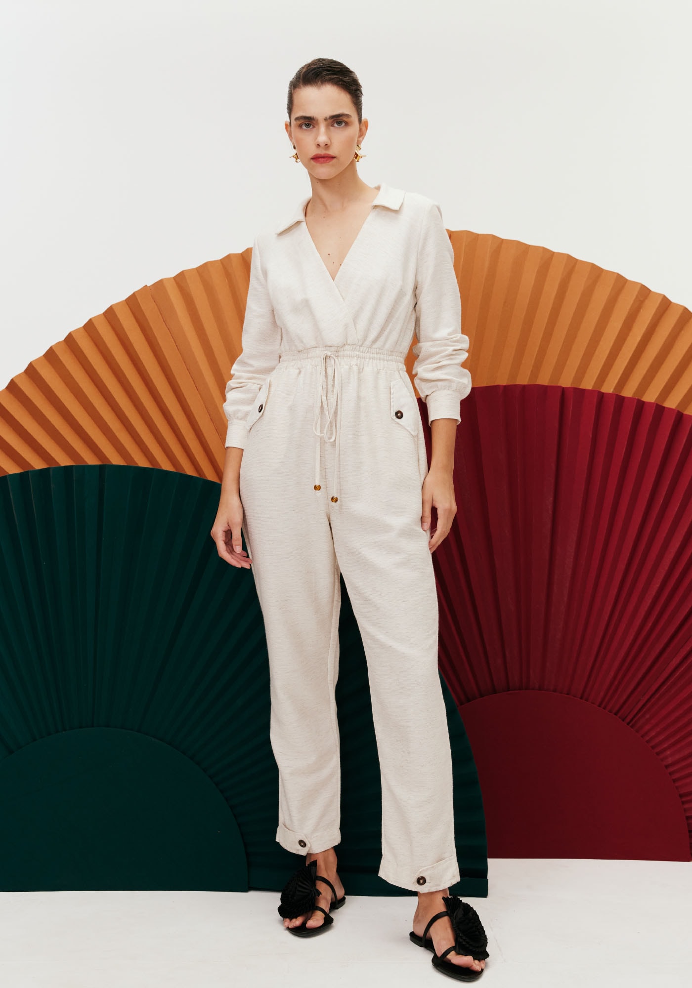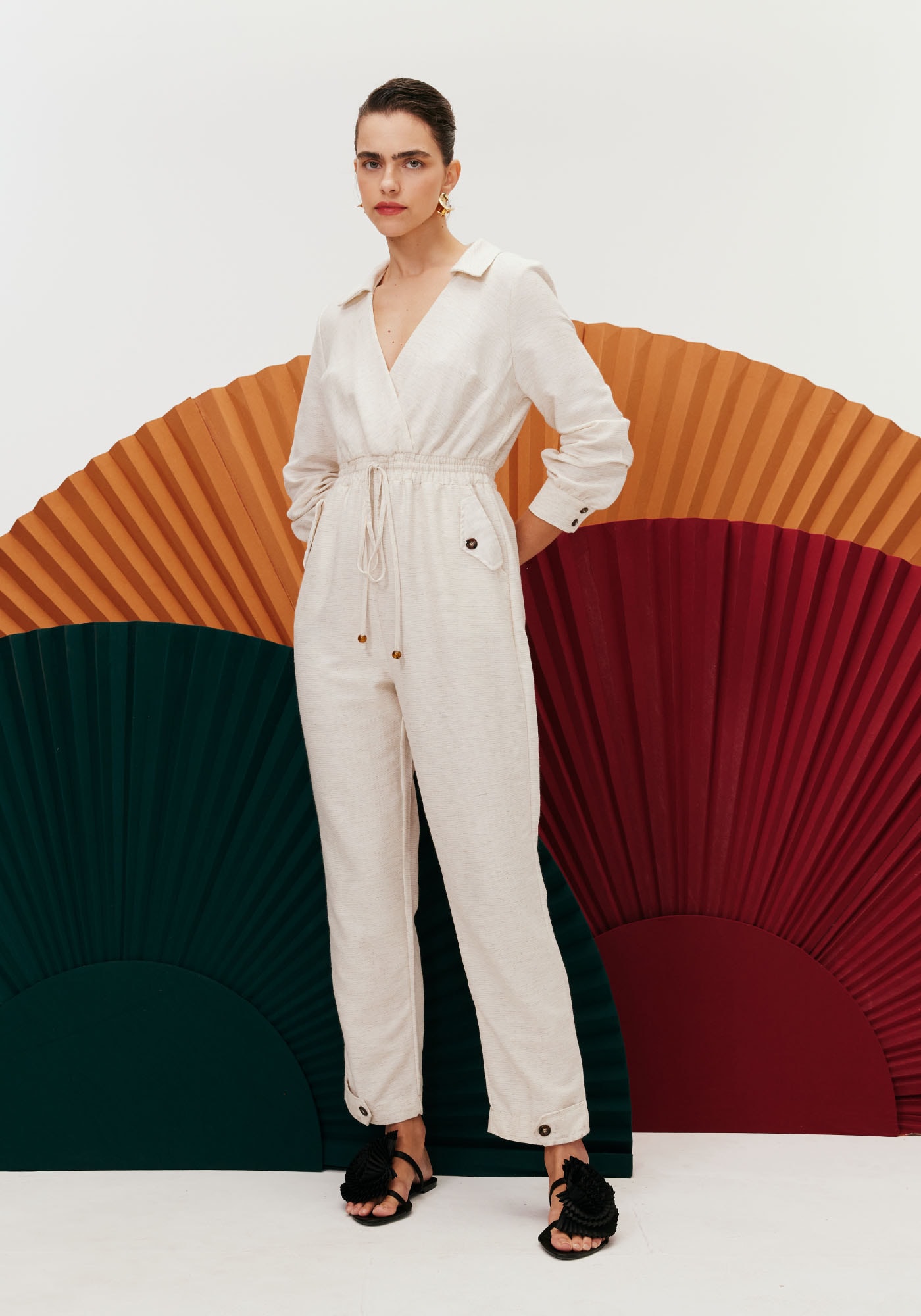 Confeccionado em tecido50% algodão 29% viscose 15% modal e 6% linho, o macacão é uma peça com estiloúnico. Modelo com decote V e aba, possui manga longa com abotoamento e amarraçãoem túnel na cintura finalizada com ponteira. Os bolsos laterais deixam a peçaprática para o uso no dia a dia.
