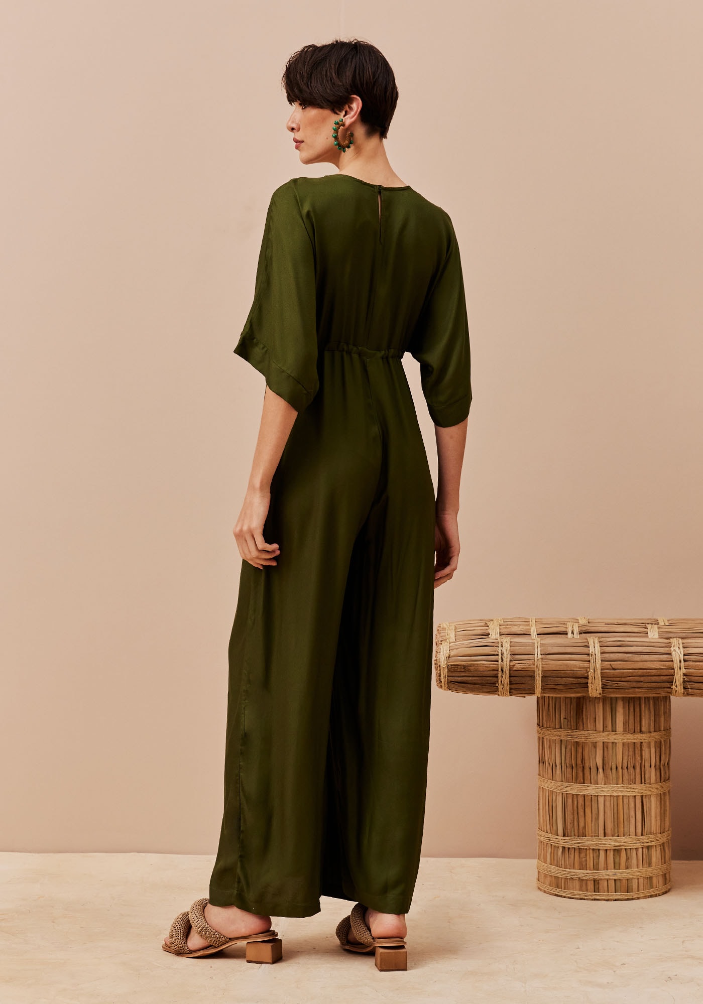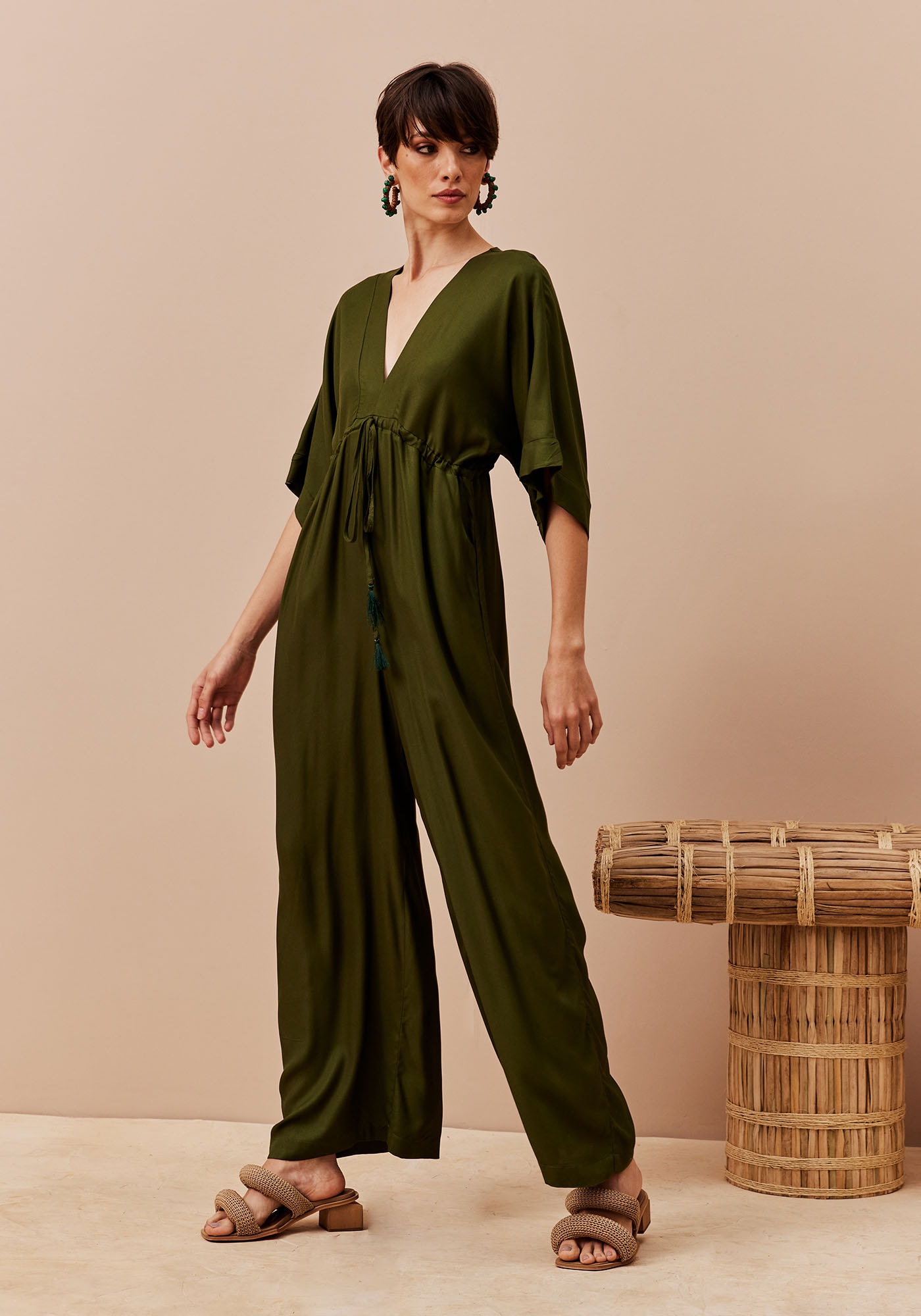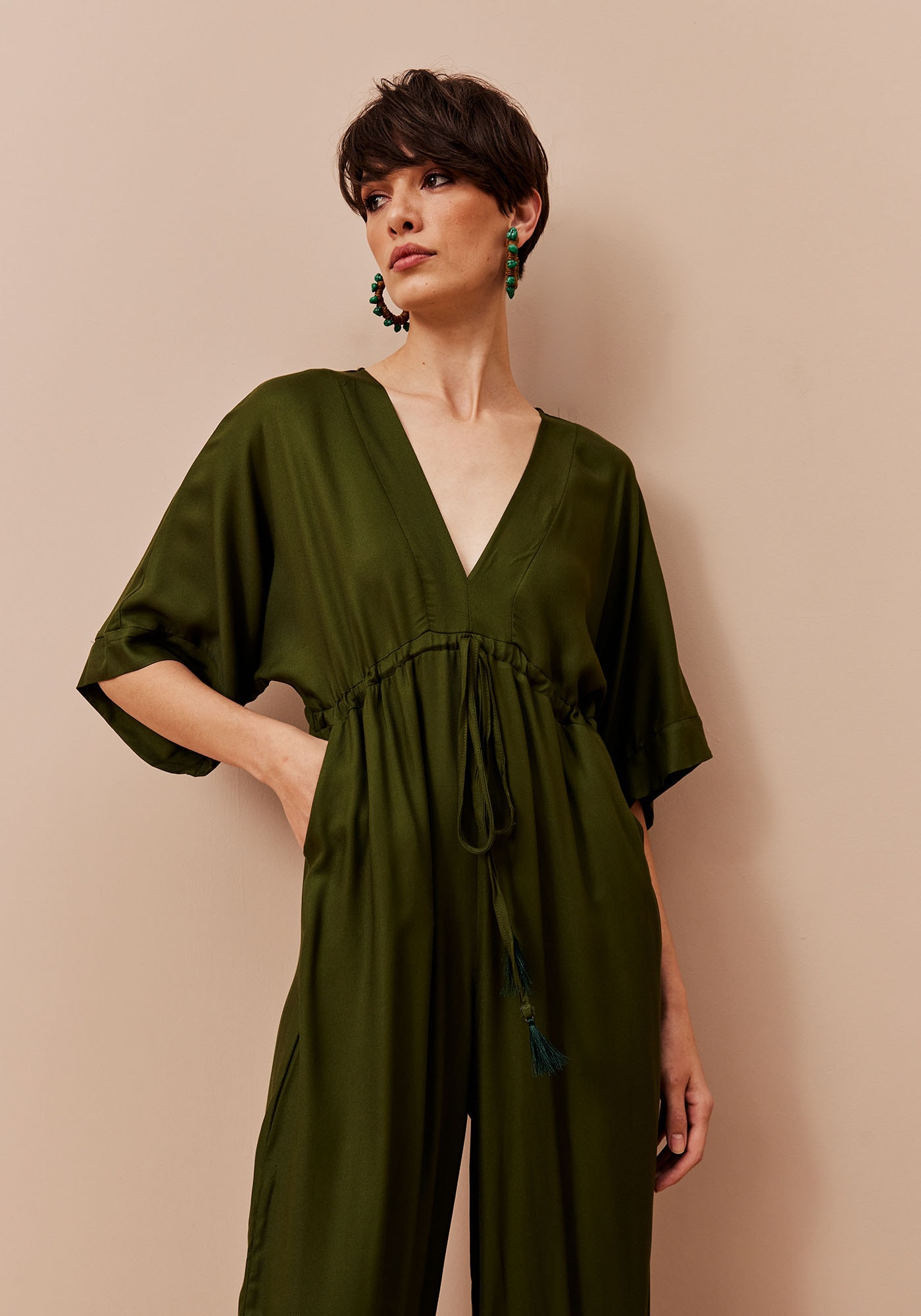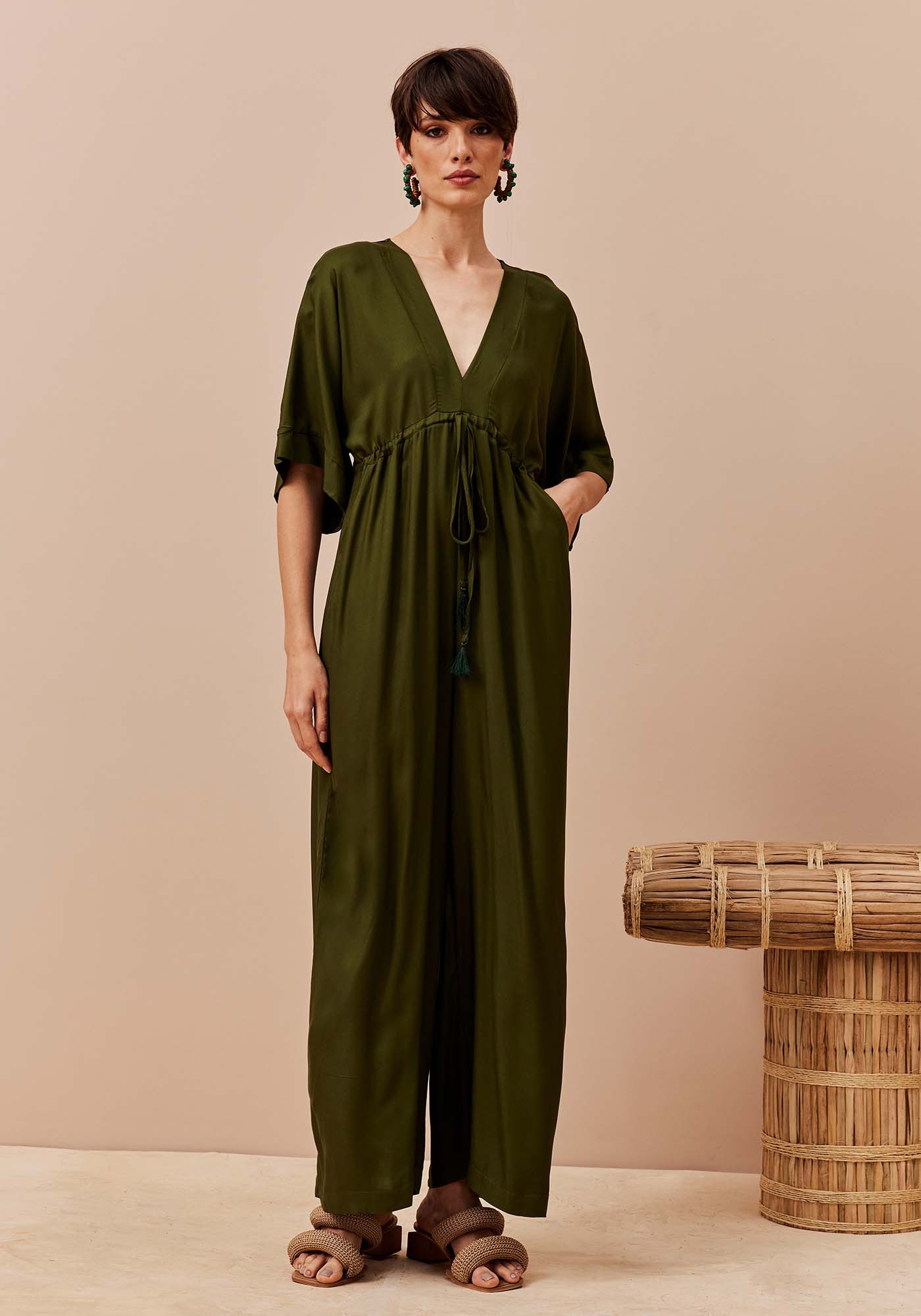 Este Macacão combina sofisticação e conforto em um visual marcante. Apresenta decote profundo em V na parte frontal que valoriza o colo e túnel de amarração abaixo do busto que permite um ajuste personalizado ao corpo valorizando a silhueta. Suas mangas ¾ estilo kimono e calça ampla oferecem leveza e movimento à peça. Possui bolsos frontais que conferem funcionalidade e seu fechamento é em gota no decote das costas. Confeccionado em tecido de composição 100% Viscose, é ideal para compor looks modernos e versáteis.