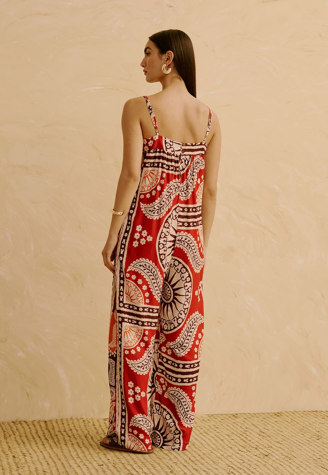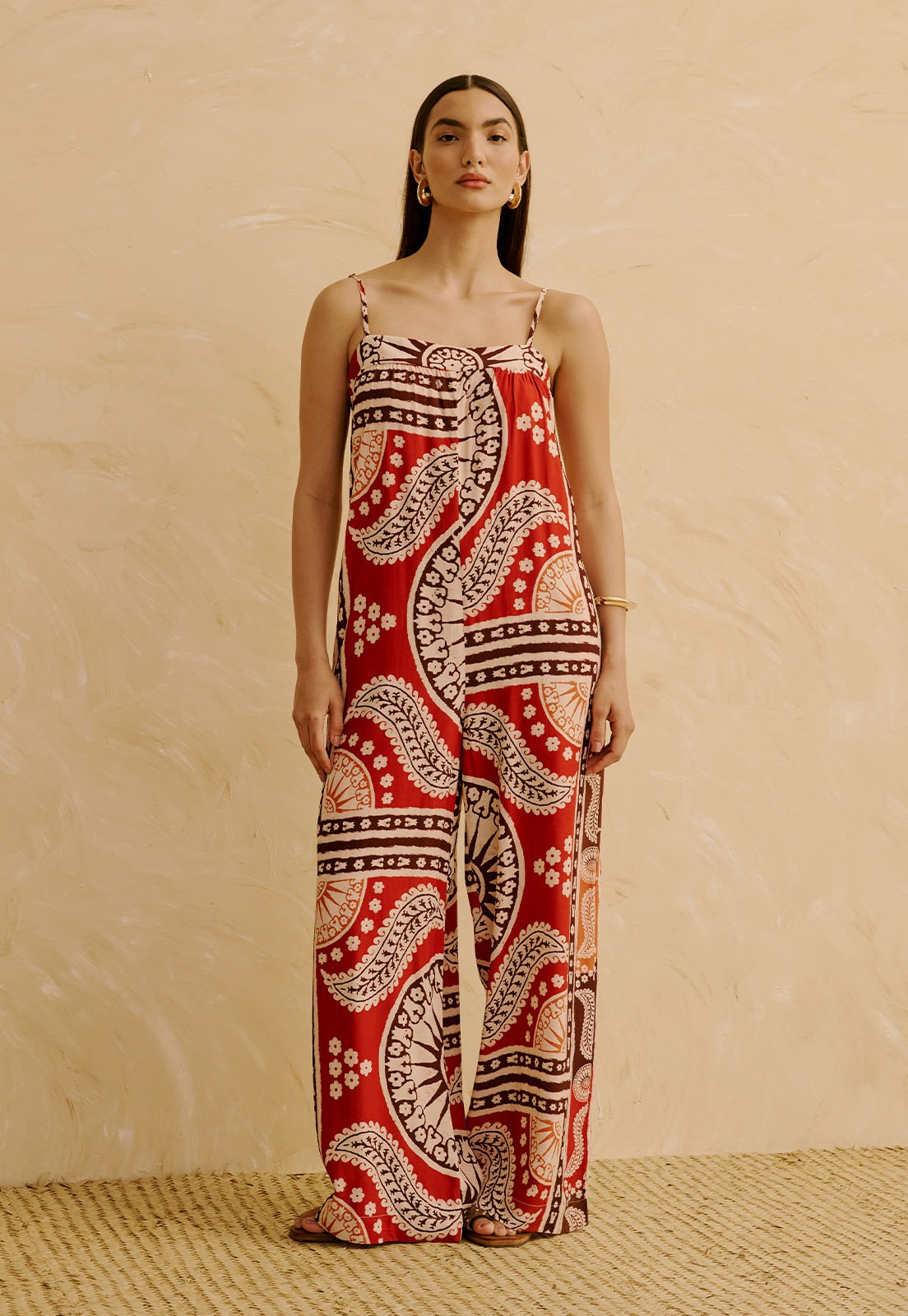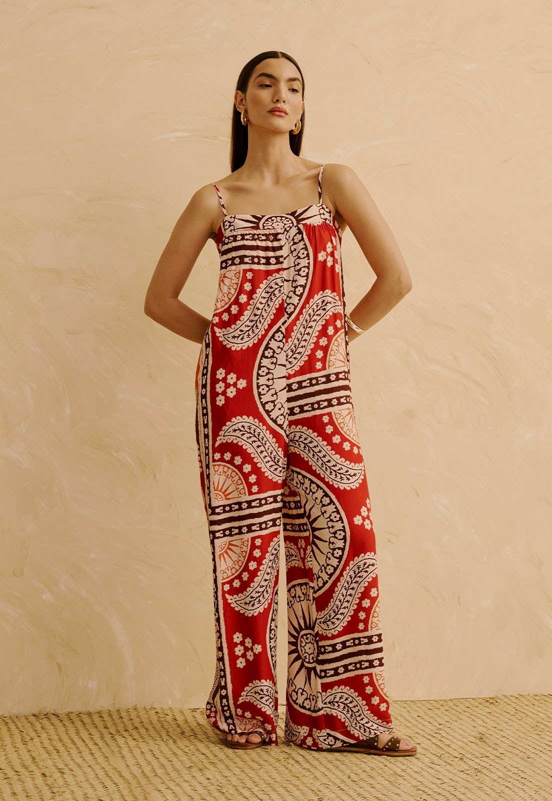 O Macacão com Pala no Busto Estampado Incaica da CaCay tem modelagem ampla e fluida, com caimento solto no quadril e pernas, e ajuste suave no busto graças à pala e às alças finas e reguláveis. A cintura não é marcada, o que favorece o conforto e a liberdade de movimento. A peça tem forma grande. Se estiver em dúvida entre dois tamanhos, recomenda-se optar pelo menor, com base na tabela de medidas disponível. A modelo da foto tem 1,75 m de altura, veste manequim 36 e está usando o tamanho P.