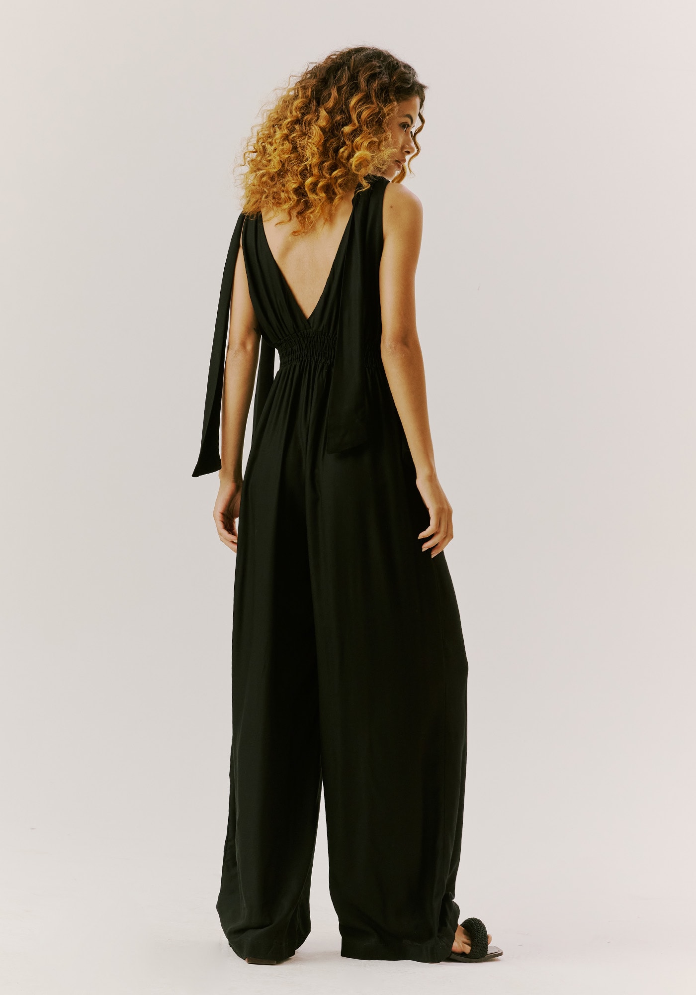 Confeccionado em tecido 100%viscose, o macacão com decote profundo é um modelo elegante possui laços nosombros, decote em V profundo e lastex que deixa a cintura mais marcada. A calçacom modelagem pantalona proporciona mais conforto.