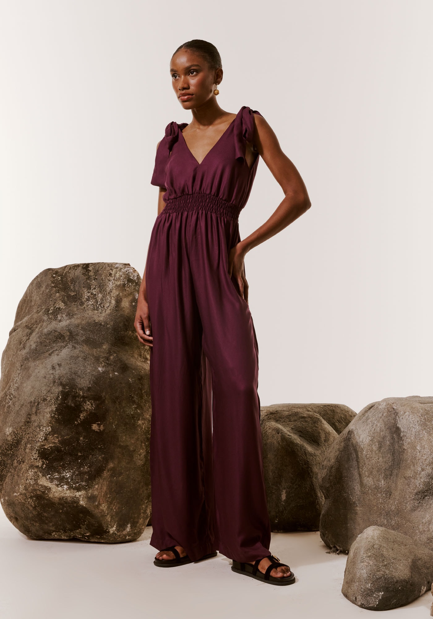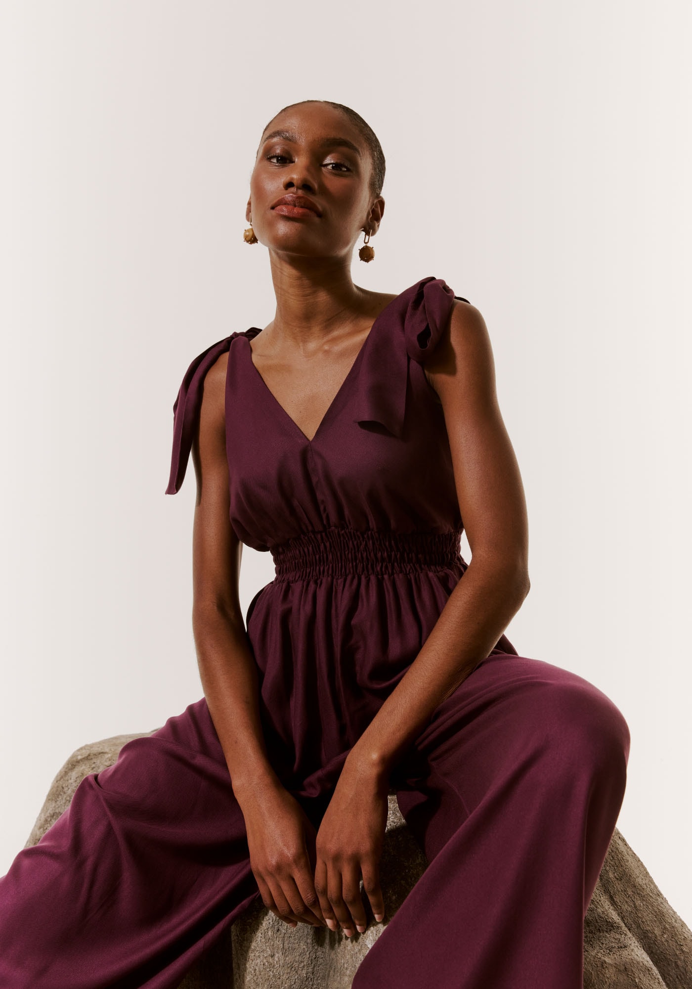 Confeccionado em tecido 100%viscose, o macacão com decote profundo é um modelo elegante possui laços nosombros, decote em V profundo e lastex que deixa a cintura mais marcada. A calçacom modelagem pantalona proporciona mais conforto.