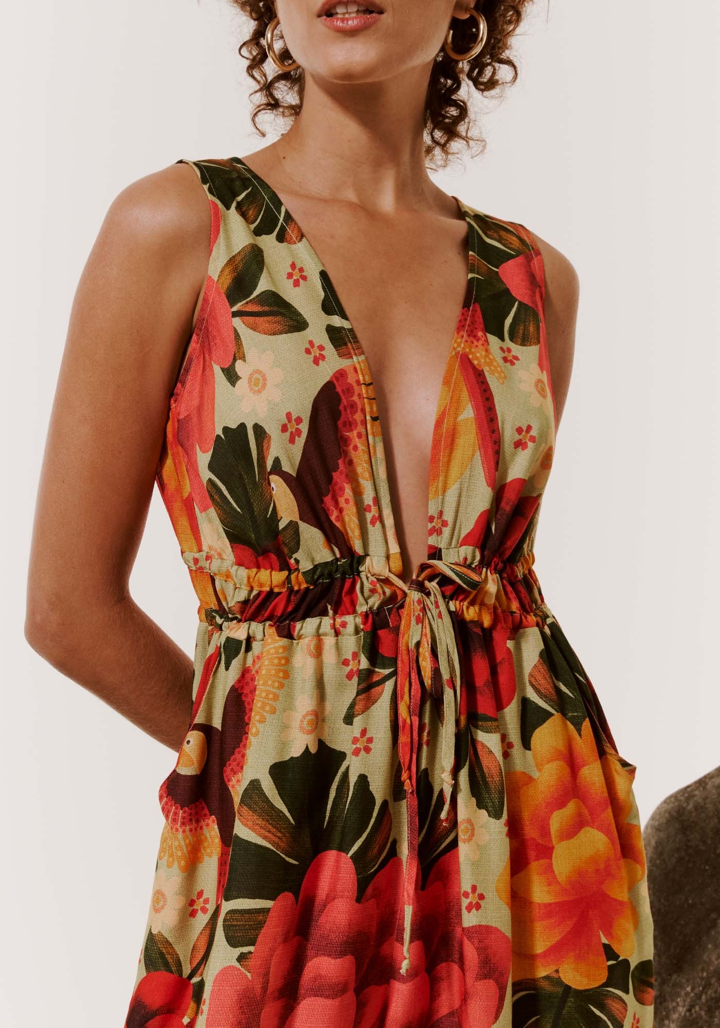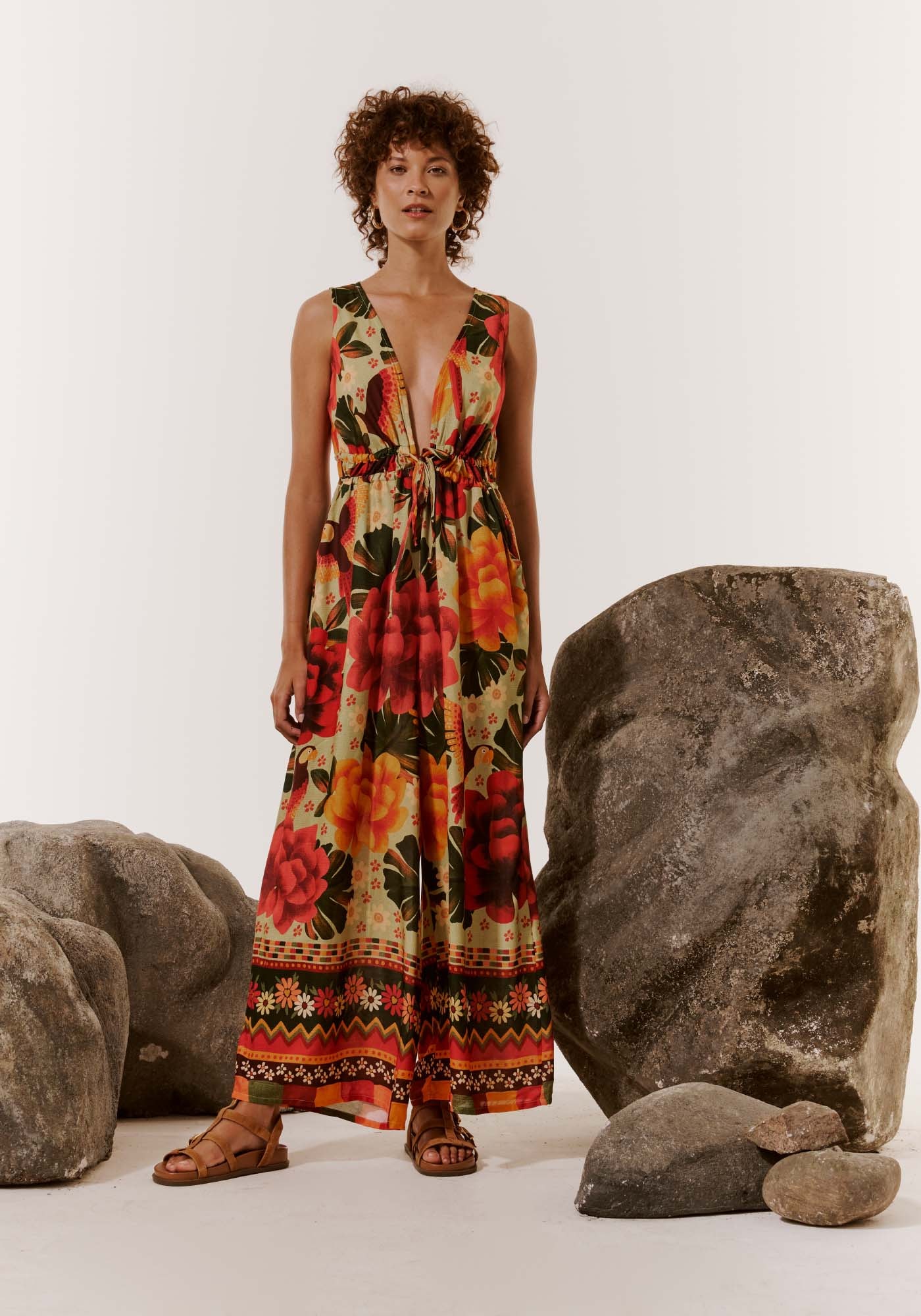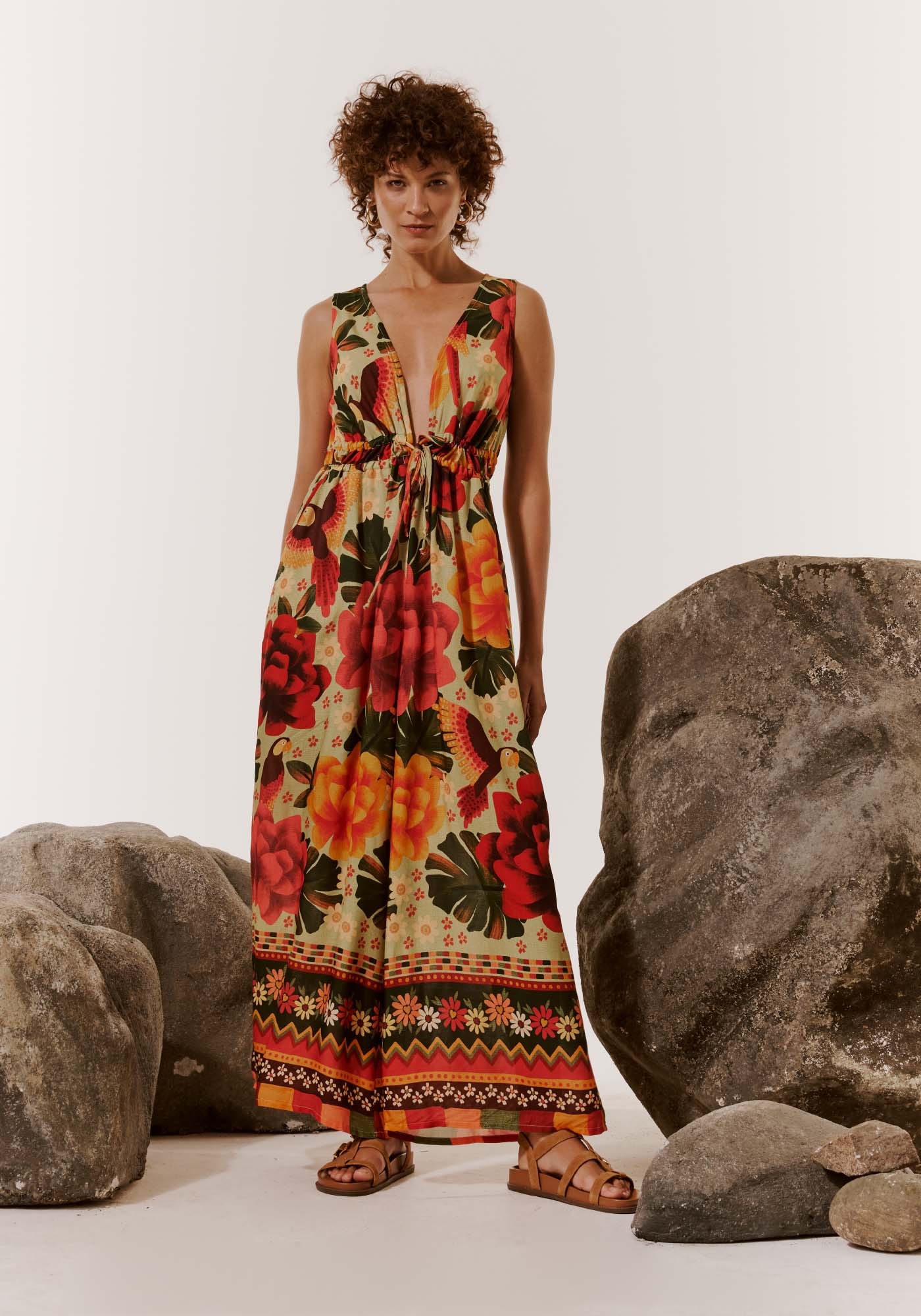 Encantador e ousado, este lindovestido longo possui um decote profundo que se finaliza em uma bela amarraçãode dois túneis, que contribuem para o ajuste da cintura. Confeccionado com tecido100% viscose, conta também com dois bolsos laterais. O comprimento amploproporciona maior conforto e liberdade de movimento.