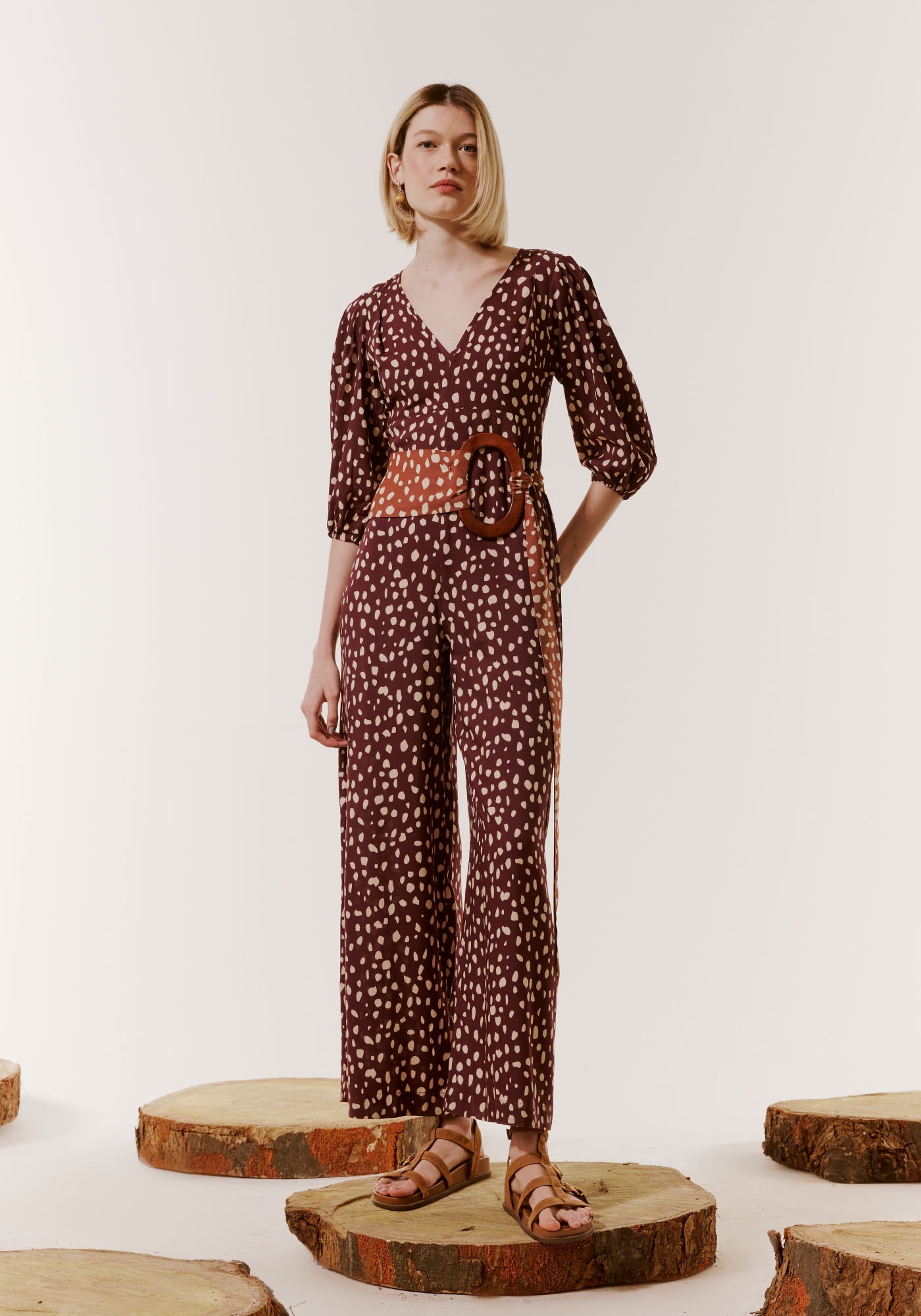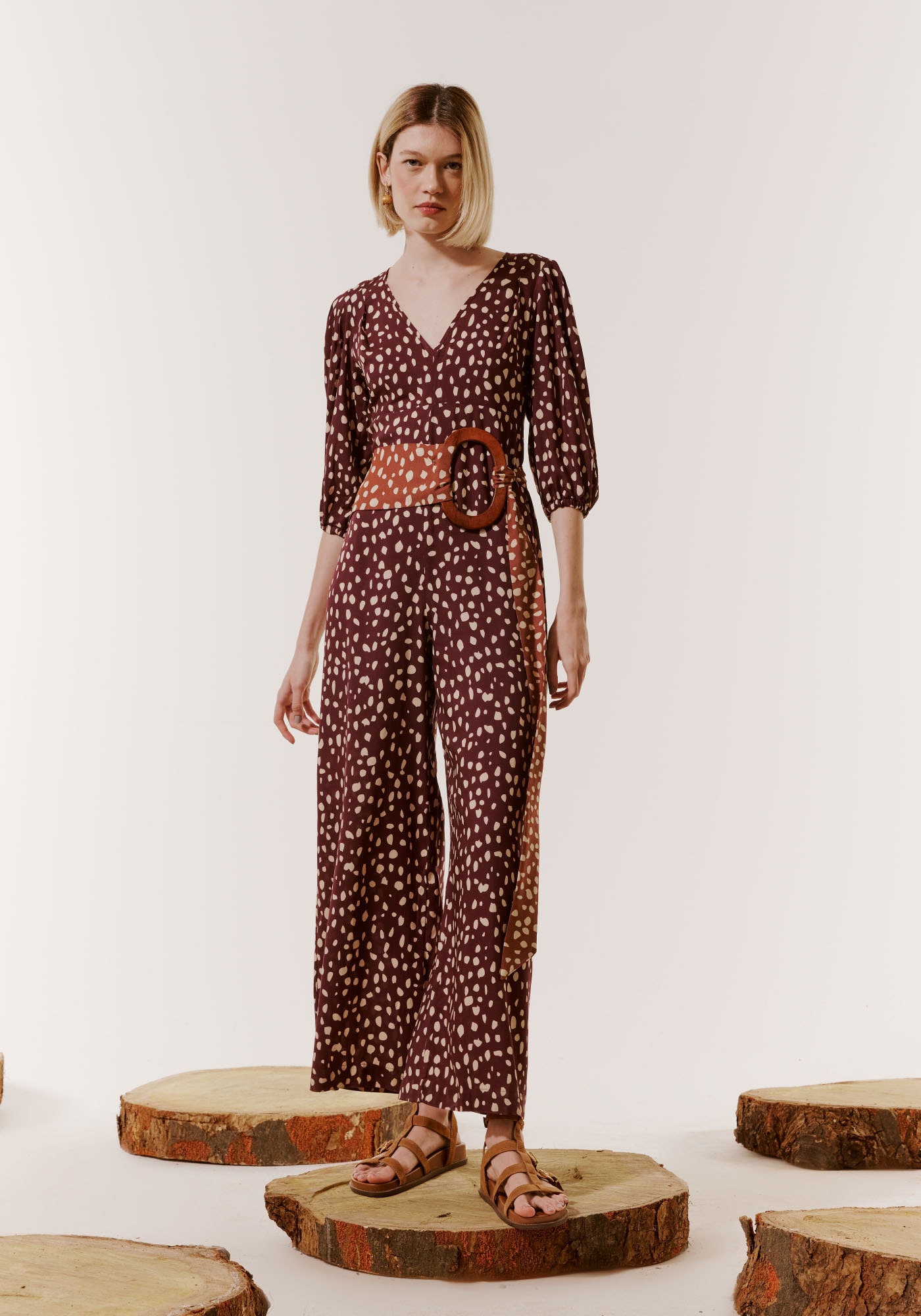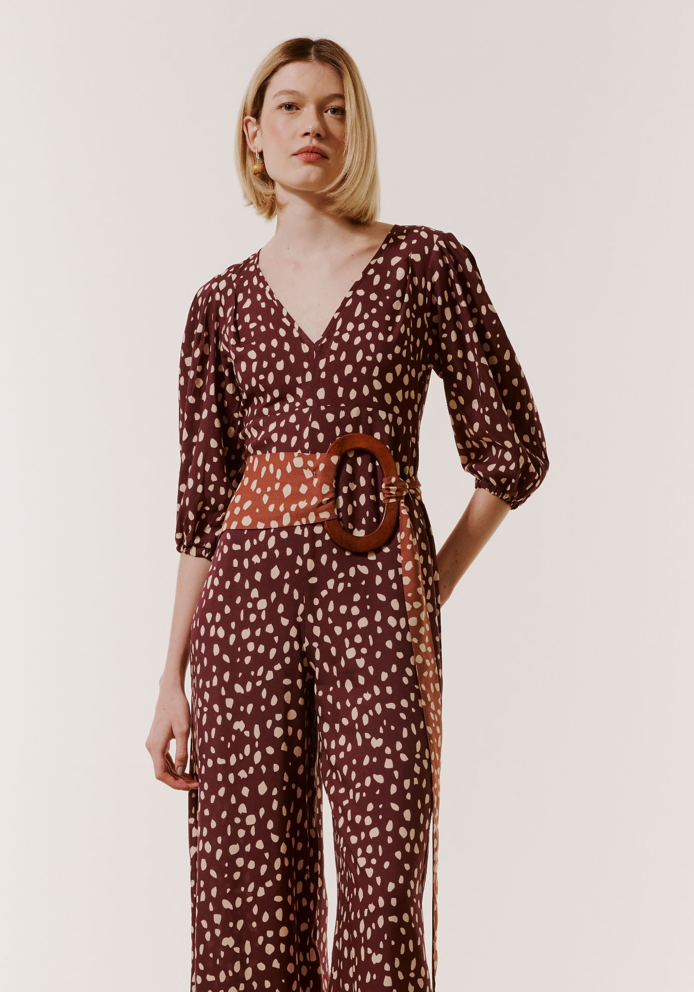 Omacacão é uma peça super versátil.Confeccionado em tecido 100% viscose,esse modelo possui decote profundo em V e manga 3/4 bufante. Tem uma modelagemmais ajustada ao corpo e calça pantalona.