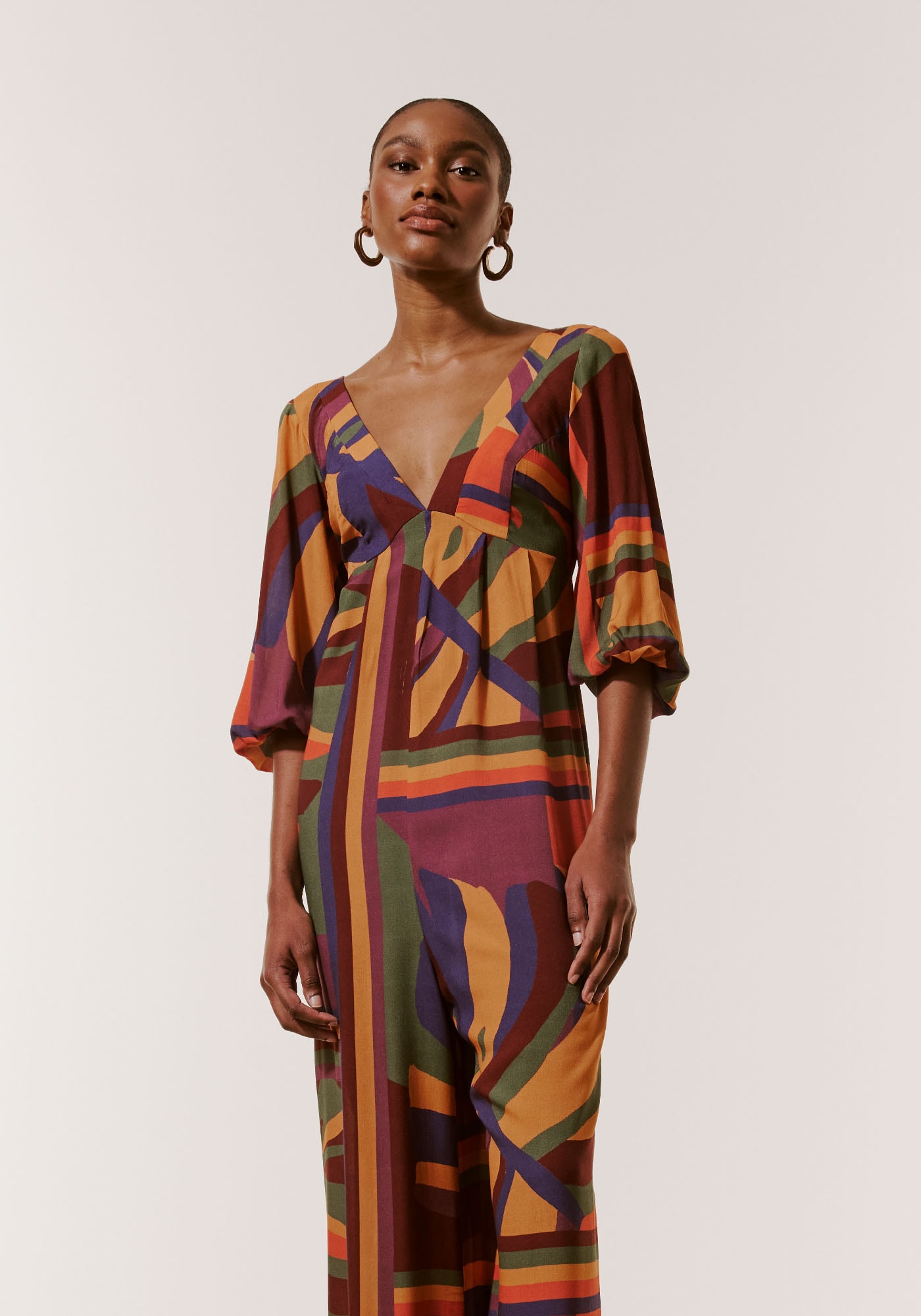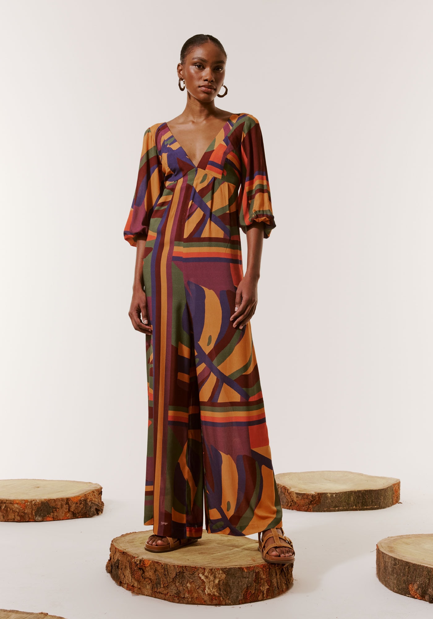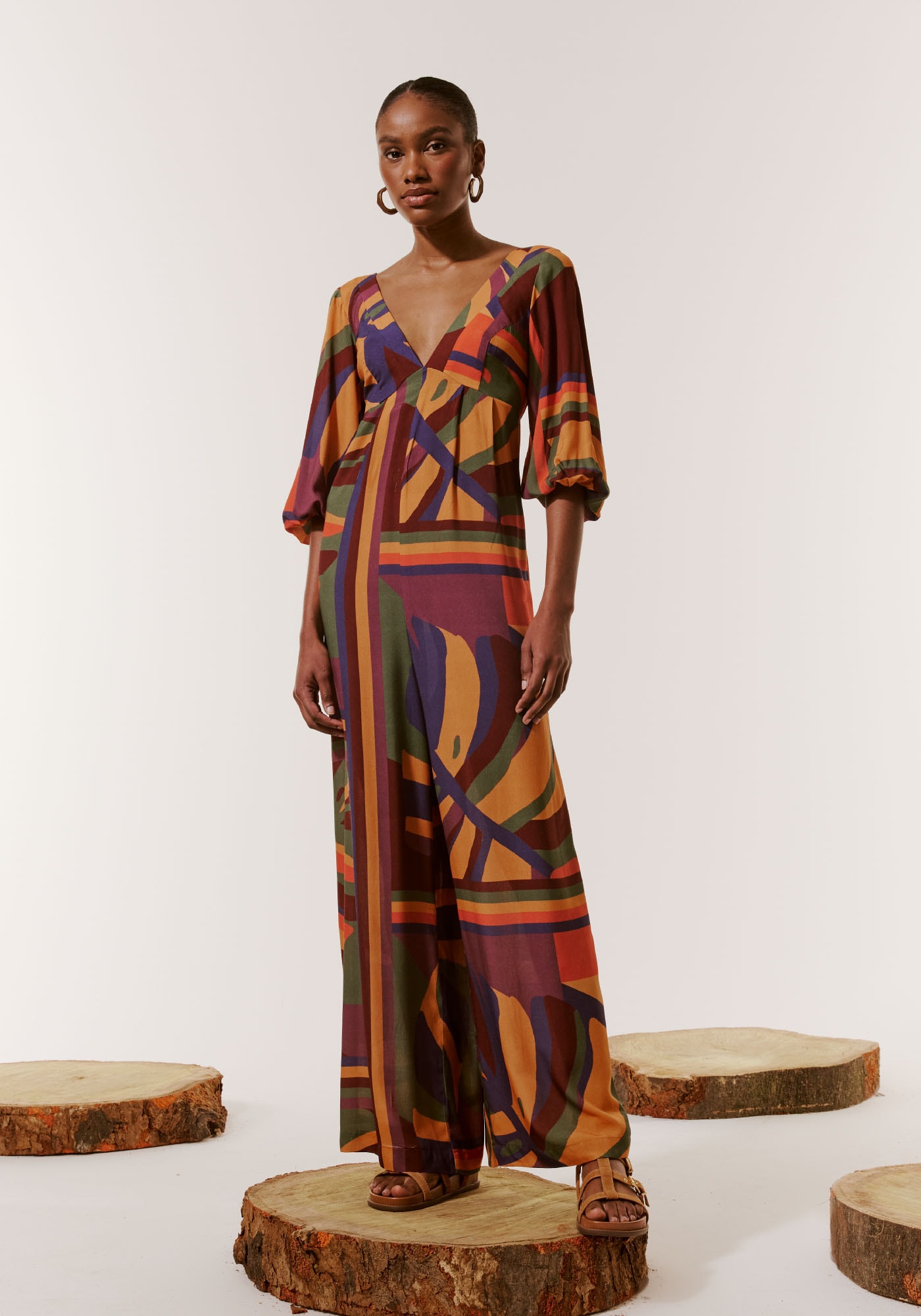 O macacão estampado é um modelo elegante. Confeccionadoem tecido 100% viscose, o modelo possui decote profundo em V e manga ¾ bufantecom elástico. O shape com calça pantalona mais solto é super confortável.