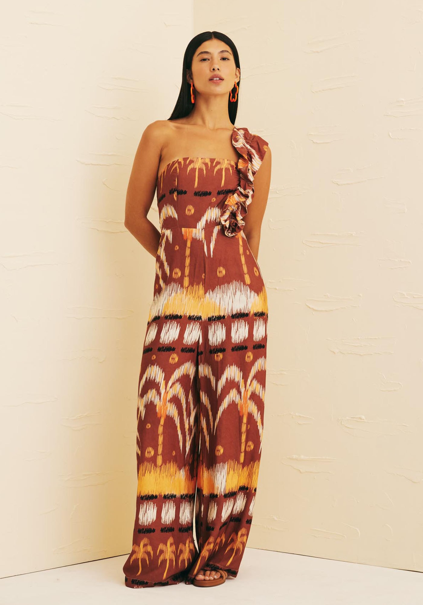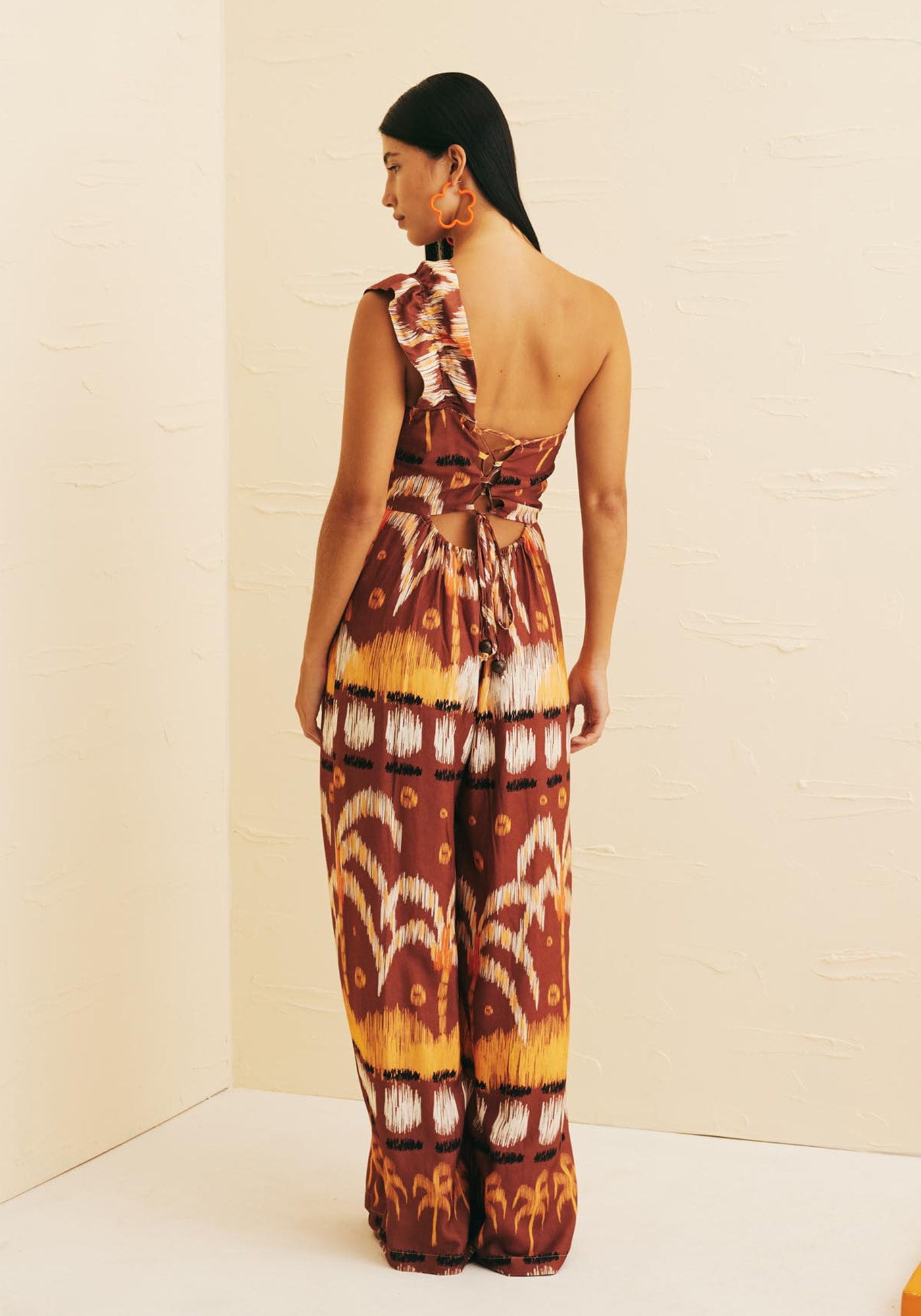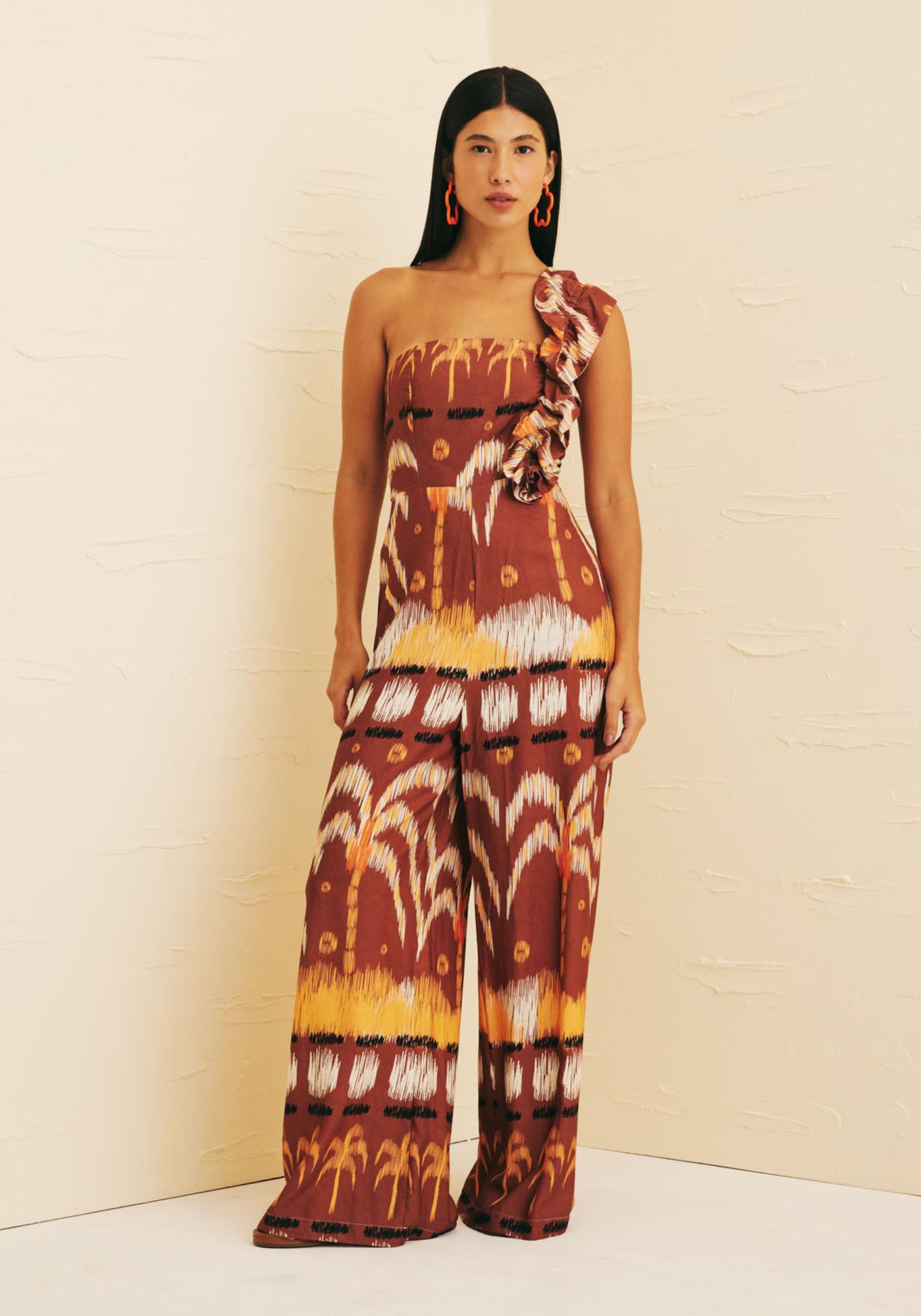 Confeccionado em tecido 100% viscose, omacacão estampado é simplesmente maravilhoso. Modelo de um ombro só, possuialça com babado, o que dá um destaque e charme para a peça. A parte de trás comamarração cruzada e a calça estilo pantalona valorizam ainda mais a peça.