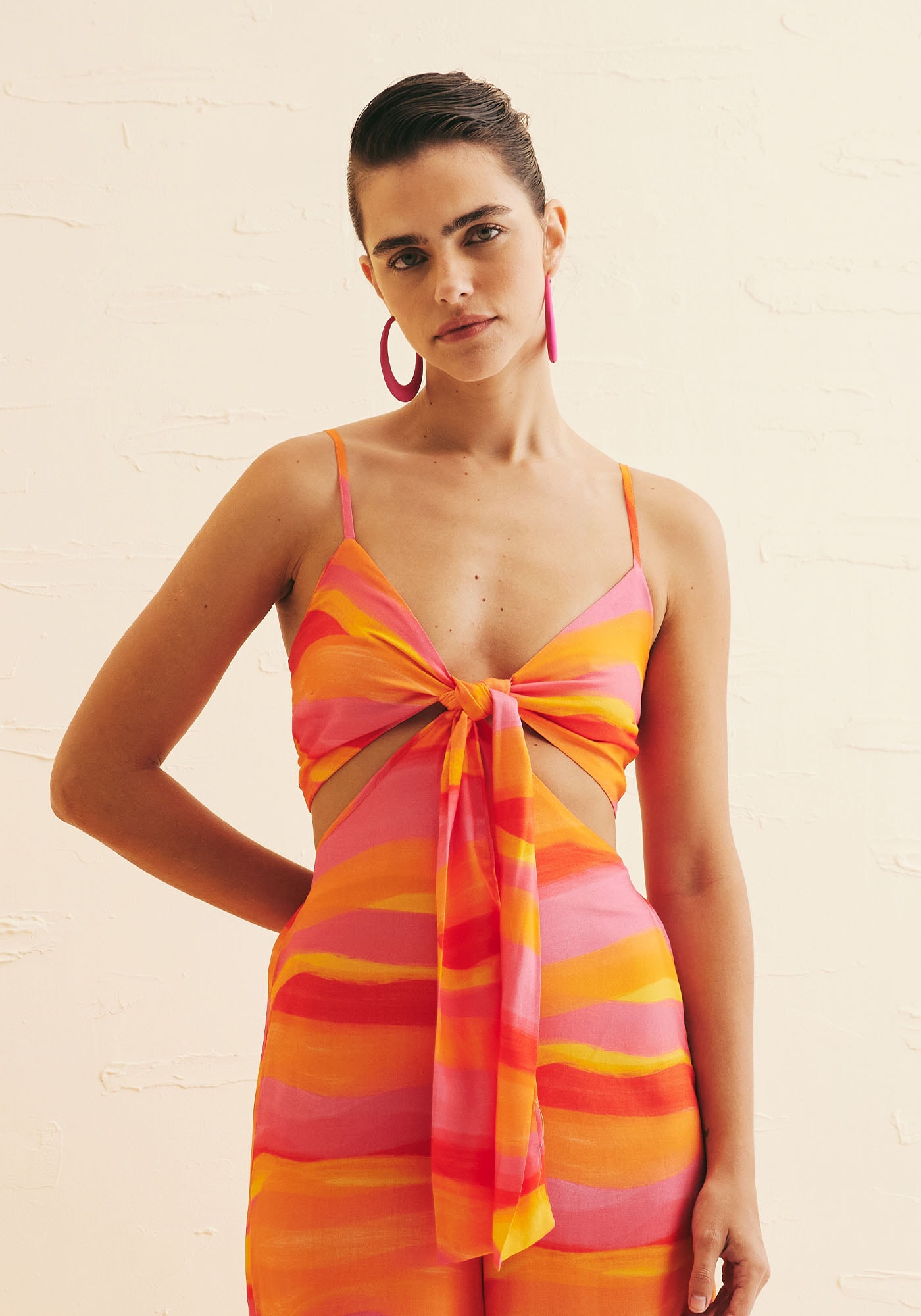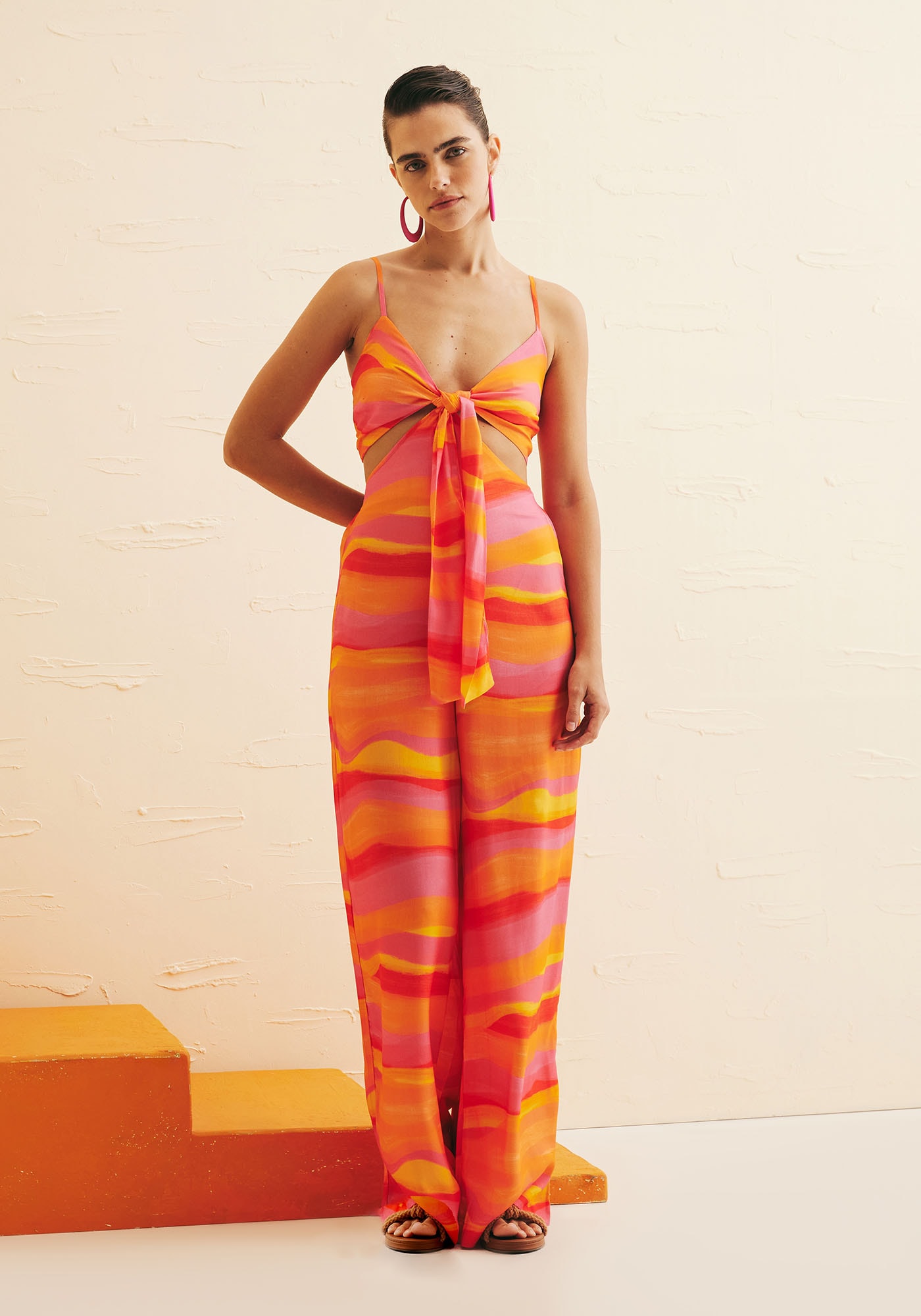 OMacacão Detalhe Amarração Estampado Jujuy é a escolha ideal para quem busca umlook moderno e estiloso. Com amarração frontal e recortes, ele destaca acintura valorizando a silhueta e oferece ajuste personalizado, devido ao seulastex nas costas. Possui decote frontal em V e suas alças são finas eajustáveis adicionando um toque de ousadia e valorizando a região do colo,enquanto a sua calça é de amplitude pantalona e proporciona muito estilo econforto. É confeccionado em 100% viscose.