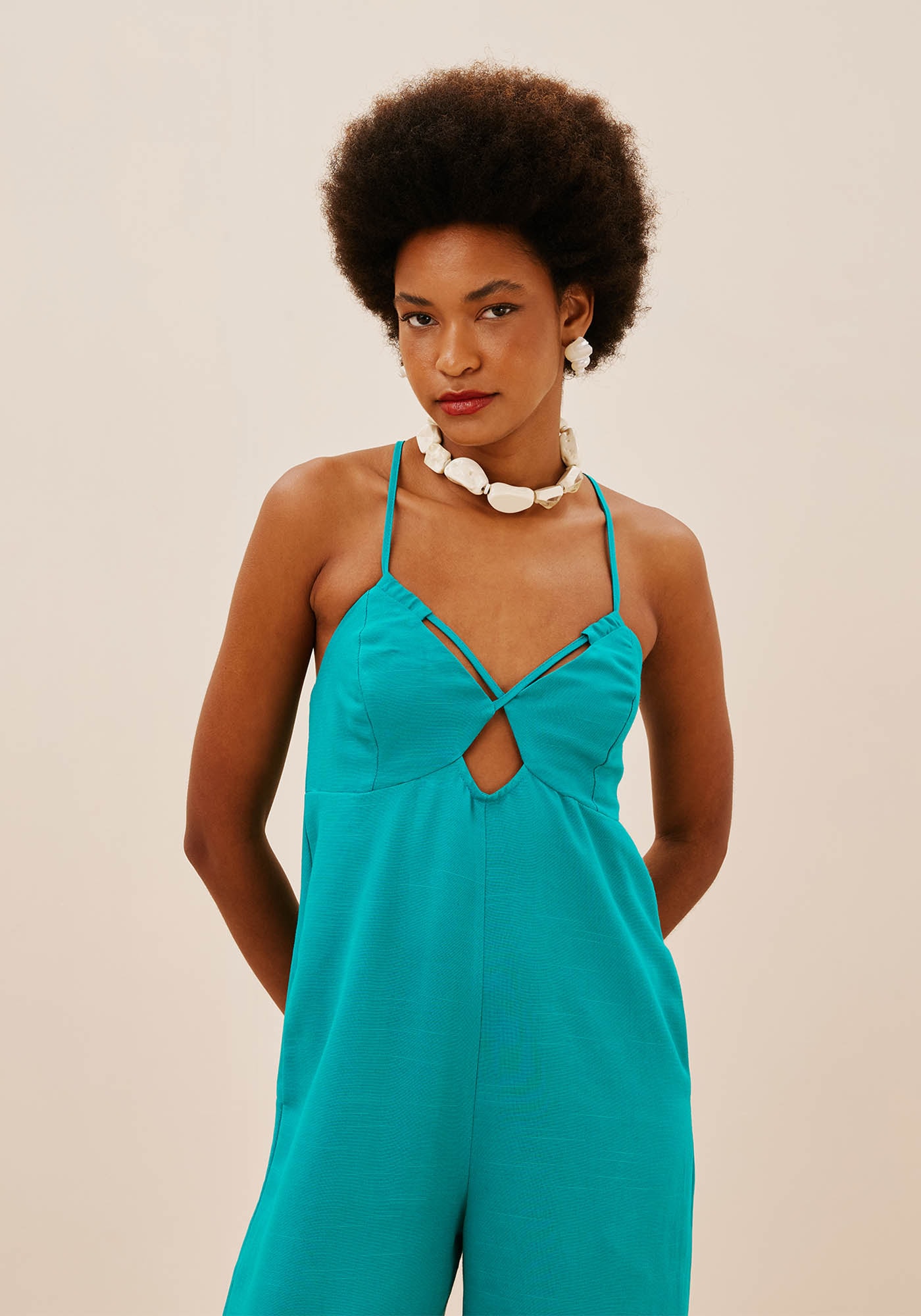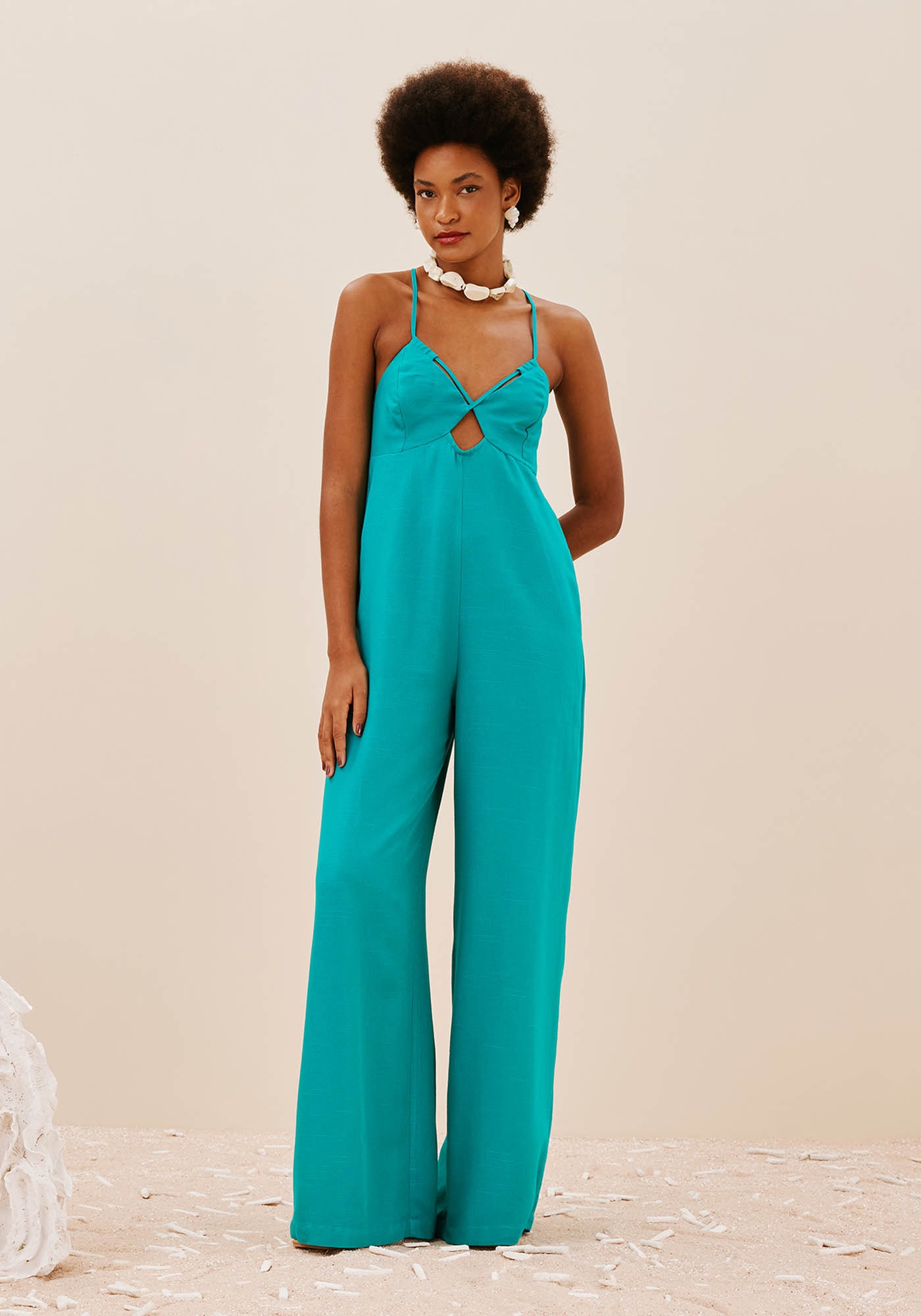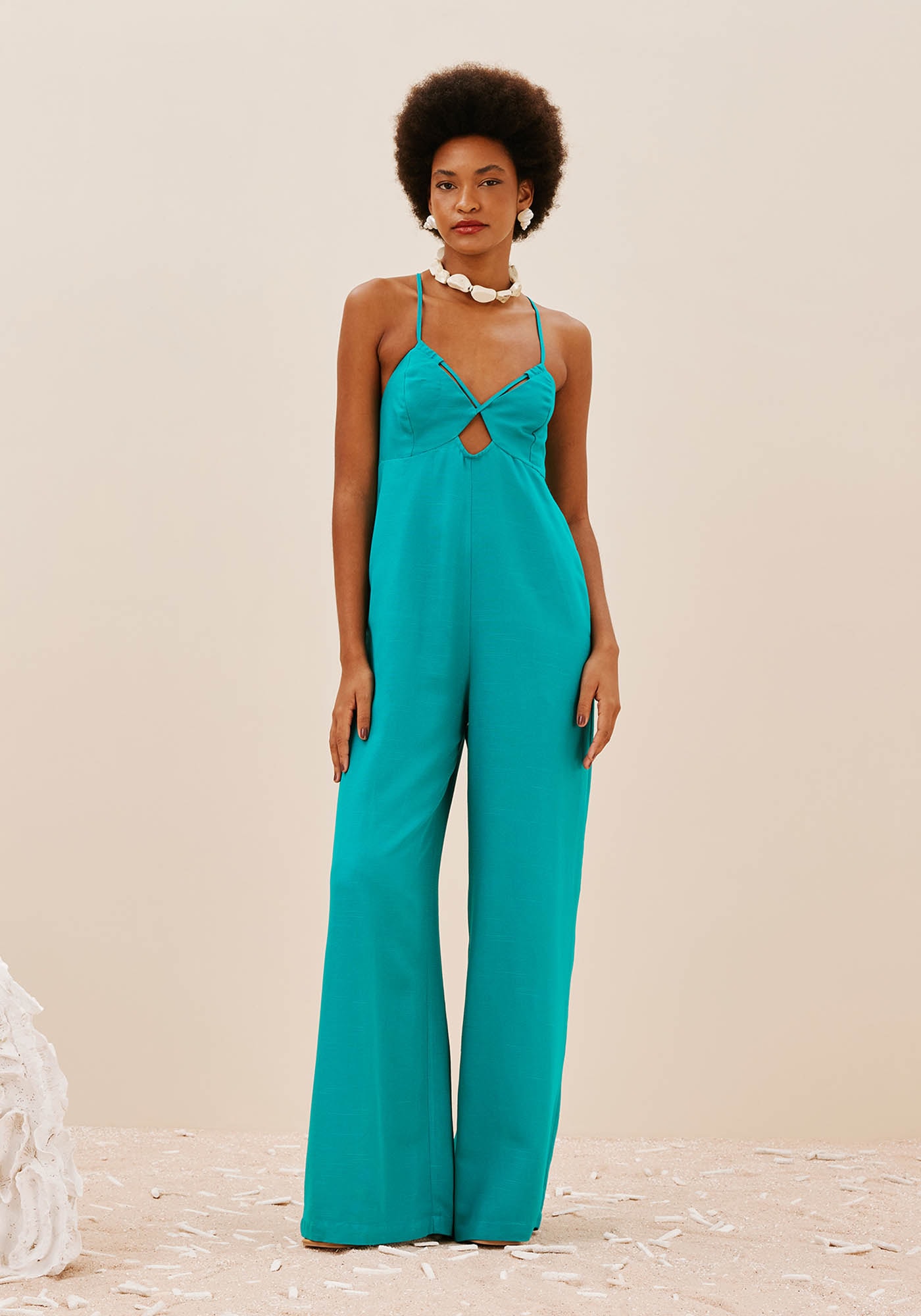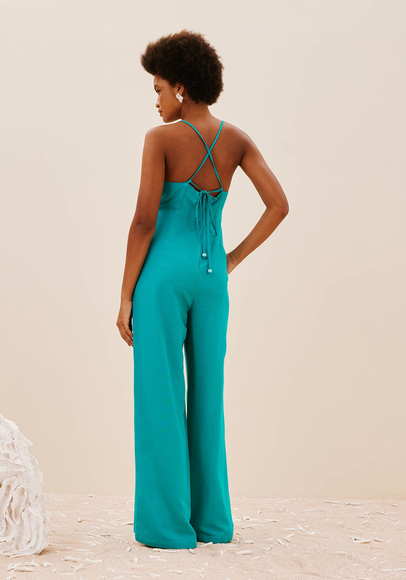 O macacão em cor lisa é confeccionado em tecido61% viscose e 39% algodão. O modelo possui alça fina, que pode facilmente serajustada e amarrada nas costas e o decote ajustado ao busto, com o detalhe daaselha, que deixa o modelo mais charmoso