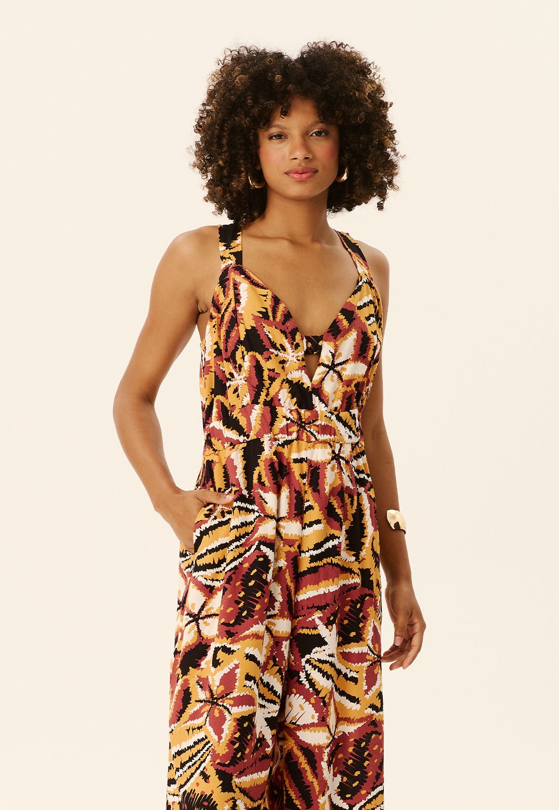 O Macacão Detalhe Elástico Frente Estampado Lambada é a escolha ideal para quem busca estilo com conforto. Feito em 100% viscose, oferece toque leve e caimento fluido, perfeito para dias quentes ou ocasiões casuais com um toque sofisticado. O decote em V e as alças largas valorizam o colo com elegância, enquanto o elástico frontal coberto por faixa amarrada garante ajuste confortável e destaca a cintura de forma natural. A estampa abstrata e artística adiciona personalidade à peça sem exageros, tornando-a versátil para diferentes momentos do dia.