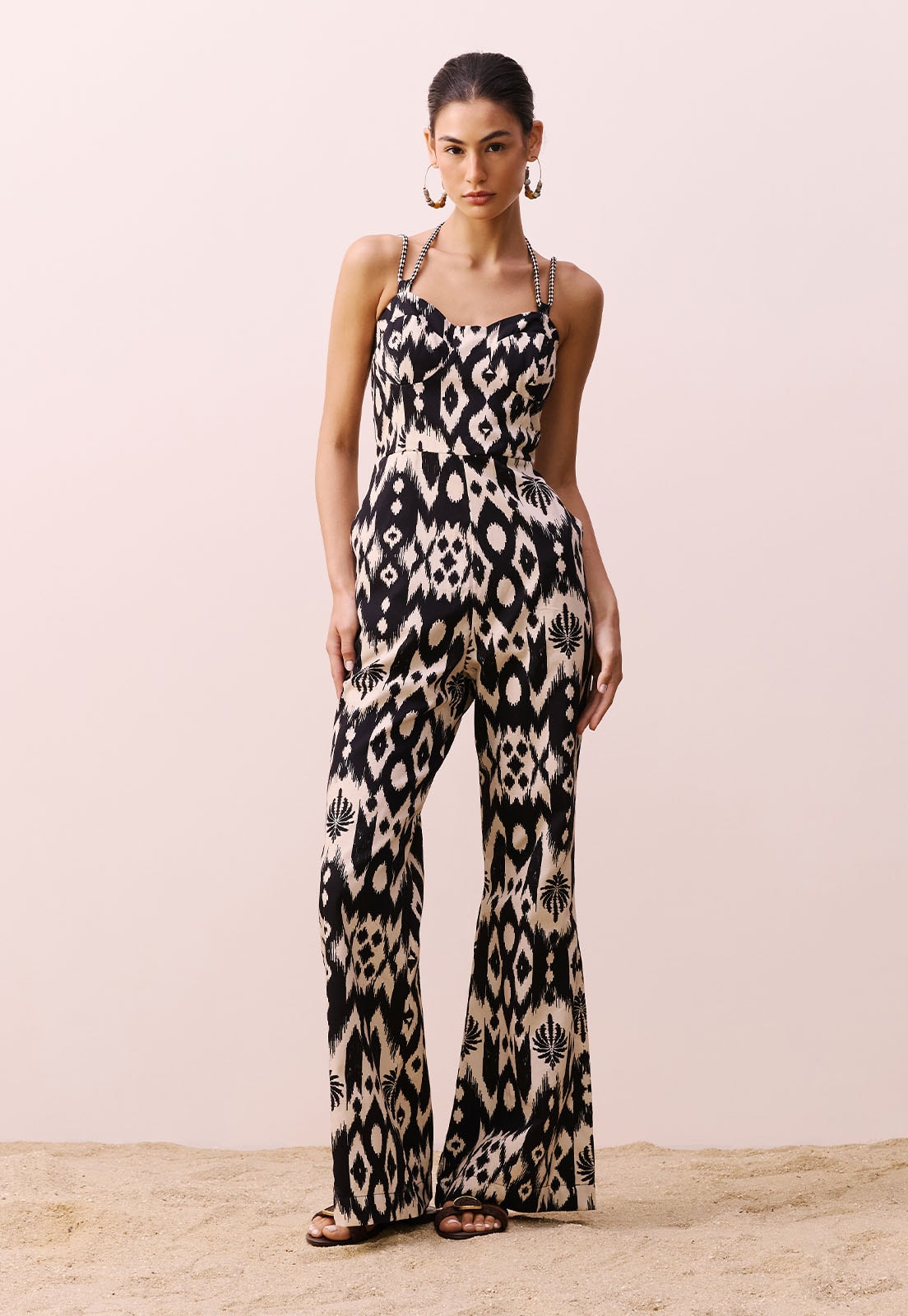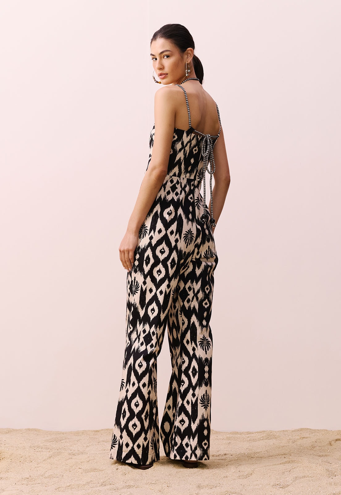 O Macacão Flare Estampado Tucum da CaCay é a escolha ideal para quem busca sofisticação com leveza. Confeccionado em 100% algodão, seu toque natural garante conforto absoluto em qualquer ocasião. O design valoriza a silhueta com alças finas que se cruzam nas costas e formam um laço ajustável, enquanto a modelagem flare traz movimento e elegância ao caminhar. A estampa combina elementos geométricos e naturais em um padrão exclusivo, que adiciona personalidade sem exageros.