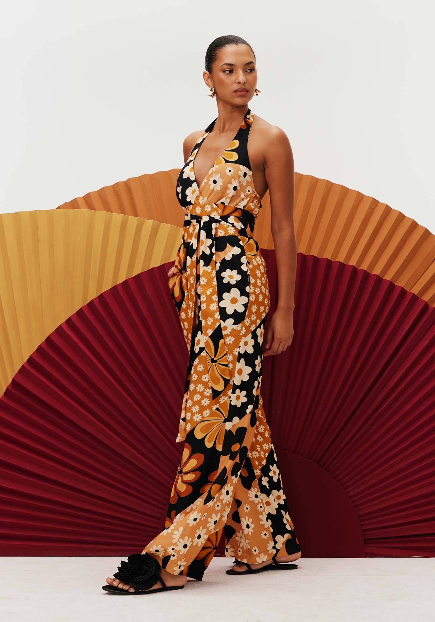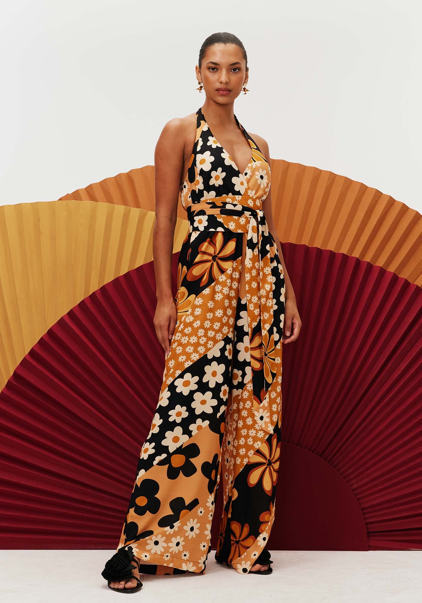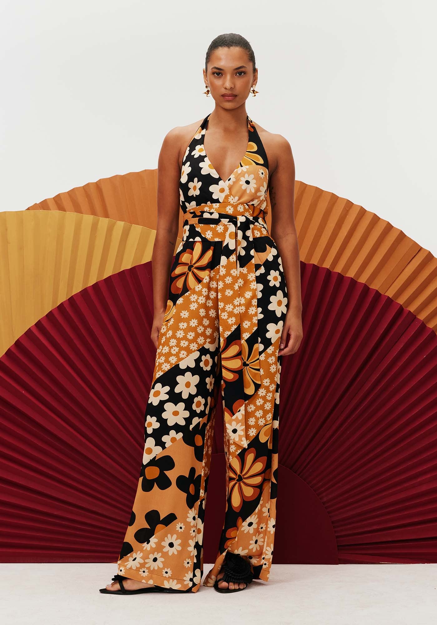 Confeccionadocom decote frente única, o macacão possui pala na cintura, valorizando edeixando-a marcada. A calça mais solta modelo pantalona deixa o visual maismoderno. Os bolsos laterais deixam o modelo mais prático para o uso no dia adia.
