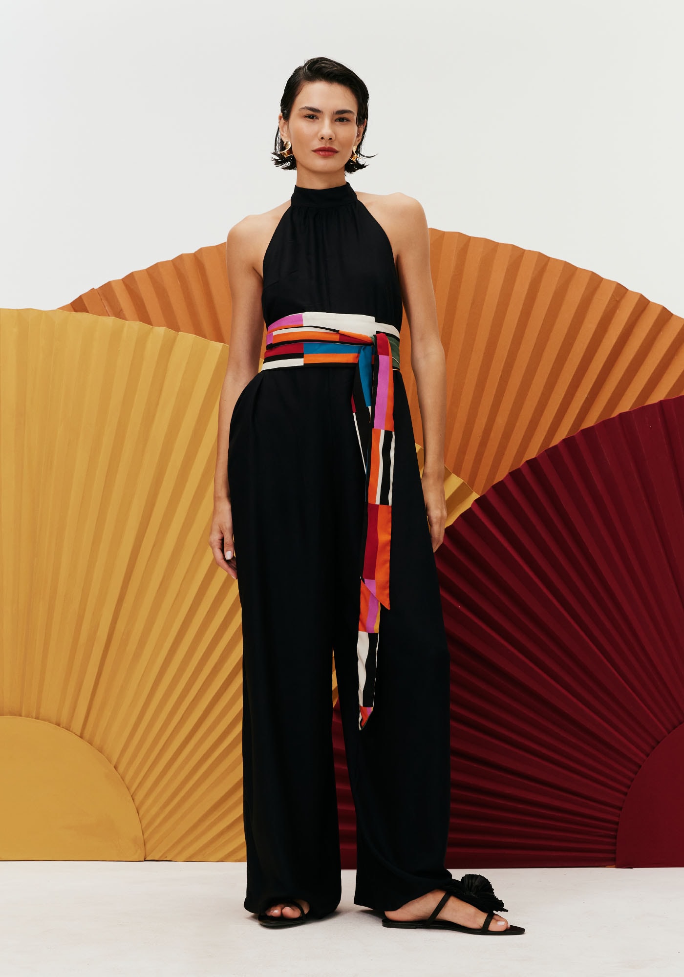 Confeccionado em tecido100% viscose, o macacão é um modelo sofisticado e elegante, que pode ser usadoem diferentes ocasiões. O modelo possui shape solto e decote alto com golaamarrada na parte de trás. As costas nuas deixam a peça mais sensual.