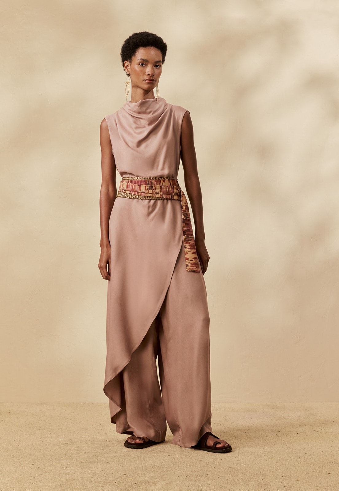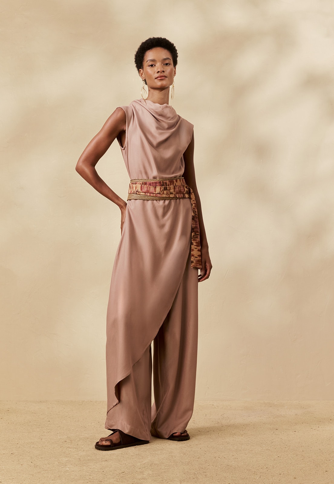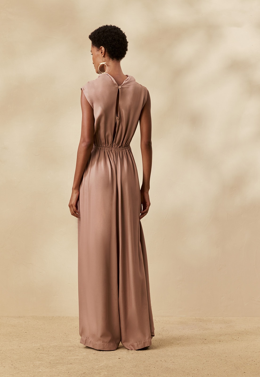 Confeccionado em 100% viscose, o macacão tem toque macio, é leve e não possui elasticidade, ideal para uso prolongado com conforto térmico e fluidez ao caminhar. A peça traz uma proposta atemporal e sofisticada. Combine com sandálias de linhas simples, cintos ou acessórios marcantes para diferentes leituras do look.