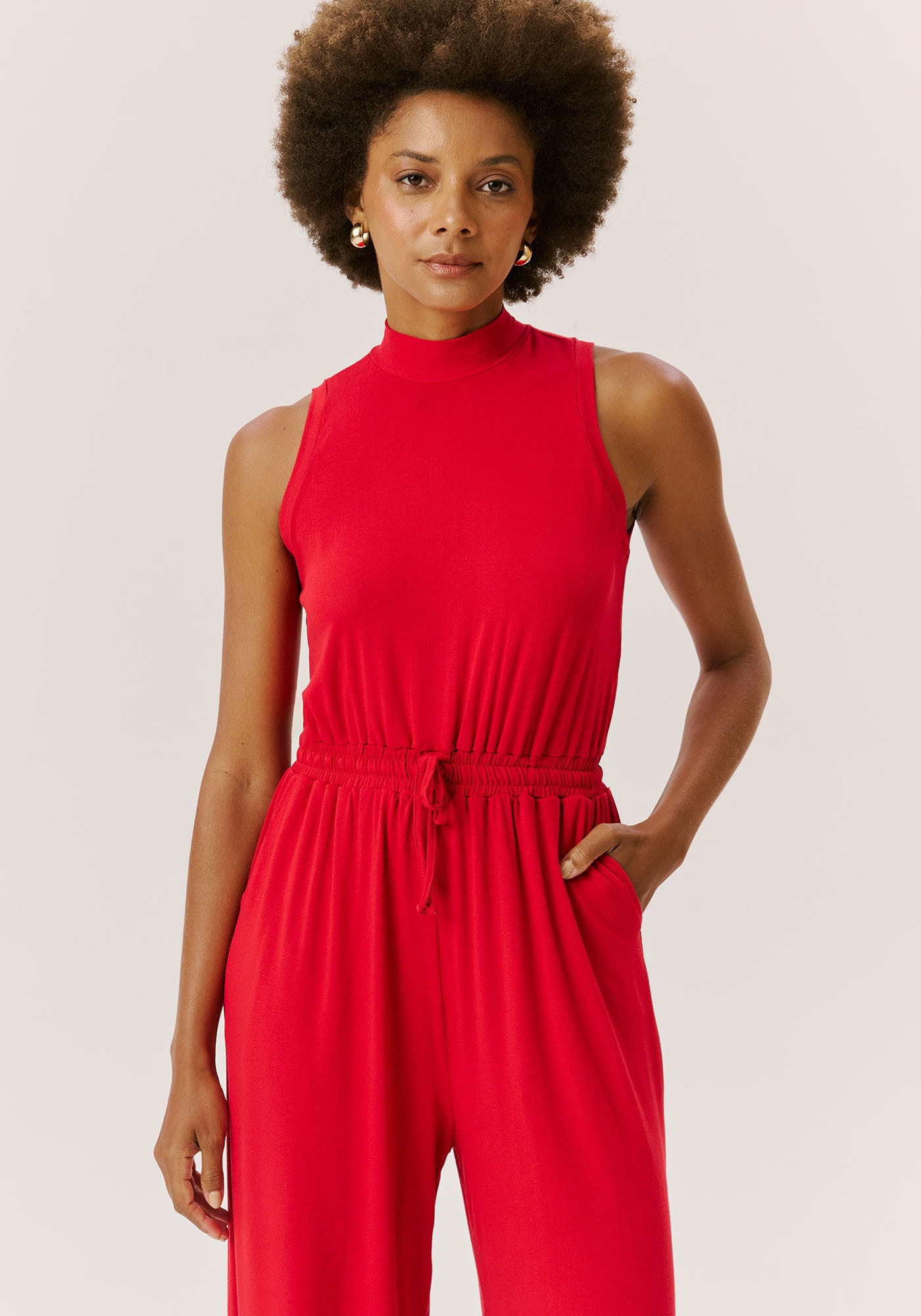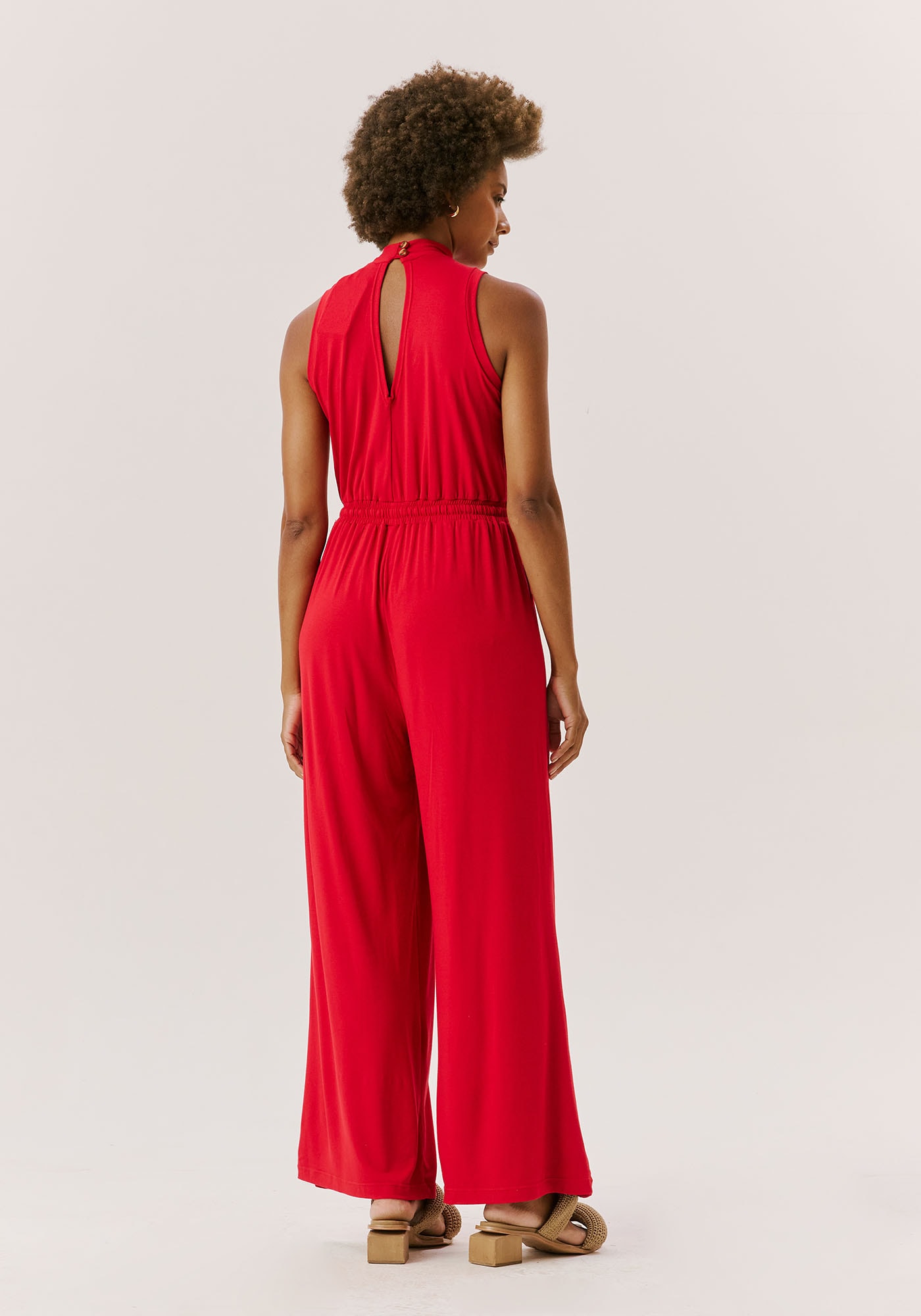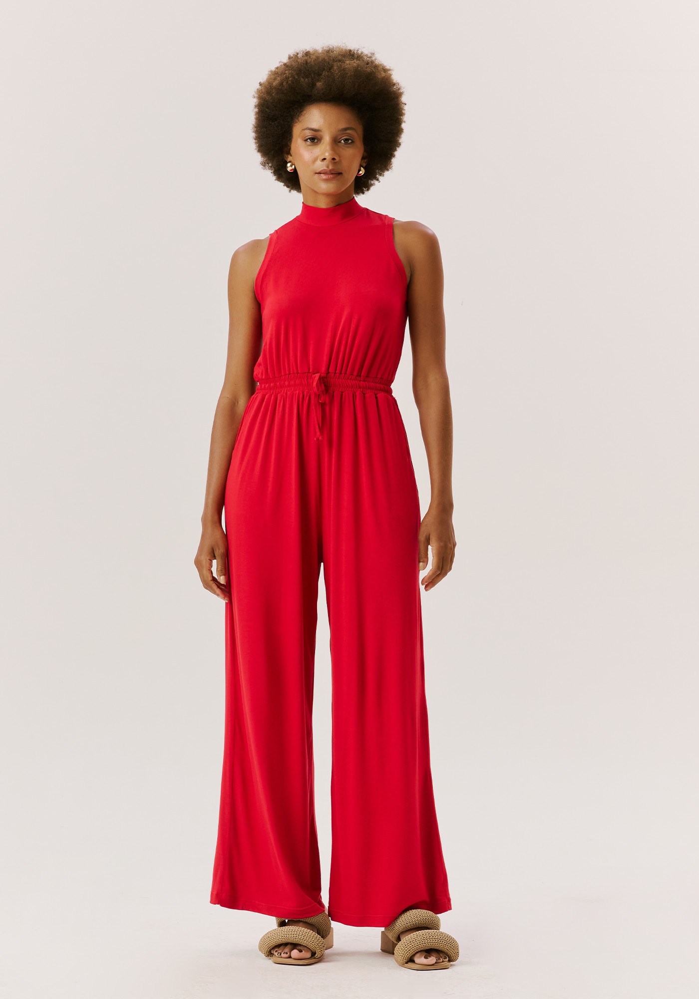 Confeccionadoem malha, 96% viscose 4% elastano, o macacão mistura conforto e estilo. Omodelo sem manga possui uma modelagem ampla com elástico na cintura e golaalta, dando um toque mais sofisticado para a peça.