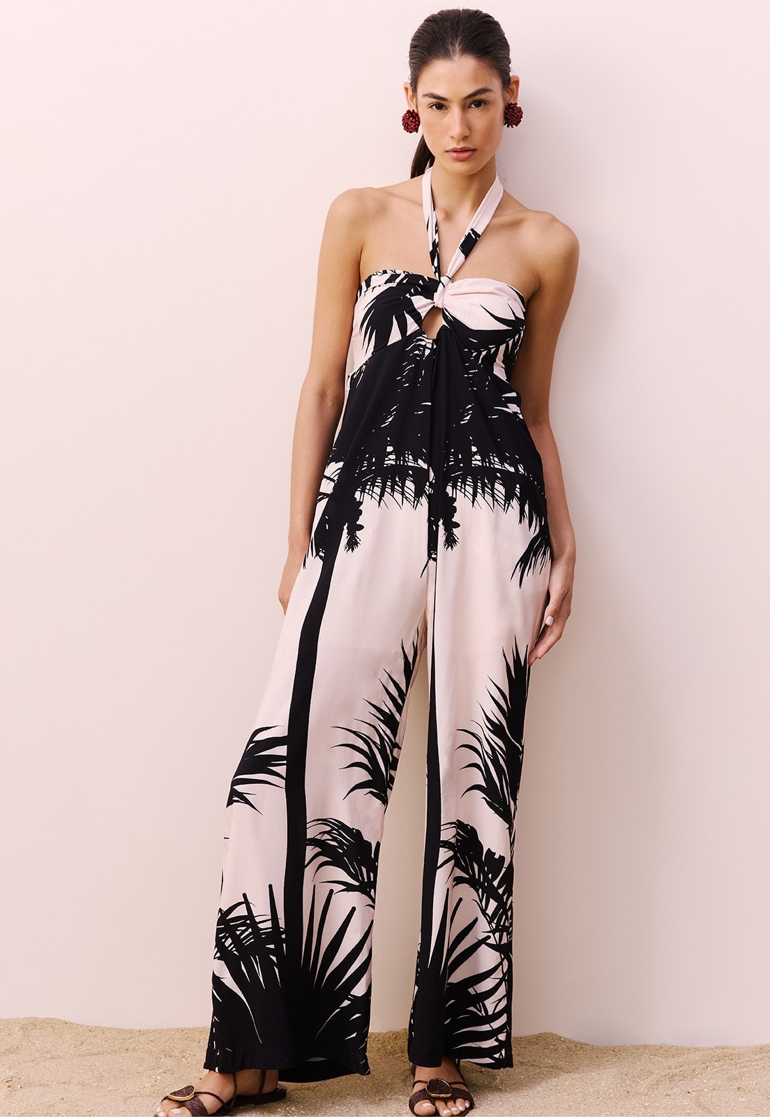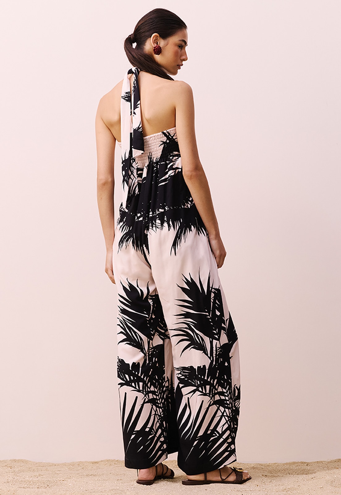 O Macacão Laço Estampado Lago Preto CaCay é a escolha ideal para quem busca sofisticação com leveza. Confeccionado em 100% viscose, seu caimento fluido valoriza a silhueta com conforto e elegância. O design sem alças com amarração no pescoço cria uma abertura sutil no busto, enquanto a modelagem ampla das pernas garante liberdade de movimento e um toque contemporâneo. A estampa de folhas grandes e detalhadas adiciona personalidade à peça, tornando-a versátil para ocasiões que vão do dia à noite.