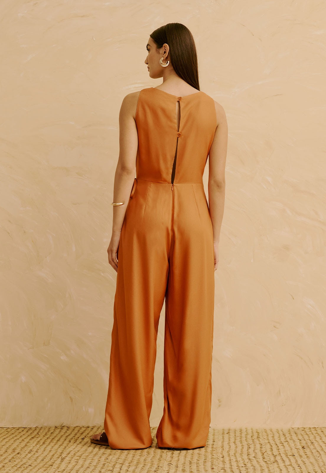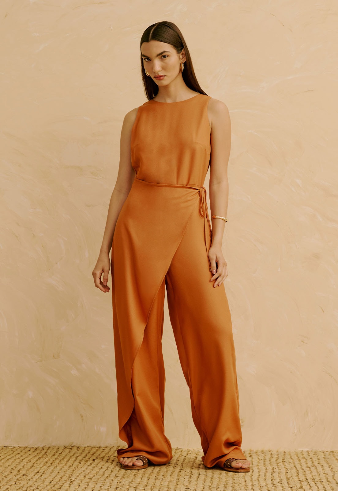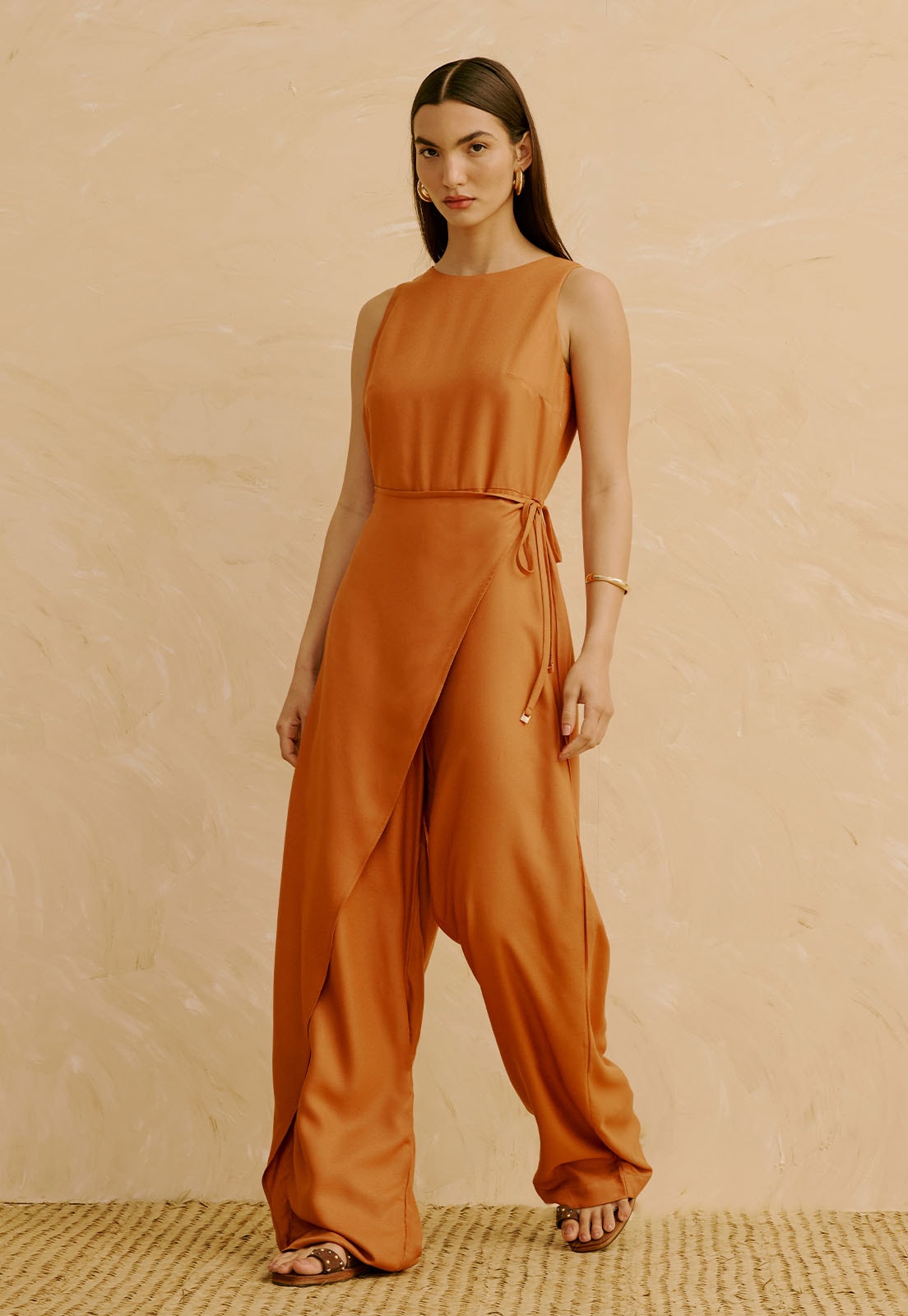 O Macacão Liso com Transpasse na Calça da CaCay tem modelagem sofisticada e ampla, com caimento fluido que valoriza o corpo sem marcar. O busto se acomoda com leveza, a cintura é suavemente ajustada pelo transpasse frontal e o quadril ganha liberdade com a calça e comprimento alongado. A forma é grande, então se estiver em dúvida entre dois tamanhos, sugerimos escolher o menor de acordo com a tabela de medidas. A modelo da foto tem 1,75m, veste manequim 36 e está usando o tamanho P.