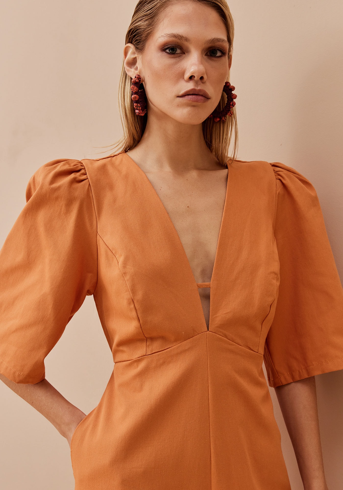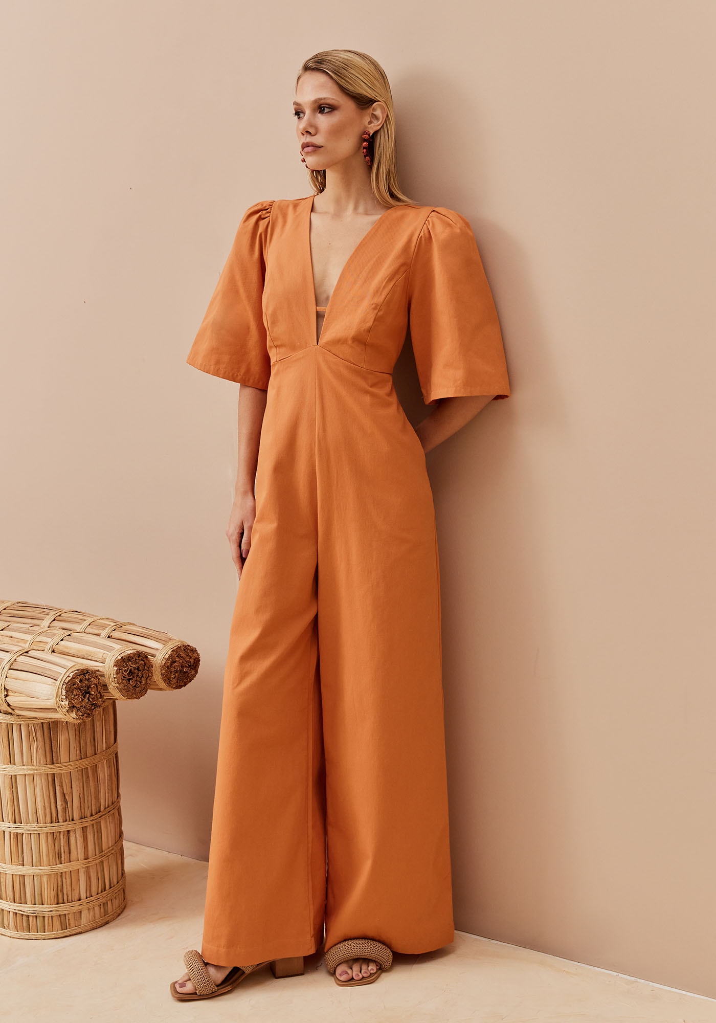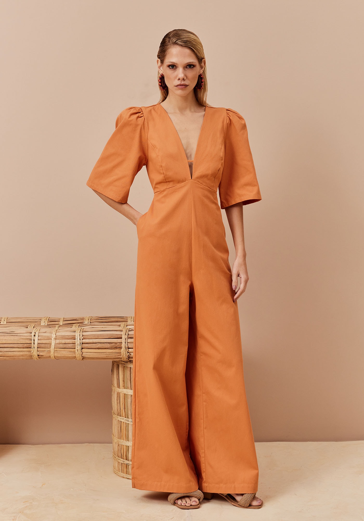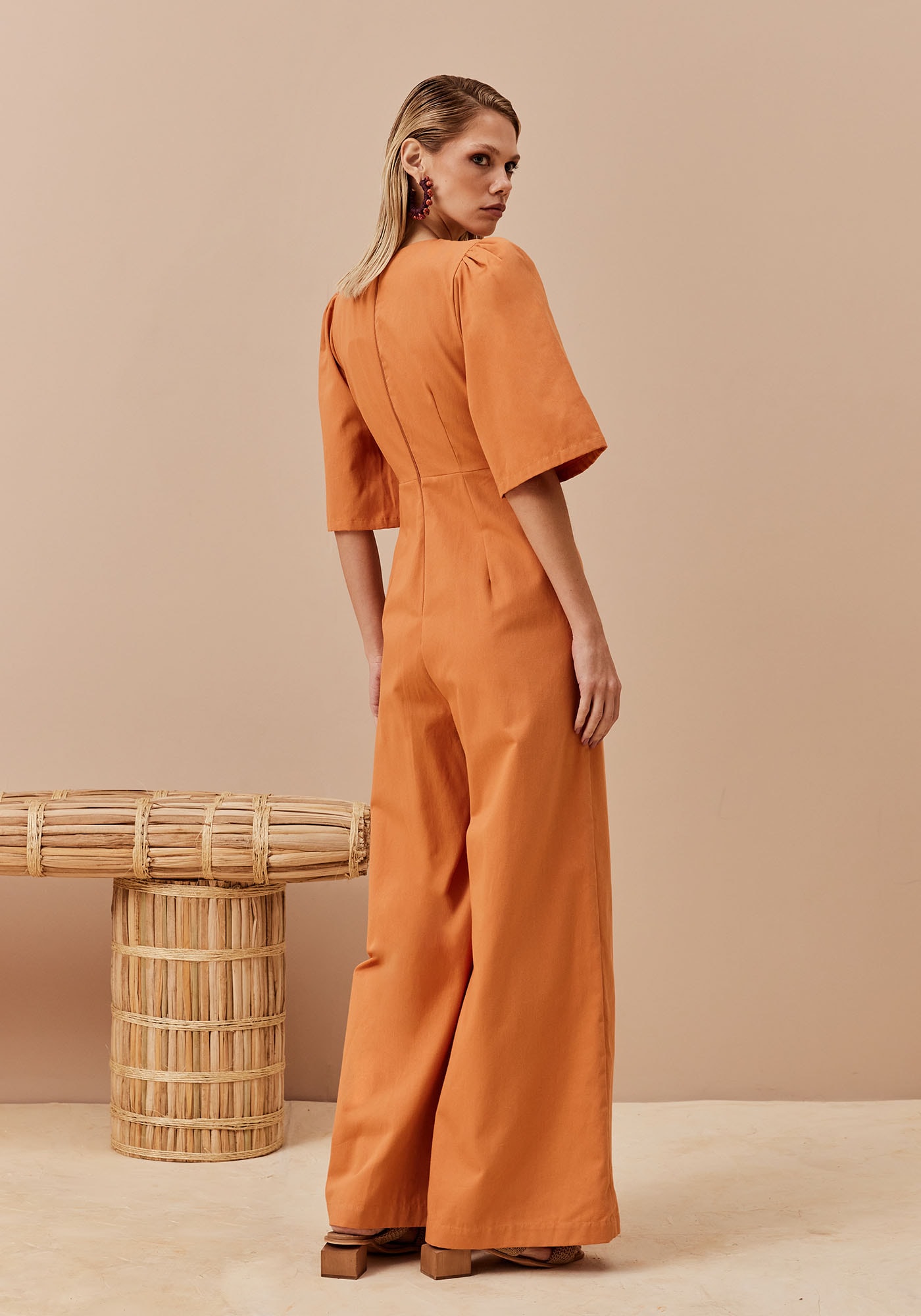 Este macacão é uma peça-chave para quem busca conforto eelegância no mesmo look. Feito em tecido 100% Algodão, garante frescor esuavidade ao longo do dia. O decote profundo em V valoriza o visual, enquantoas mangas presunto e a calça pantalona trazem um toque de sofisticação e estilo.O fechamento com zíper invisível nas costas e os bolsos laterais completam odesign prático e moderno.