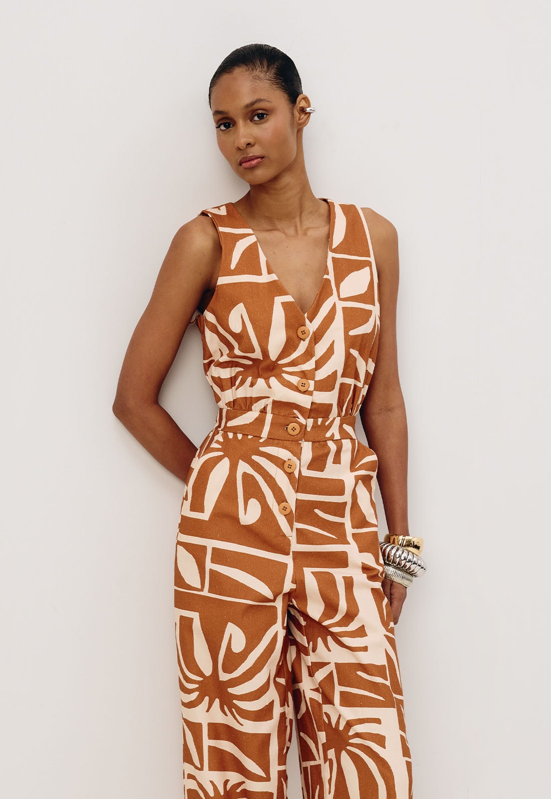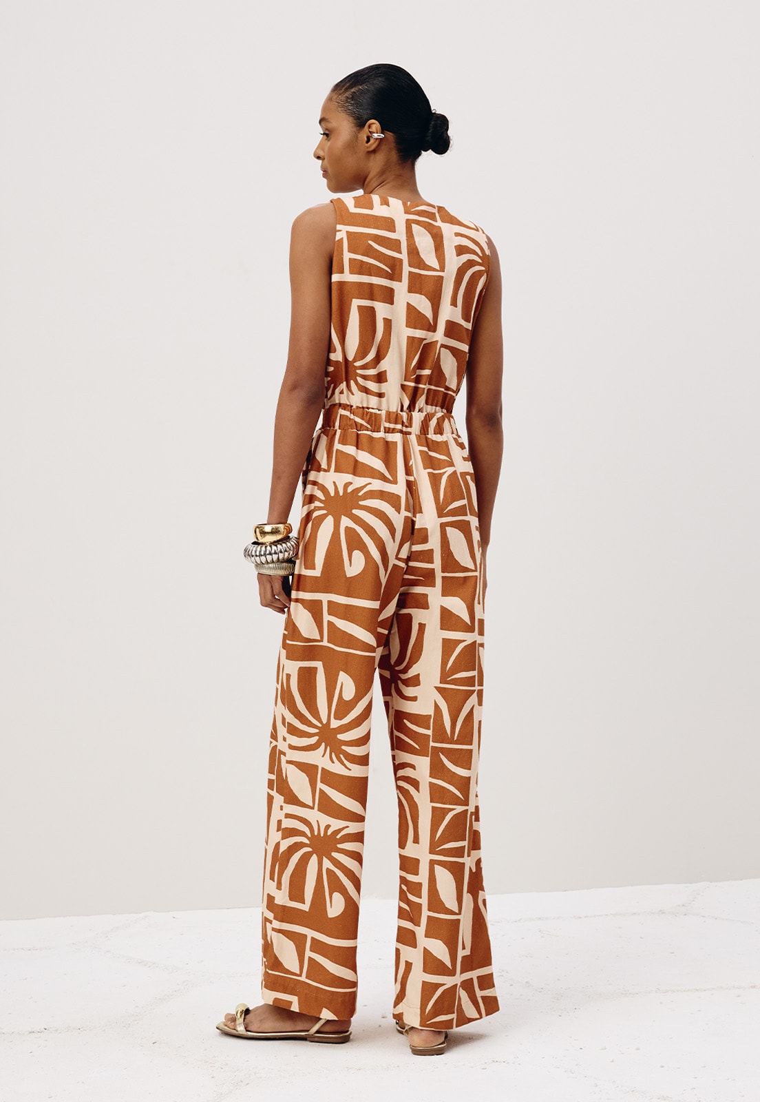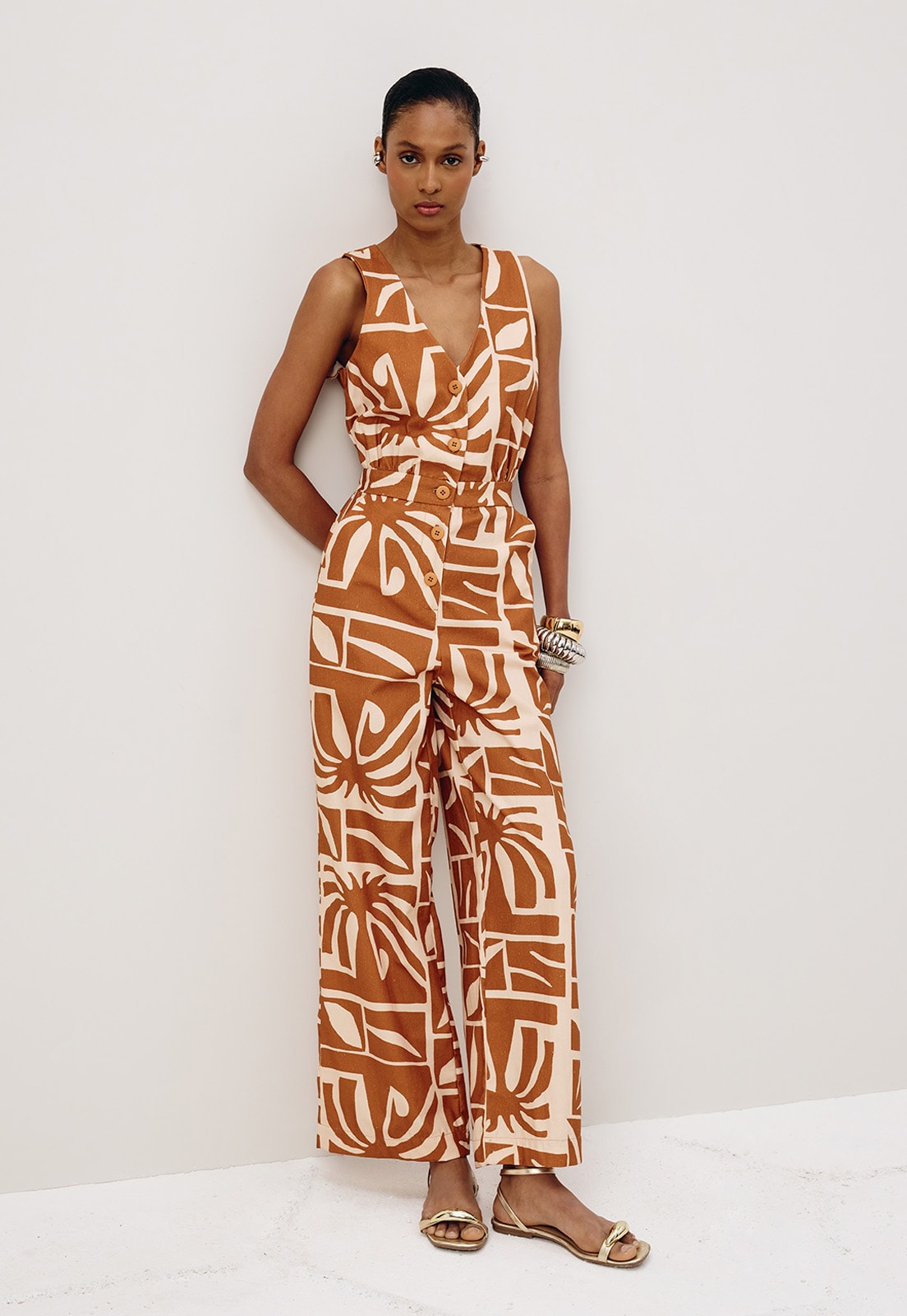 O macacão estampado Reflexo é confeccionado em tecido 100% algodão. O modelo sem manga possui abotoamento na parte da frente e pala na cintura. O elástico na parte de trás facilita a vestibilidade e a adaptação em diferentes tipos de corpos.