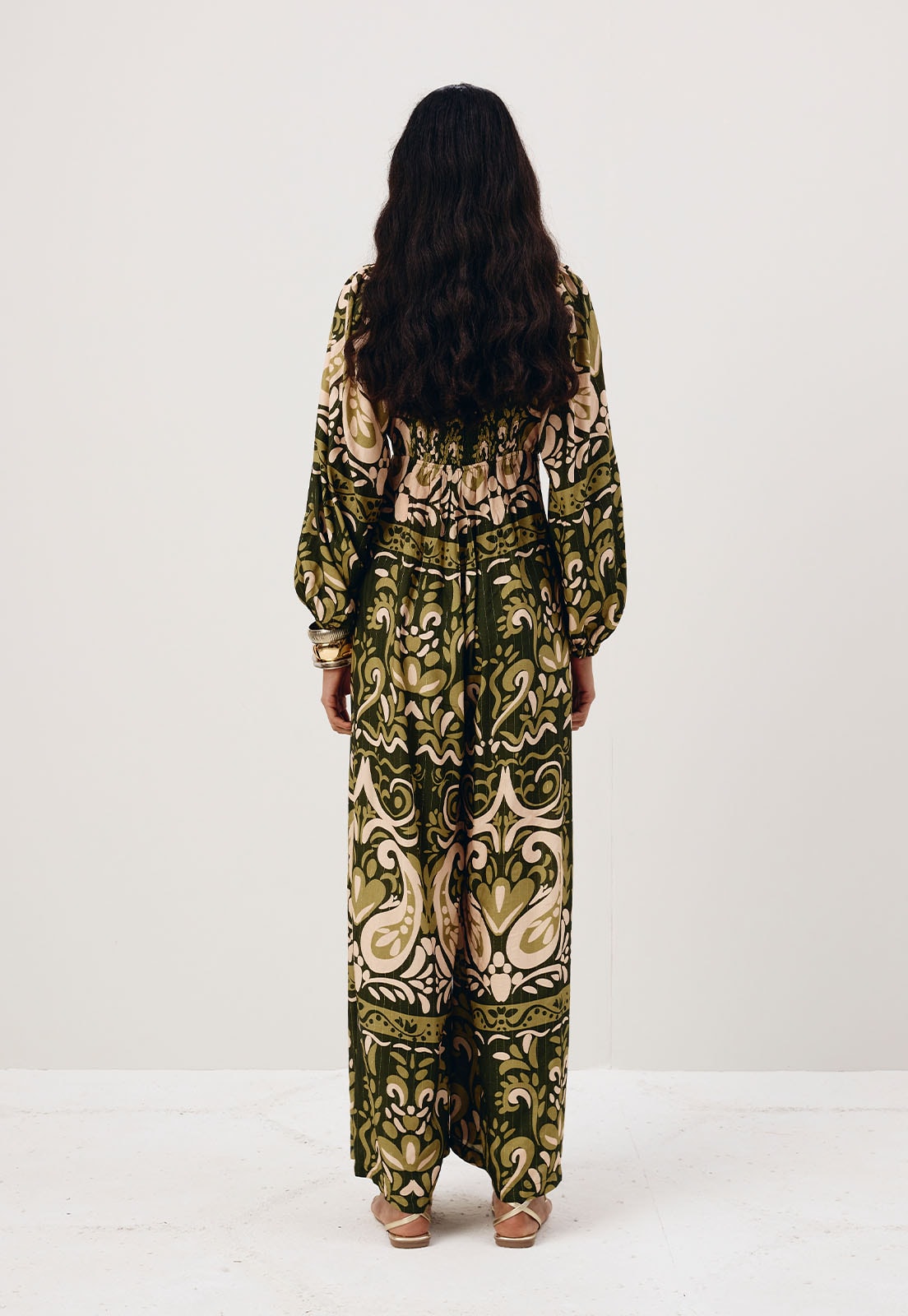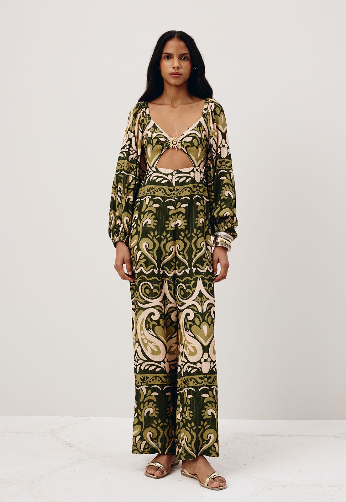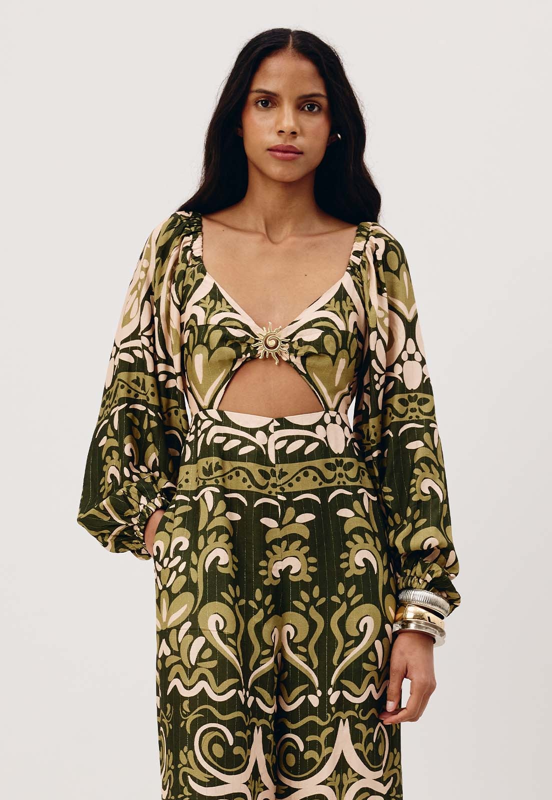 O vestido estampado Nômade é confeccionado em tecido 99% viscose e 1% poliéster. O modelo possui um shape solto e fluído com manga bufante com manga bufante e lastex nas costas. O detalhe principal é o recorte na parte da frente com passador belíssimo no formato de sol.