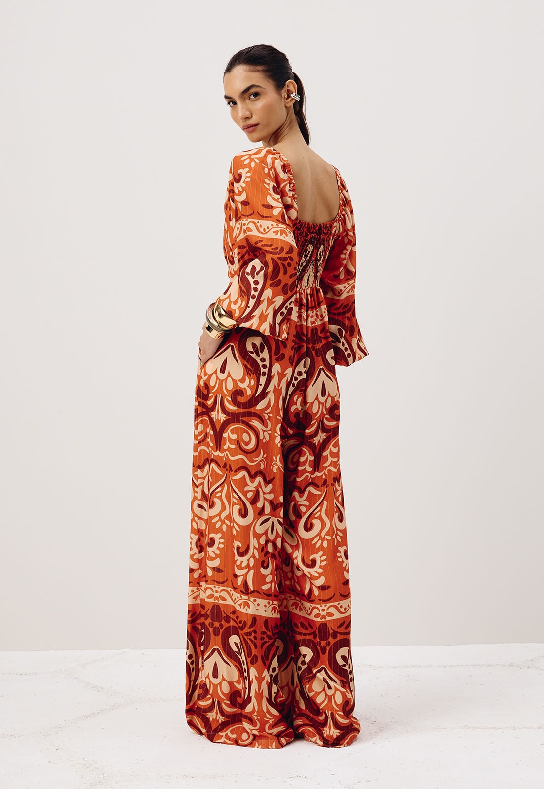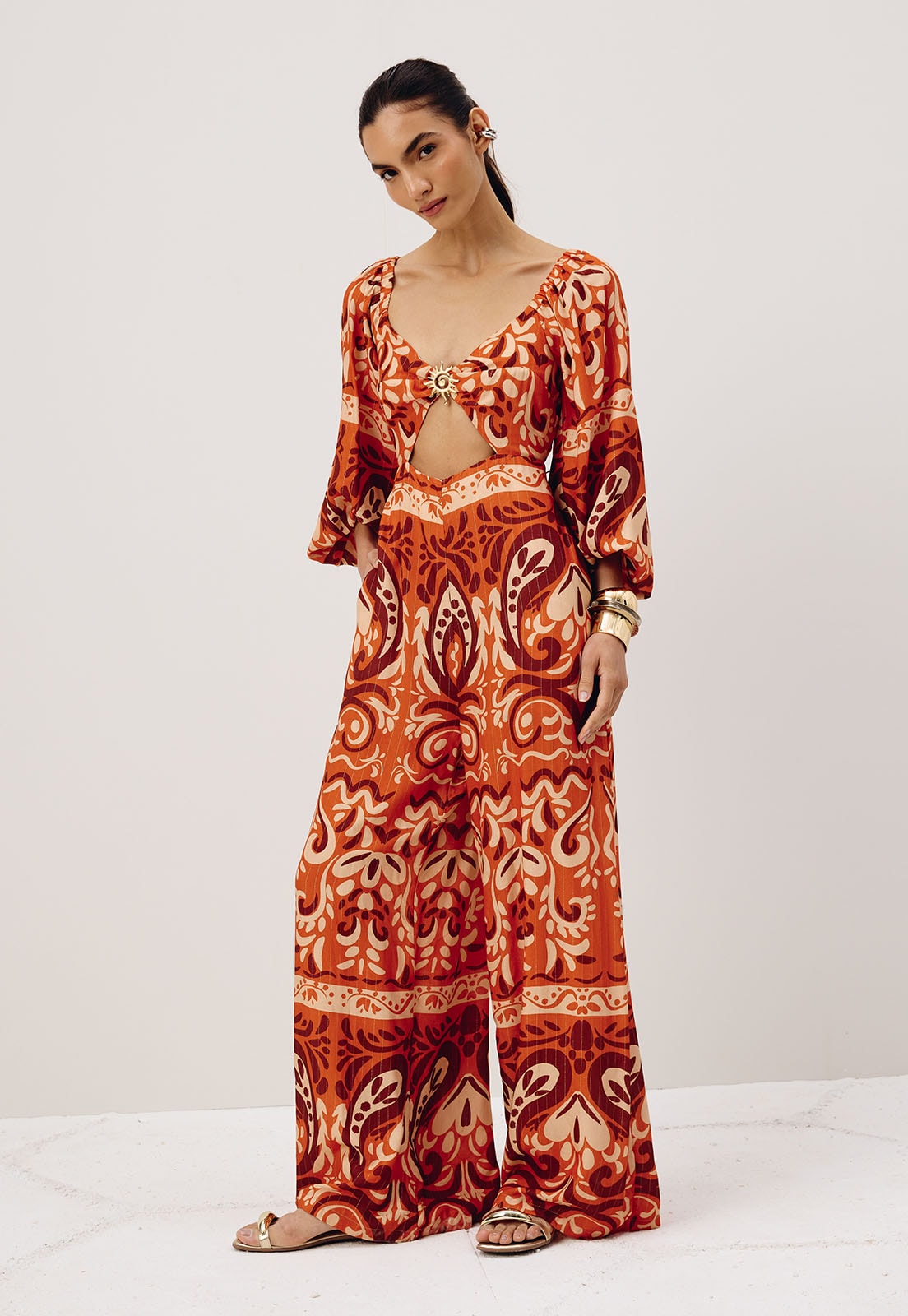 O vestido estampado Nômade é confeccionado em tecido 99% viscose e 1% poliéster. O modelo possui um shape solto e fluído com manga bufante com manga bufante e lastex nas costas. O detalhe principal é o recorte na parte da frente com passador belíssimo no formato de sol.
