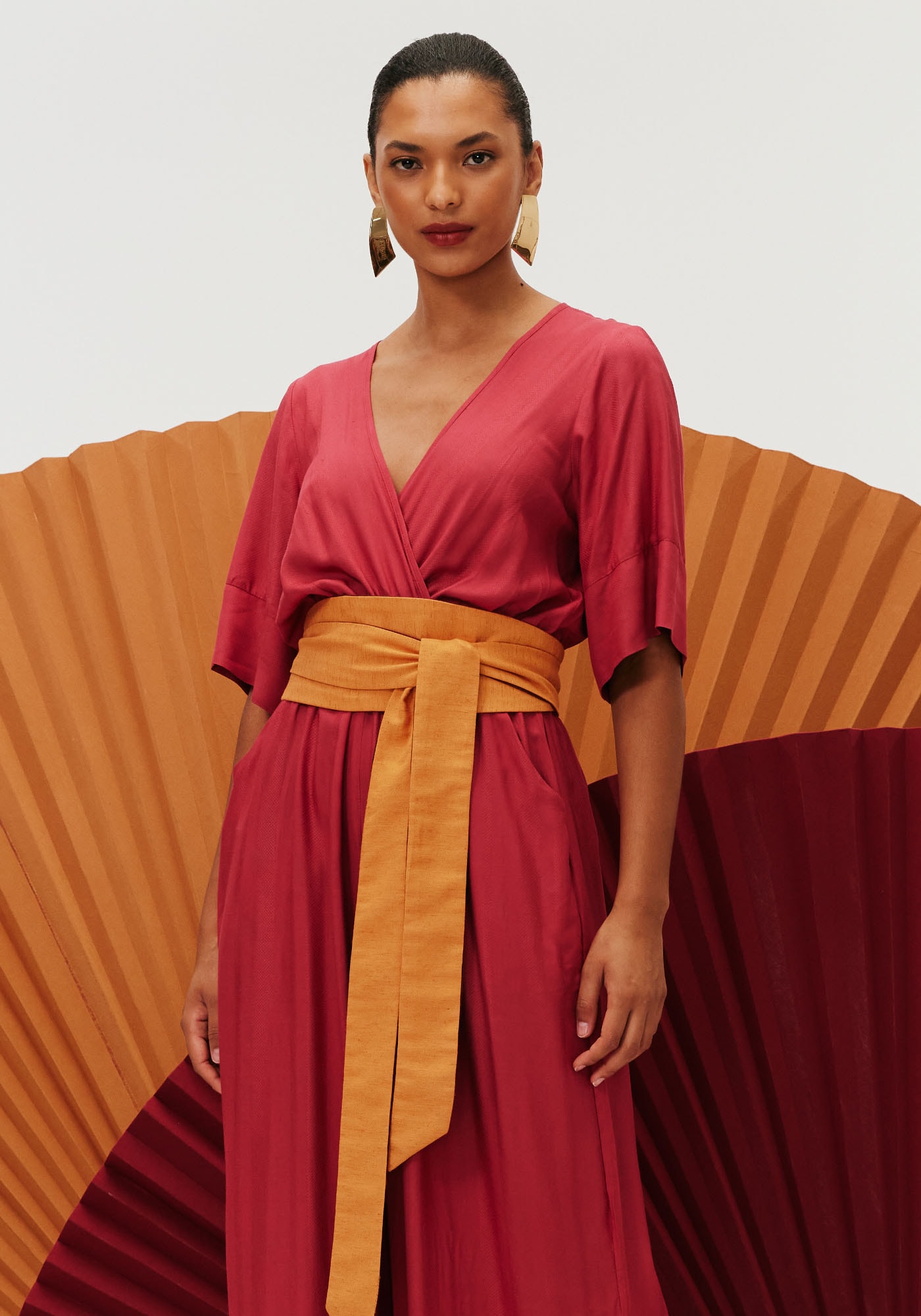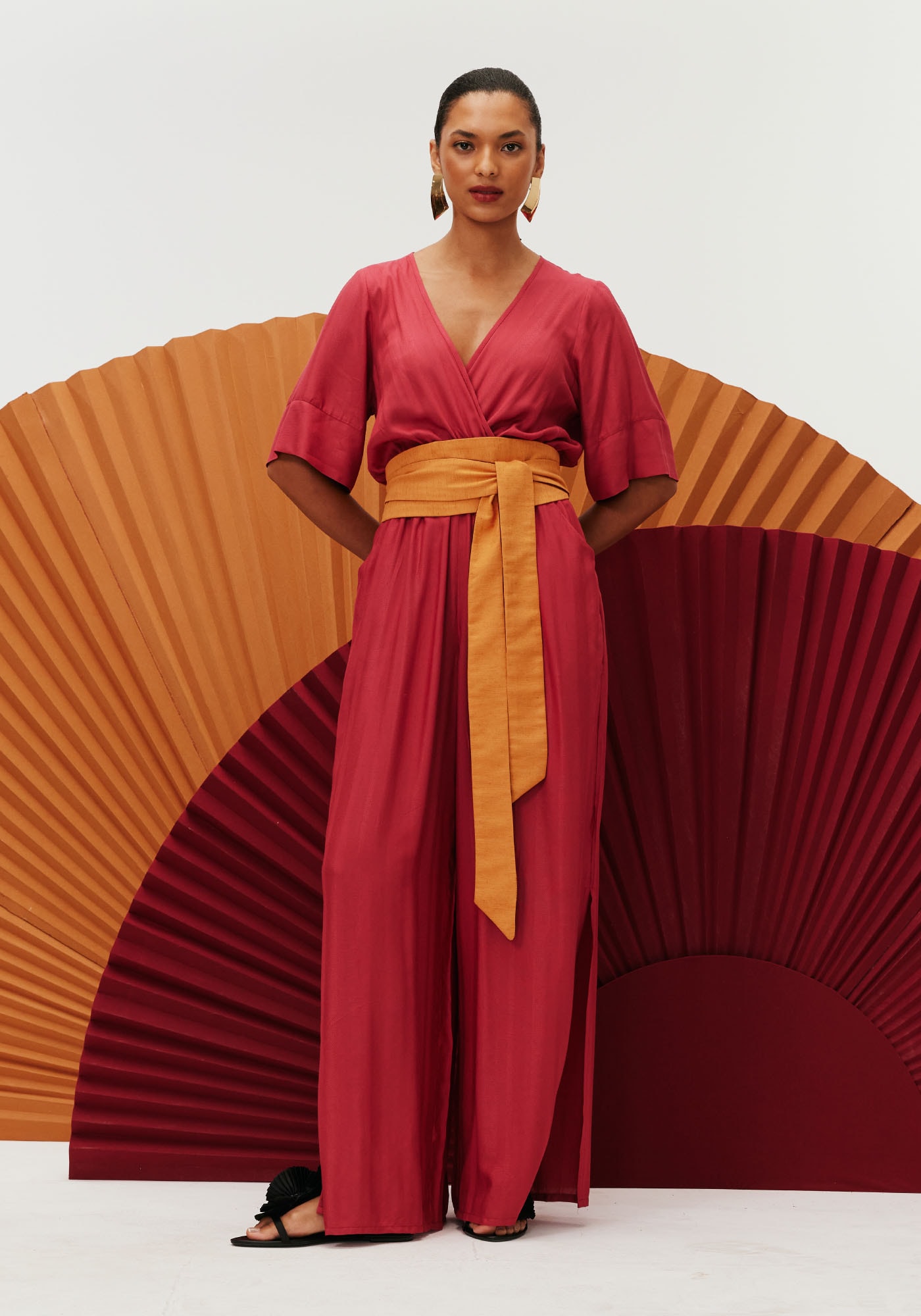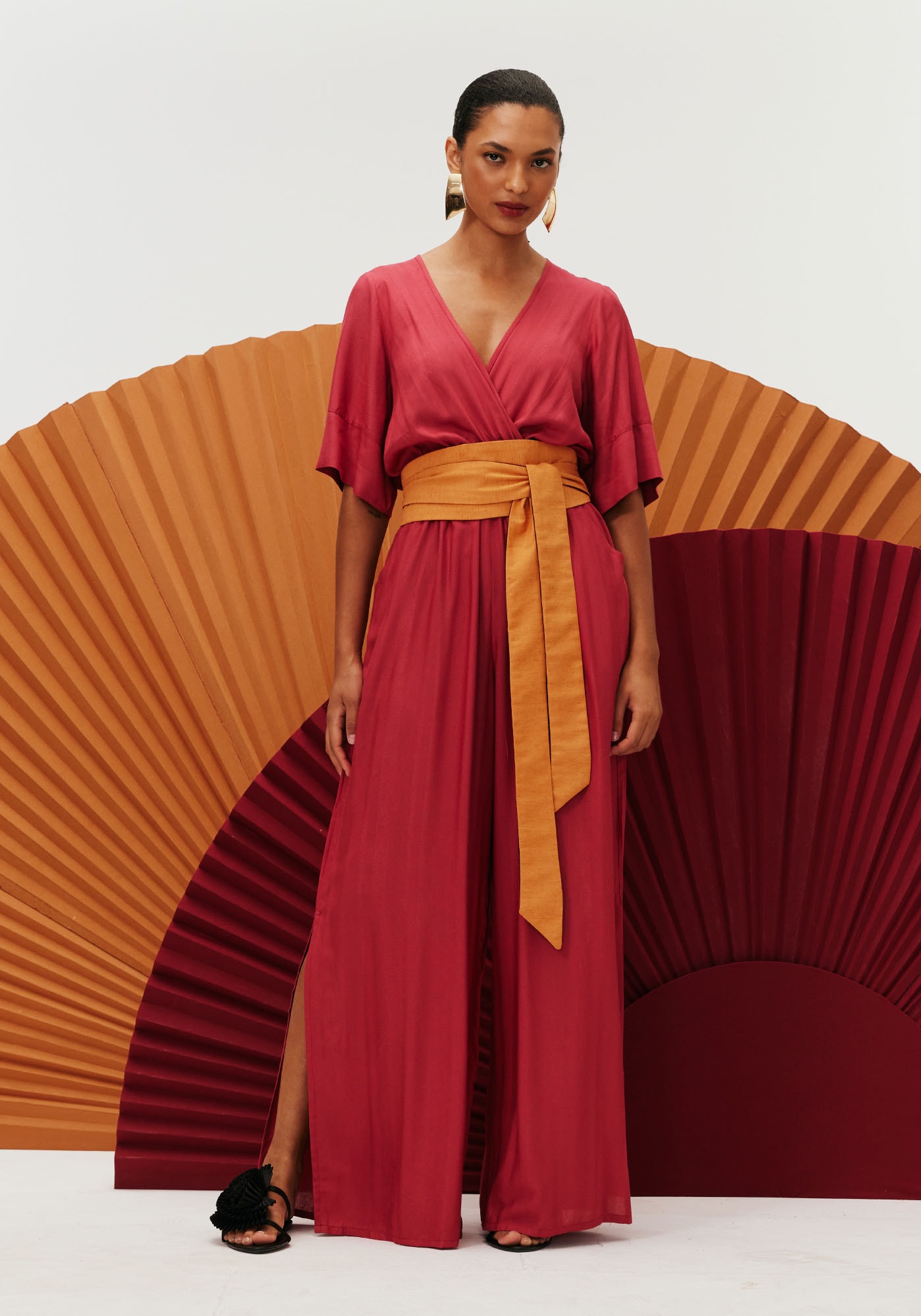 Esse belíssimo macacãoé confeccionado em tecido 97% viscose e 3% linho. Com decote cruzado e manga 3/4,o modelo possui bolso em faca e calça ampla com fendas laterais, detalhe esse quegarante movimento e fluidez para a peça.